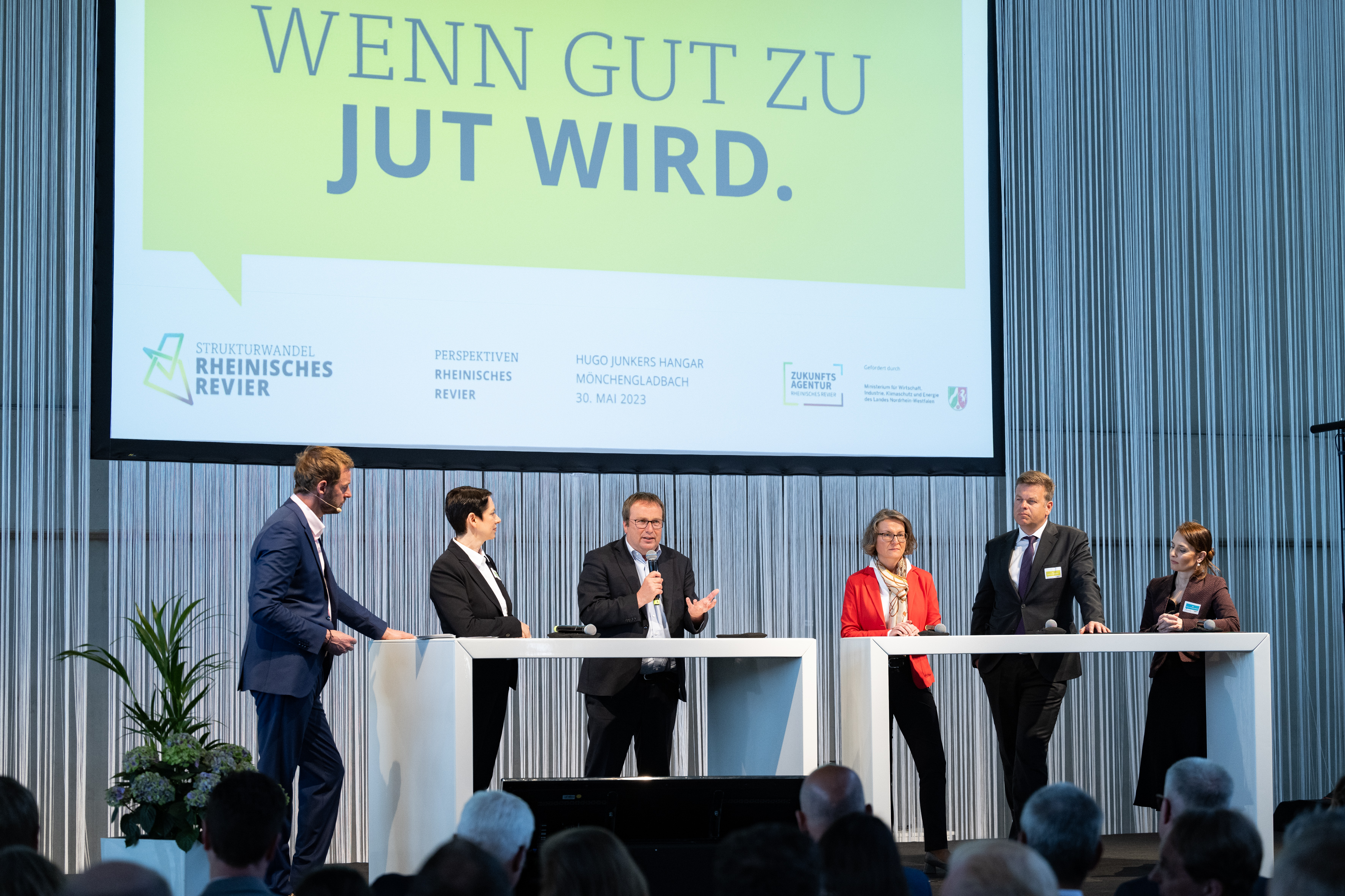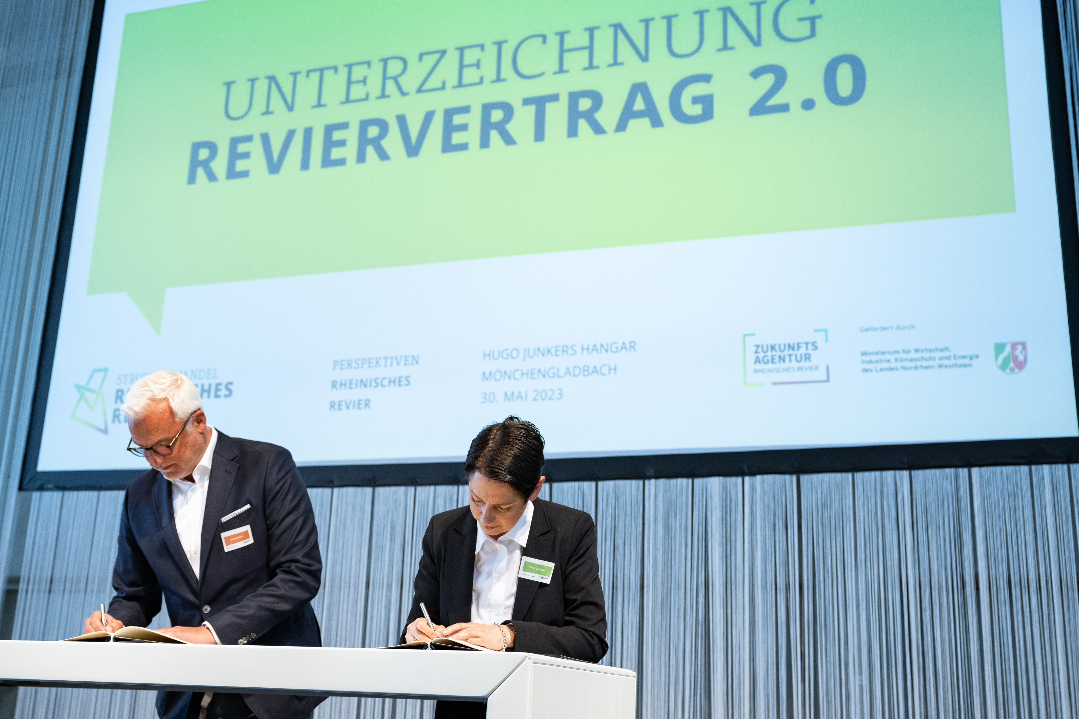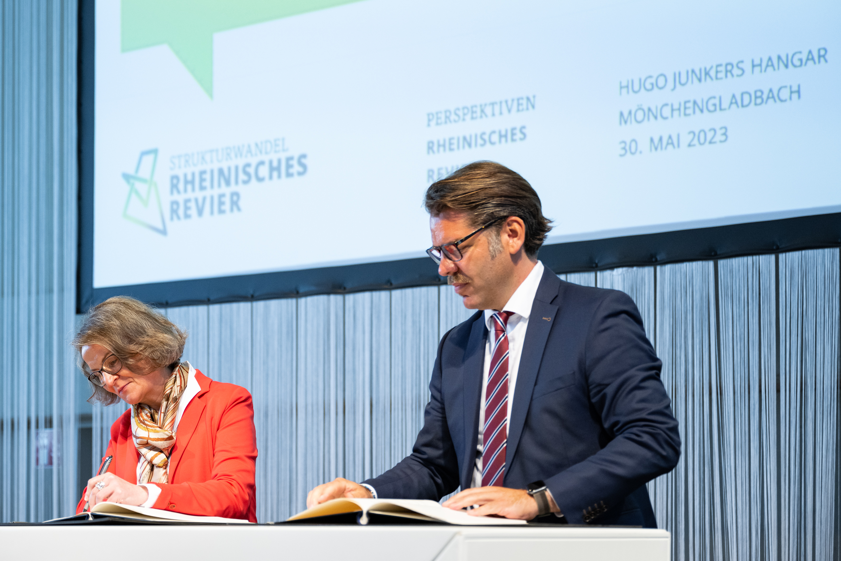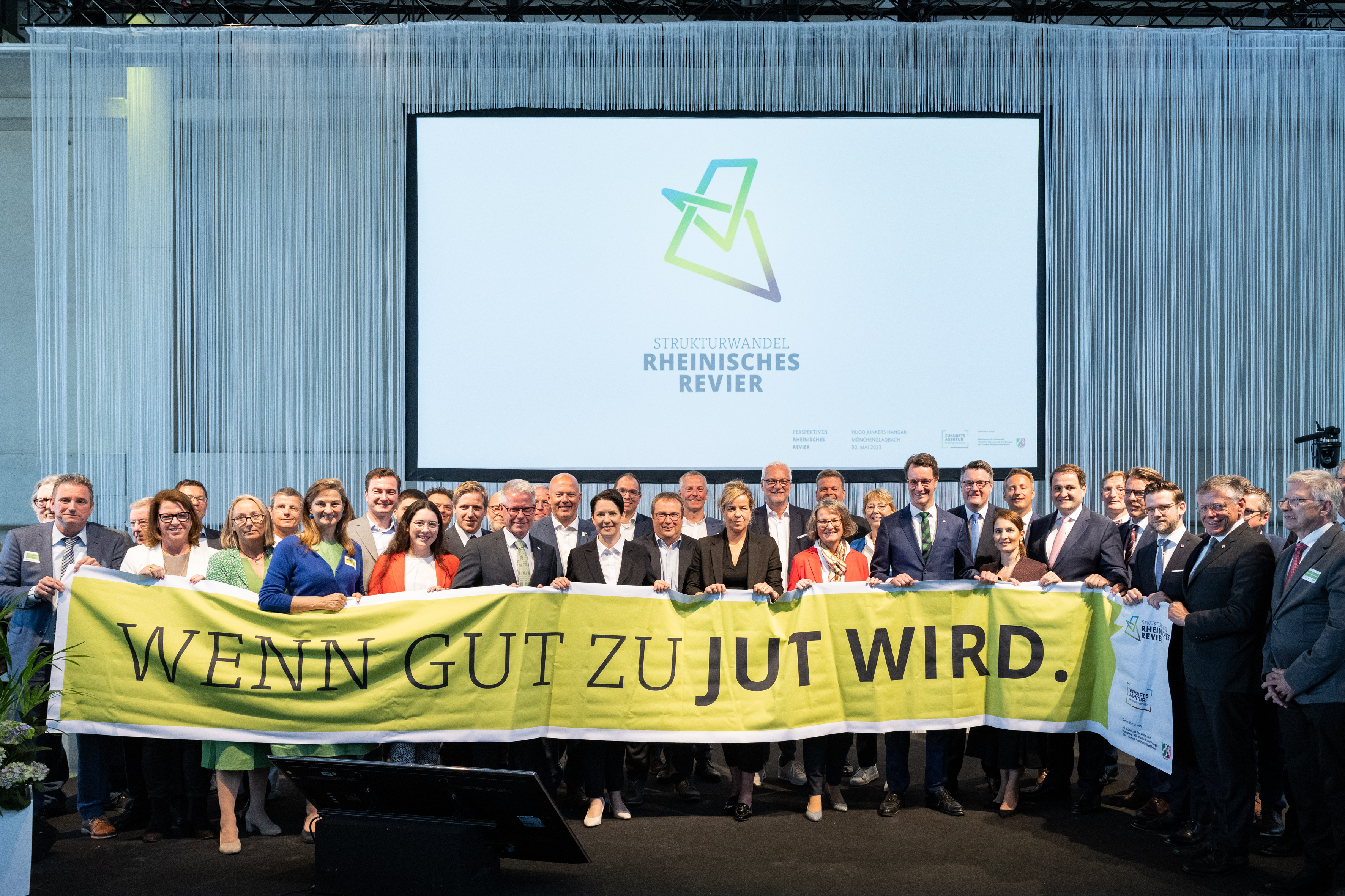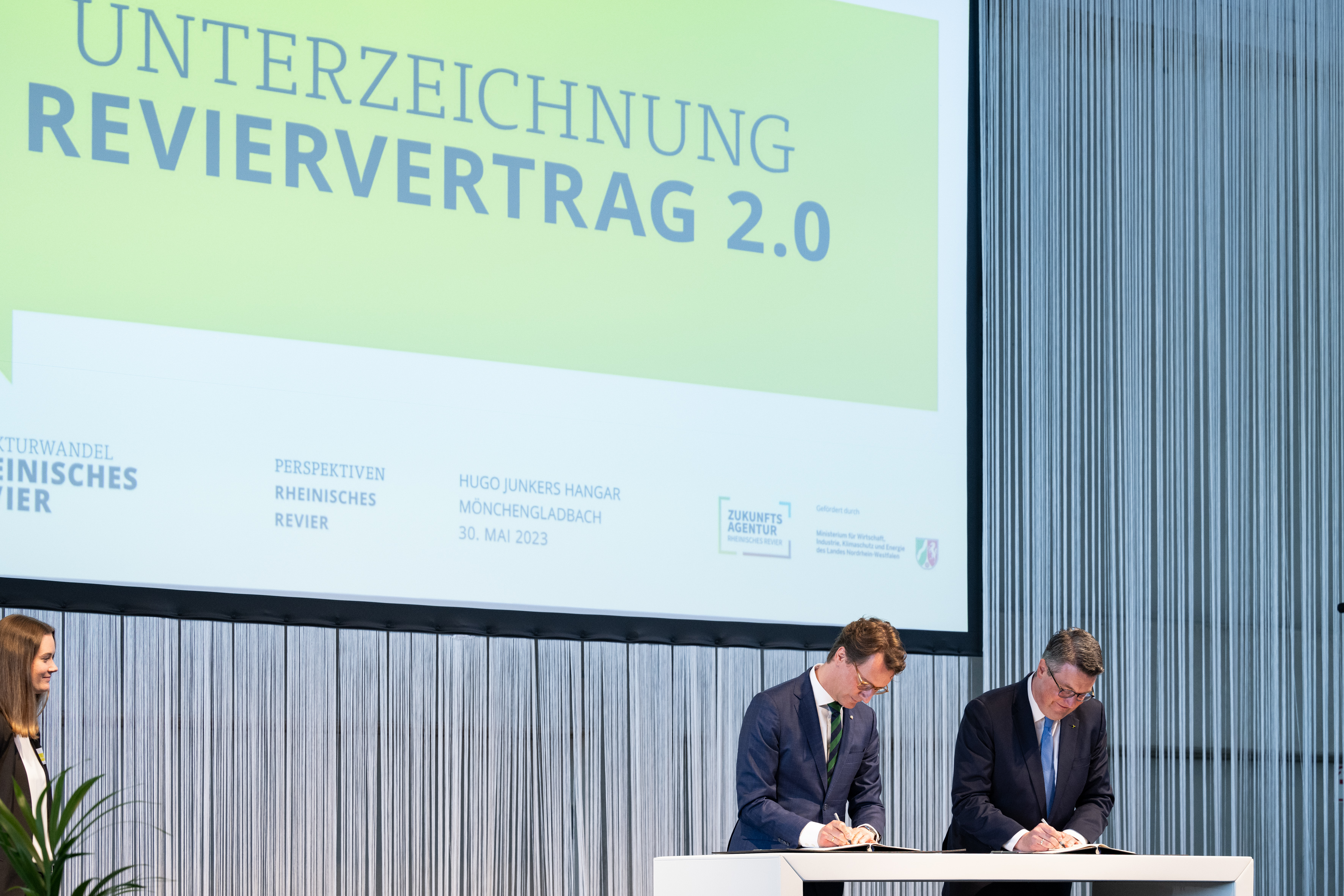 Der Einladung der Zukunftsagentur Rheinisches Revier zur Veranstaltung „Perspektiven Rheinisches Revier“ und zur Vertragsunterzeichnung am Hugo Junkers Hangar in Mönchengladbach folgten neben Ministerpräsident Hendrik Wüst und der stellvertretenden Ministerpräsidentin und Wirtschaftsministerin Mona Neubaur unter anderem Ministerin für Landwirtschaft und Verbraucherschutz Silke Gorißen, Minister für Umwelt, Naturschutz und Verkehr Oliver Krischer, Ministerin für Heimat, Kommunales, Bau und Digitalisierung Ina Scharrenbach, Minister für Bundes- und Europaangelegenheiten, Internationales sowie Medien und Chef der Staatskanzlei Nathanael Liminski sowie viele Industrie- und Handelskammern, Vertreterinnen und Vertreter der Anrainerkommunen, die Gesellschafterversammlung und weitere am Strukturwandel Beteiligte. Bundeswirtschaftsminister Robert Habeck wurde per Videoübertragung zugeschaltet.