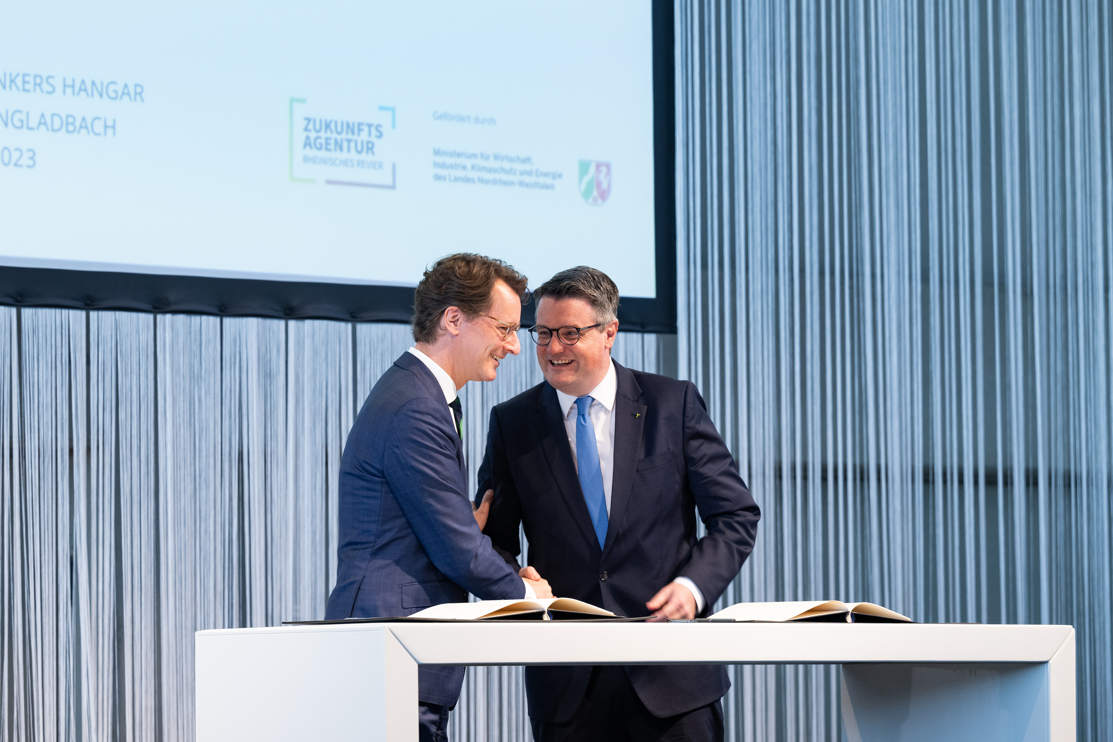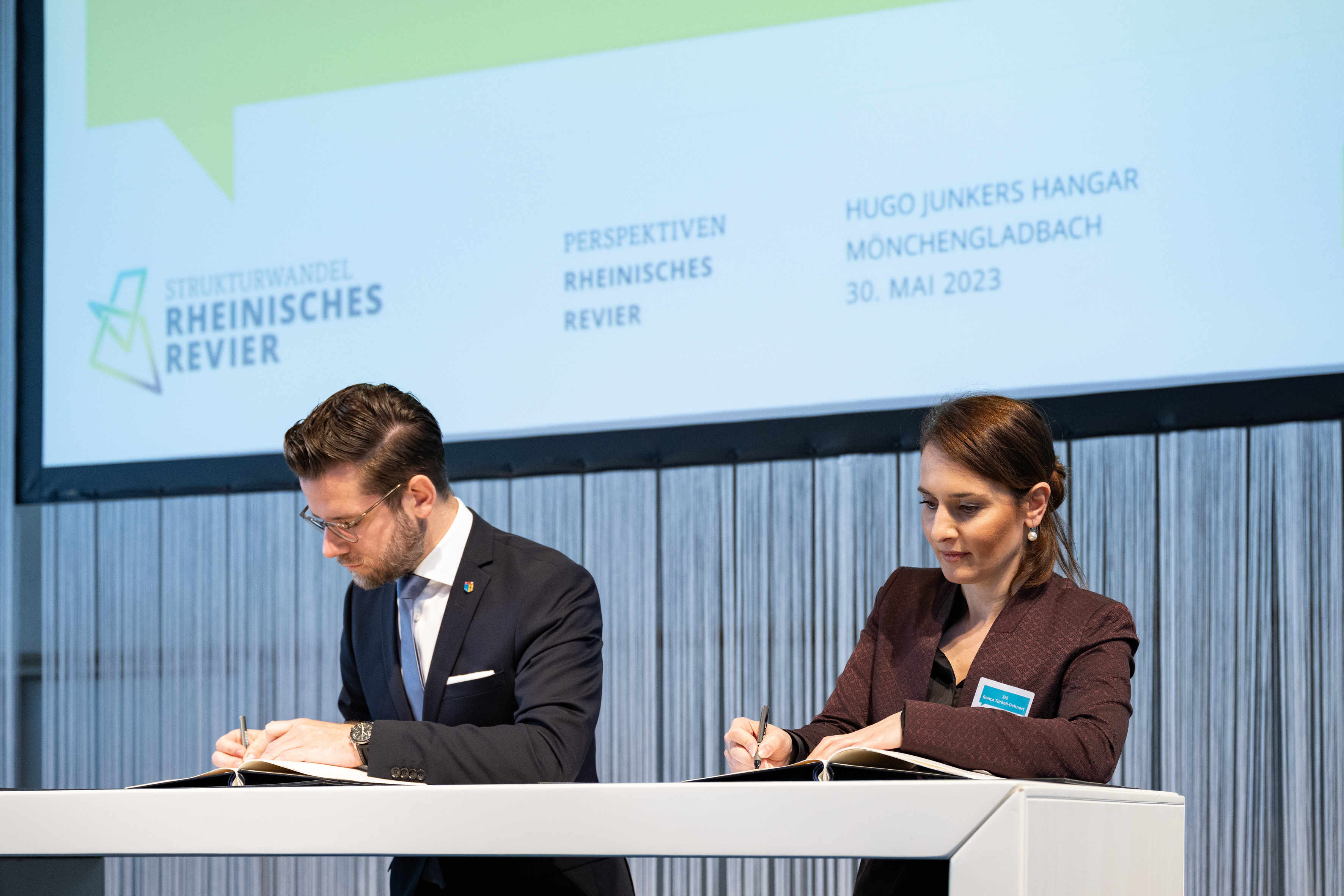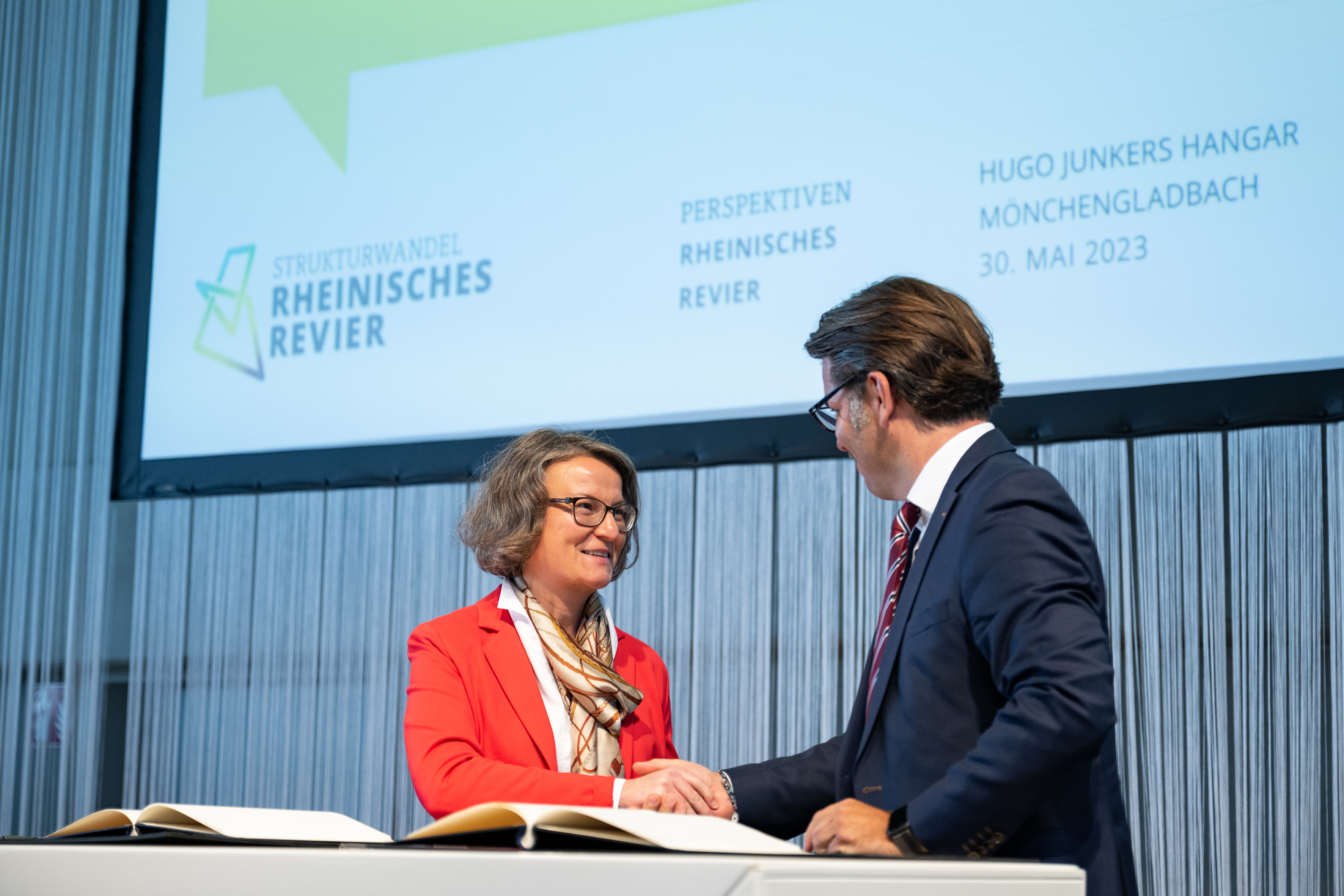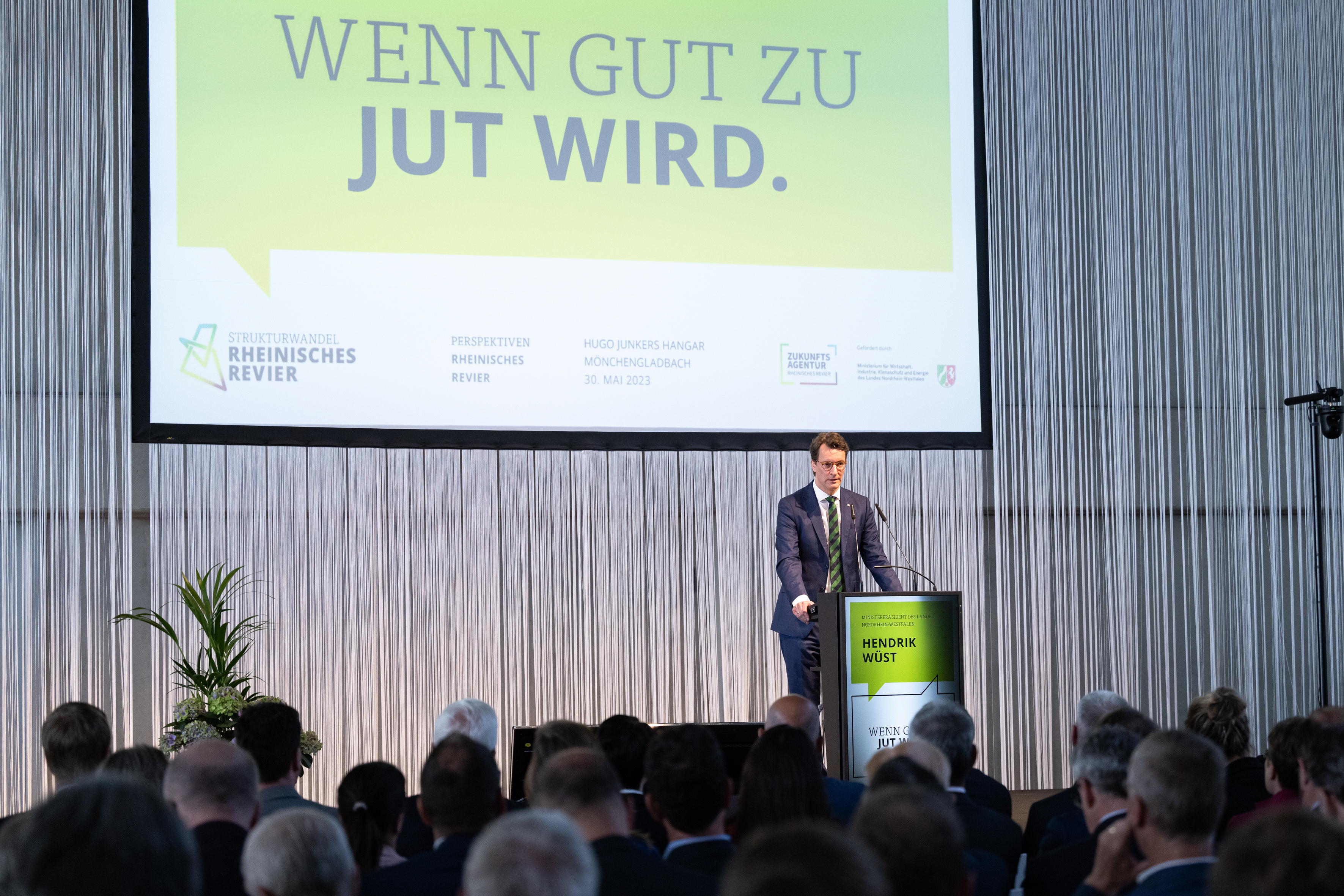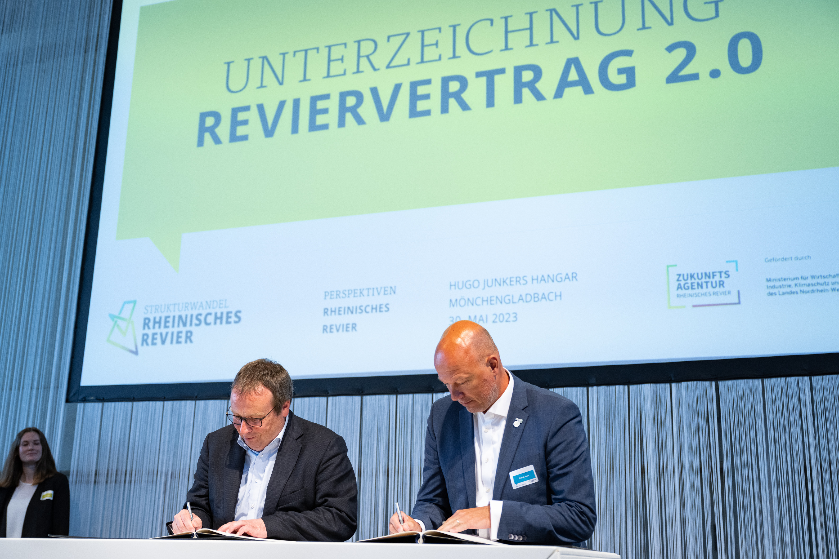 Der Einladung der Zukunftsagentur Rheinisches Revier zur Veranstaltung „Perspektiven Rheinisches Revier“ und zur Vertragsunterzeichnung am Hugo Junkers Hangar in Mönchengladbach folgten neben Ministerpräsident Hendrik Wüst und der stellvertretenden Ministerpräsidentin und Wirtschaftsministerin Mona Neubaur unter anderem Ministerin für Landwirtschaft und Verbraucherschutz Silke Gorißen, Minister für Umwelt, Naturschutz und Verkehr Oliver Krischer, Ministerin für Heimat, Kommunales, Bau und Digitalisierung Ina Scharrenbach, Minister für Bundes- und Europaangelegenheiten, Internationales sowie Medien und Chef der Staatskanzlei Nathanael Liminski sowie viele Industrie- und Handelskammern, Vertreterinnen und Vertreter der Anrainerkommunen, die Gesellschafterversammlung und weitere am Strukturwandel Beteiligte. Bundeswirtschaftsminister Robert Habeck wurde per Videoübertragung zugeschaltet.