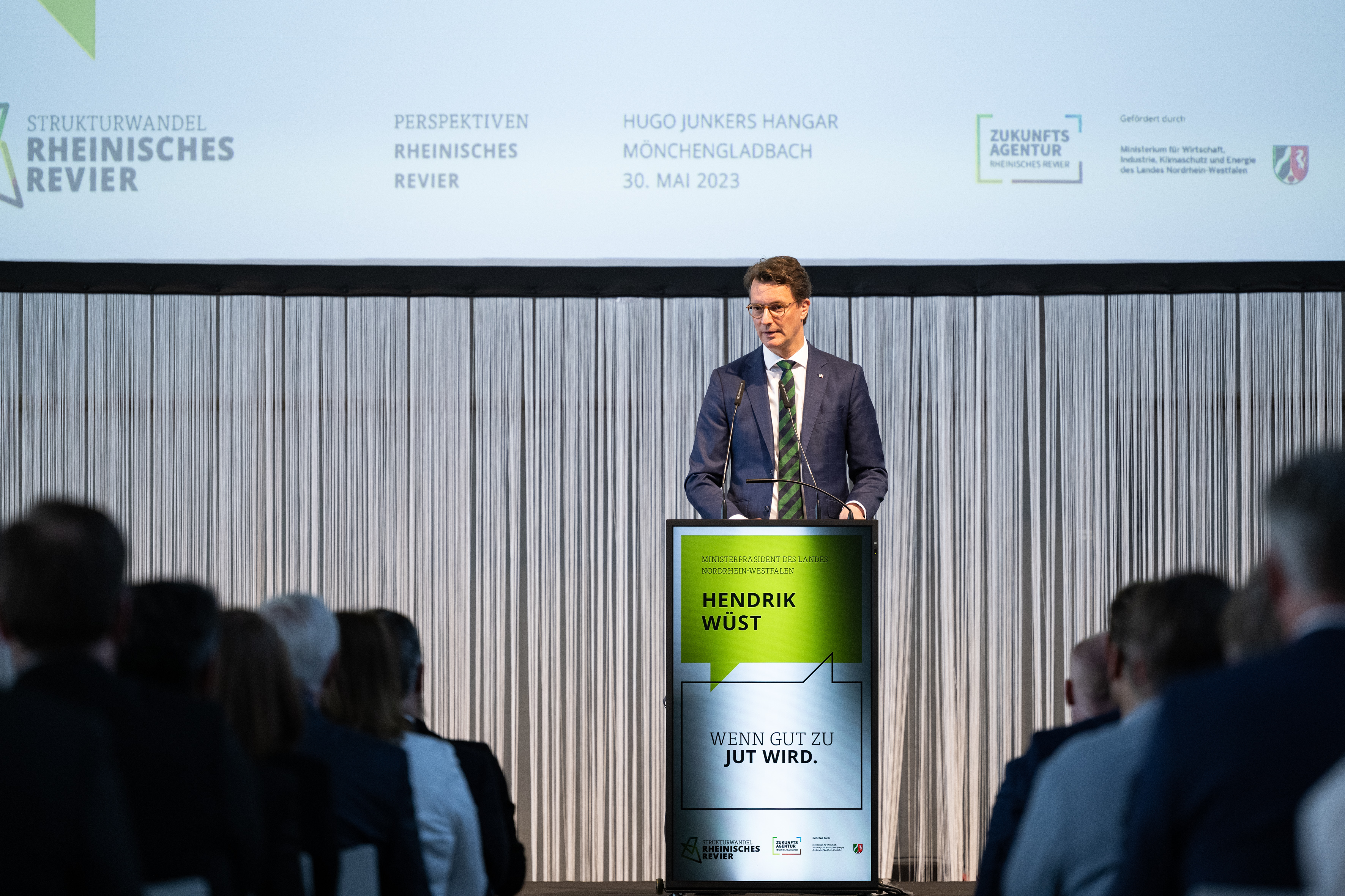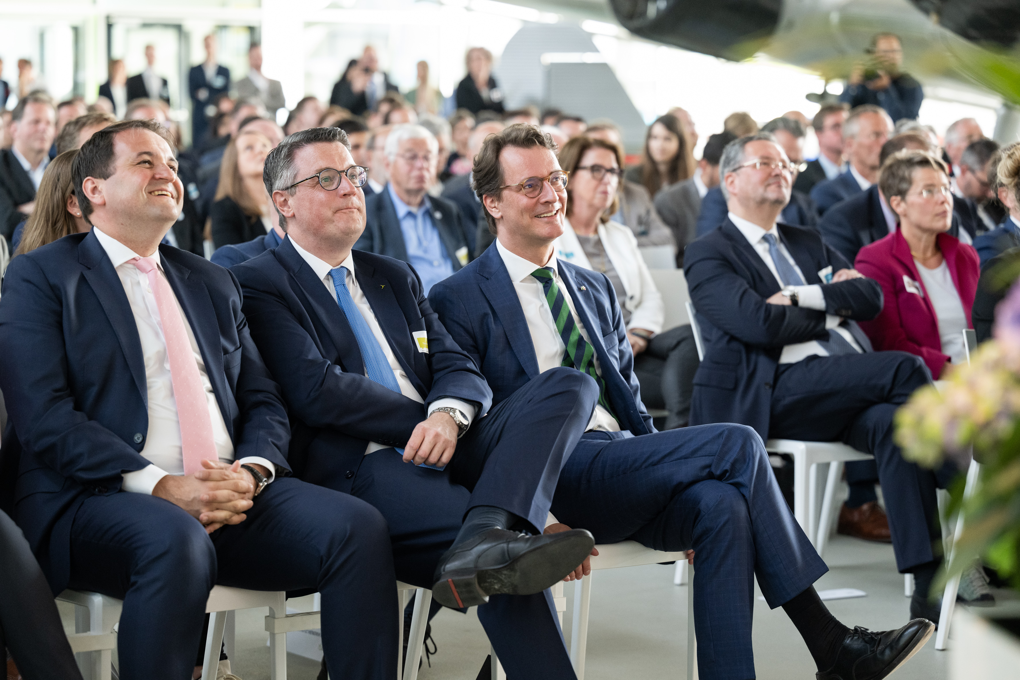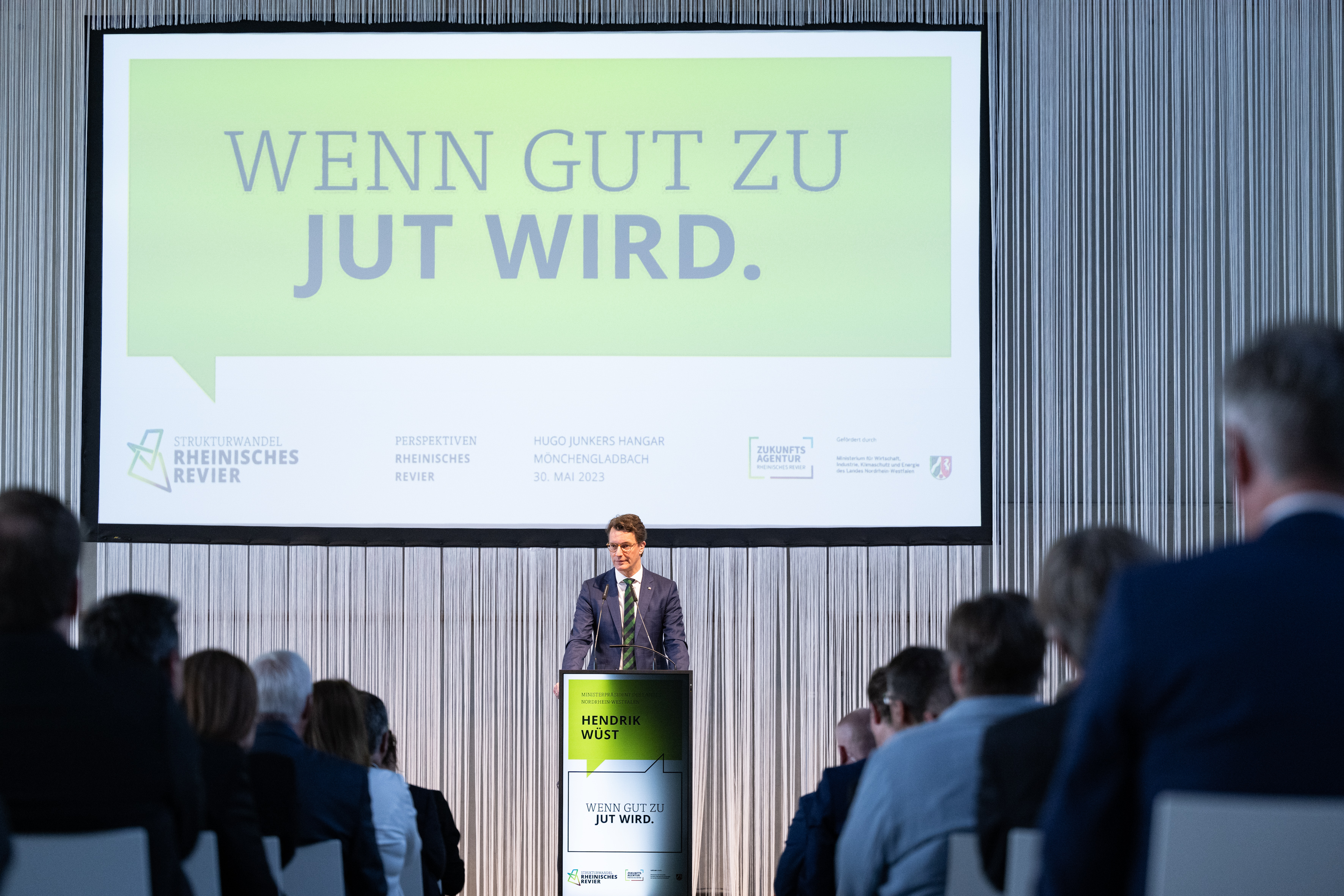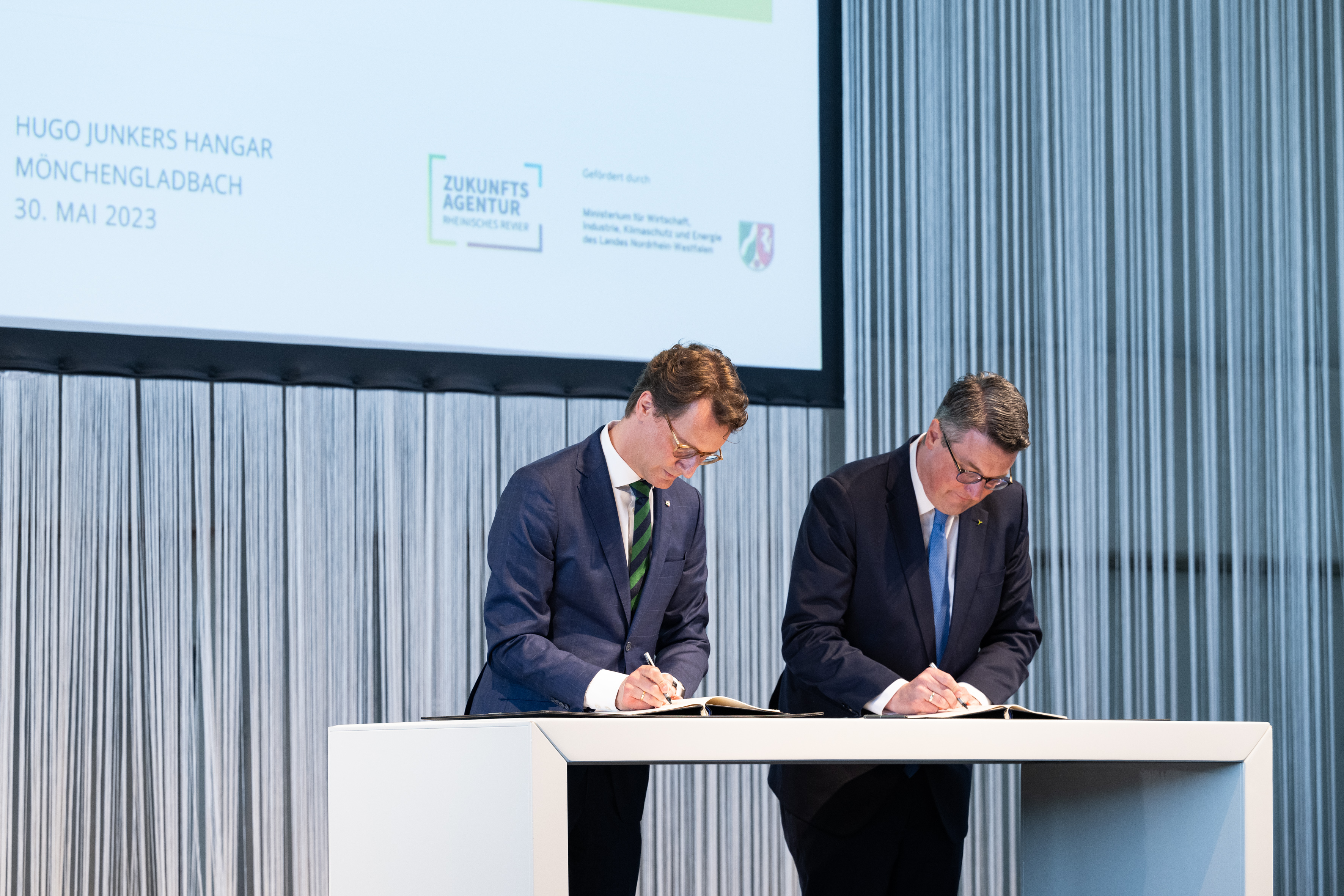Der Einladung der Zukunftsagentur Rheinisches Revier zur Veranstaltung „Perspektiven Rheinisches Revier“ und zur Vertragsunterzeichnung am Hugo Junkers Hangar in Mönchengladbach folgten neben Ministerpräsident Hendrik Wüst und der stellvertretenden Ministerpräsidentin und Wirtschaftsministerin Mona Neubaur unter anderem Ministerin für Landwirtschaft und Verbraucherschutz Silke Gorißen, Minister für Umwelt, Naturschutz und Verkehr Oliver Krischer, Ministerin für Heimat, Kommunales, Bau und Digitalisierung Ina Scharrenbach, Minister für Bundes- und Europaangelegenheiten, Internationales sowie Medien und Chef der Staatskanzlei Nathanael Liminski sowie viele Industrie- und Handelskammern, Vertreterinnen und Vertreter der Anrainerkommunen, die Gesellschafterversammlung und weitere am Strukturwandel Beteiligte. Bundeswirtschaftsminister Robert Habeck wurde per Videoübertragung zugeschaltet.