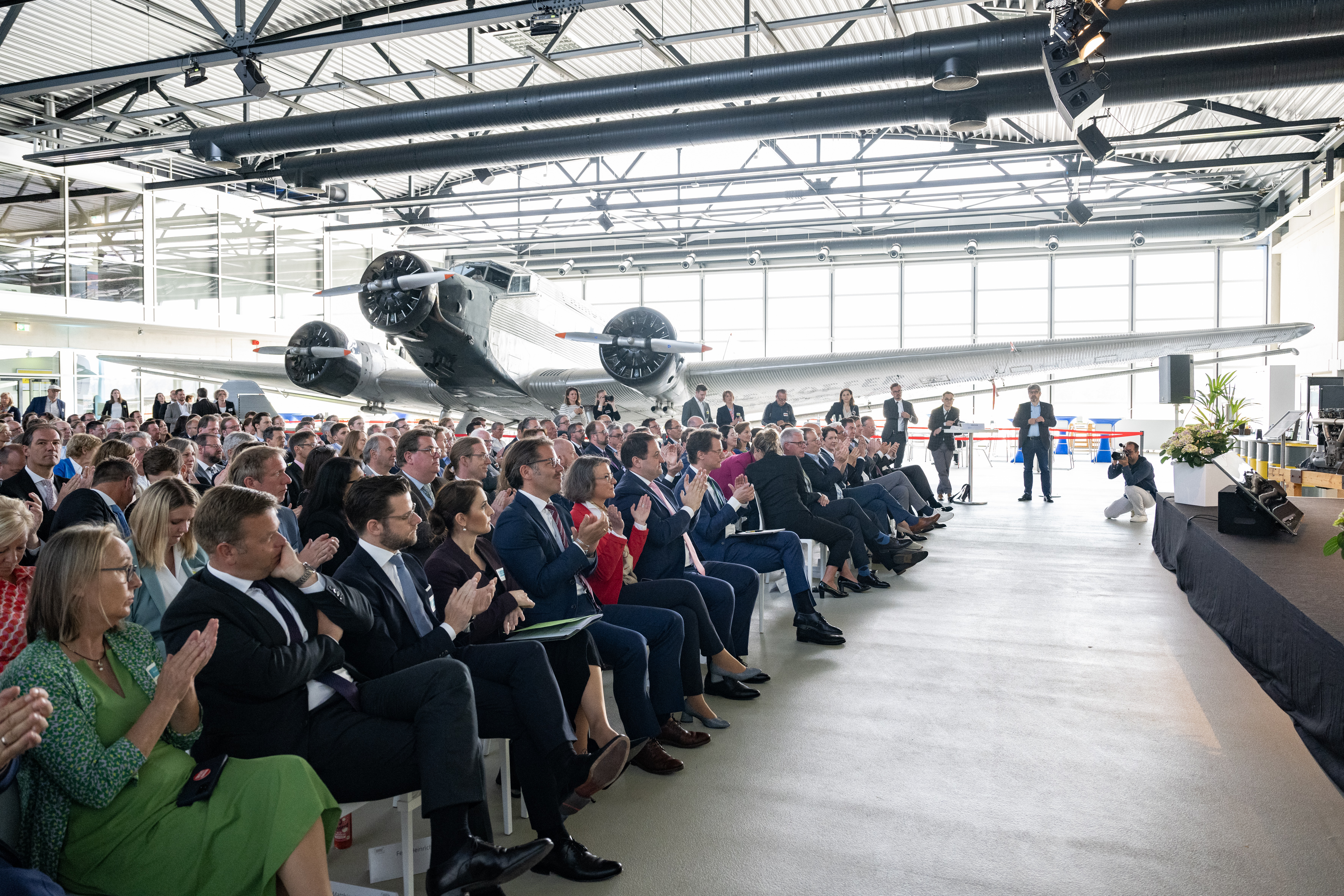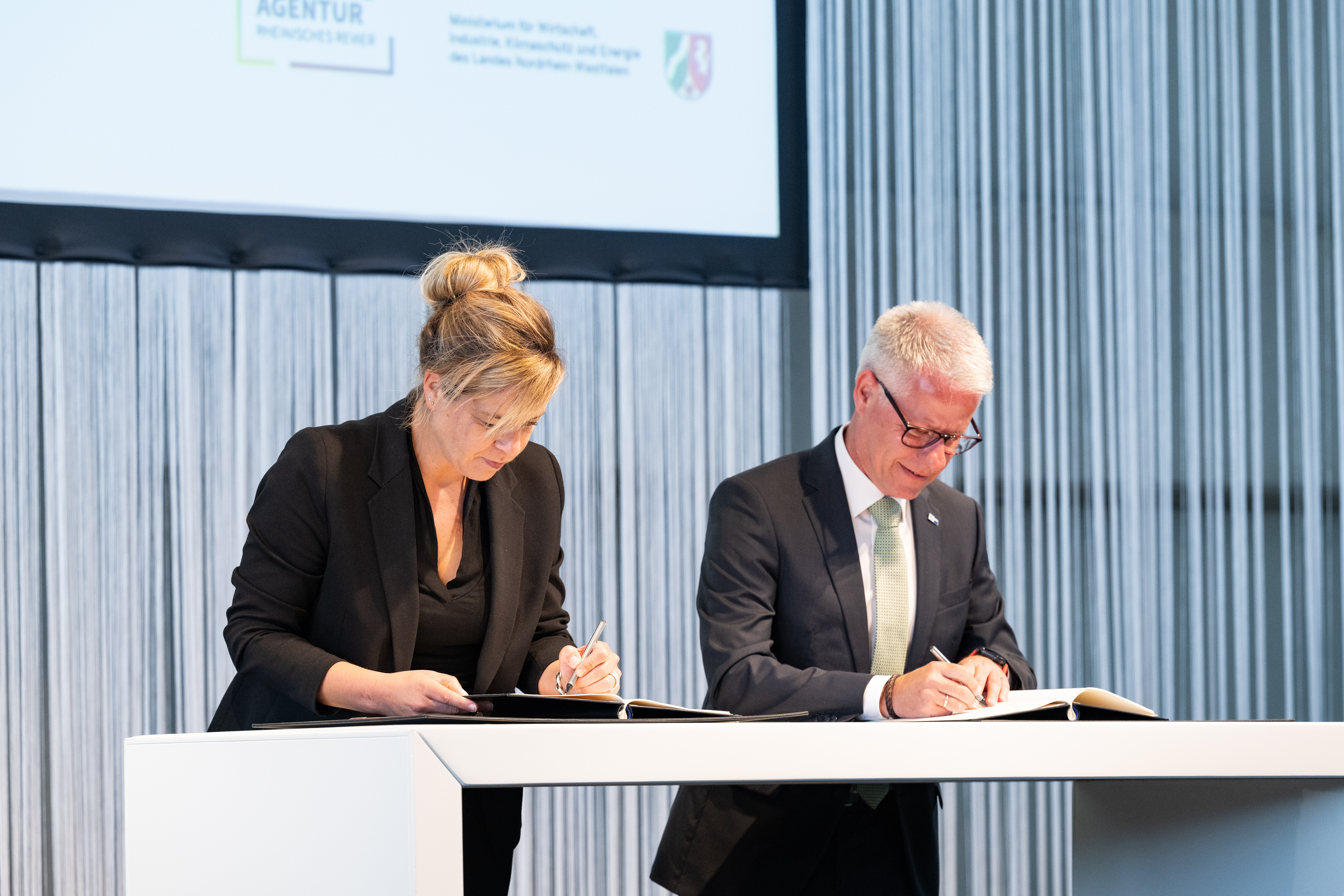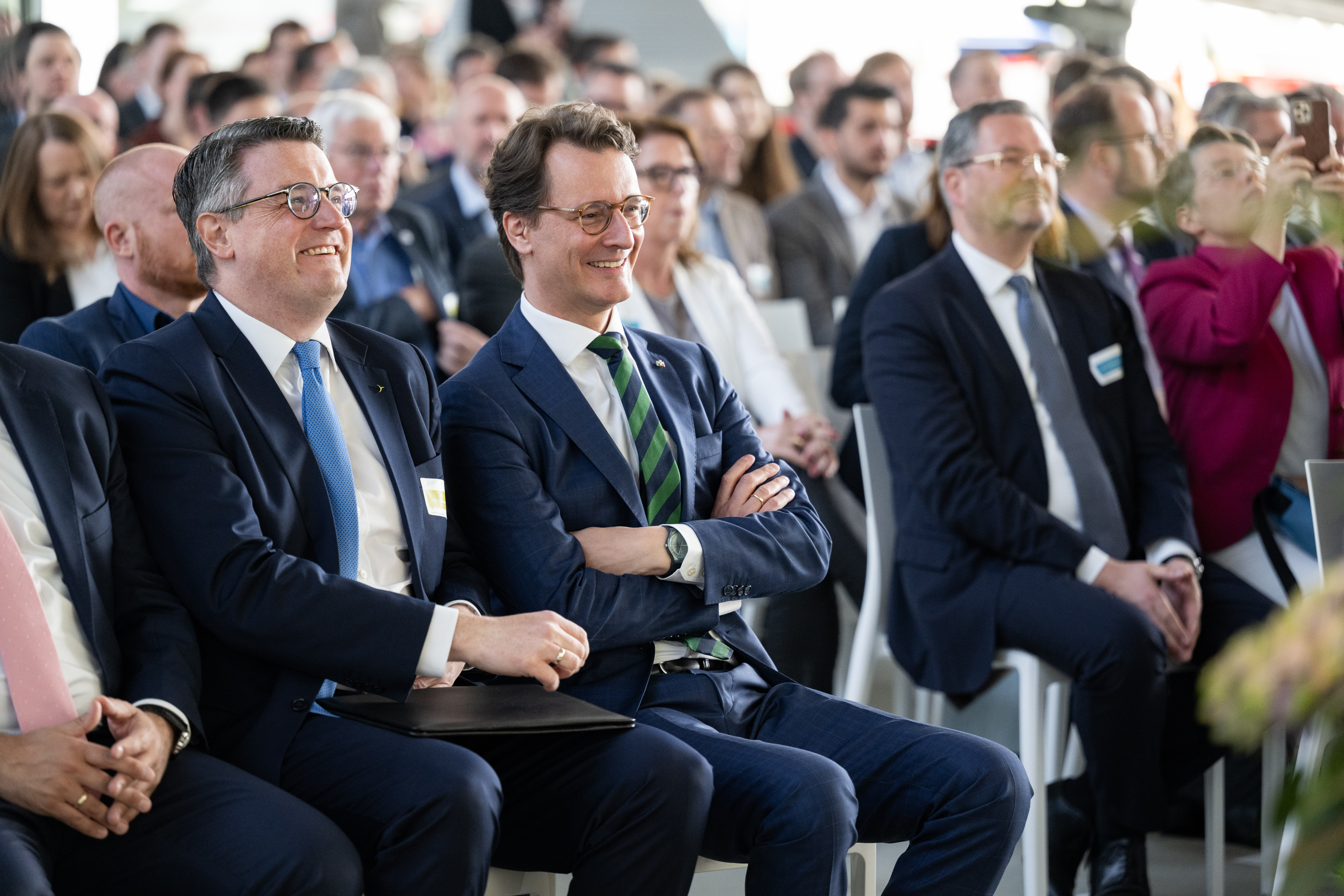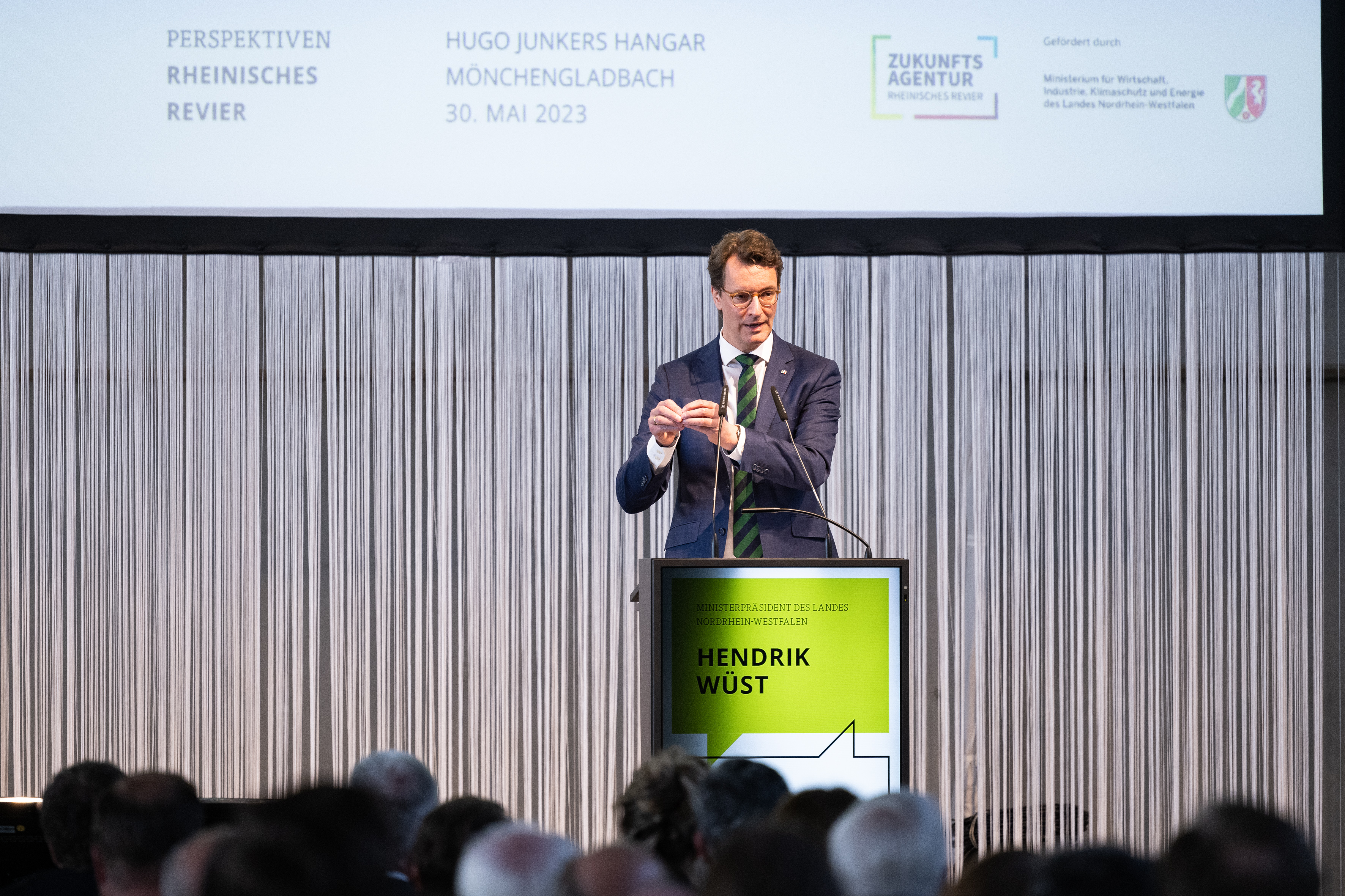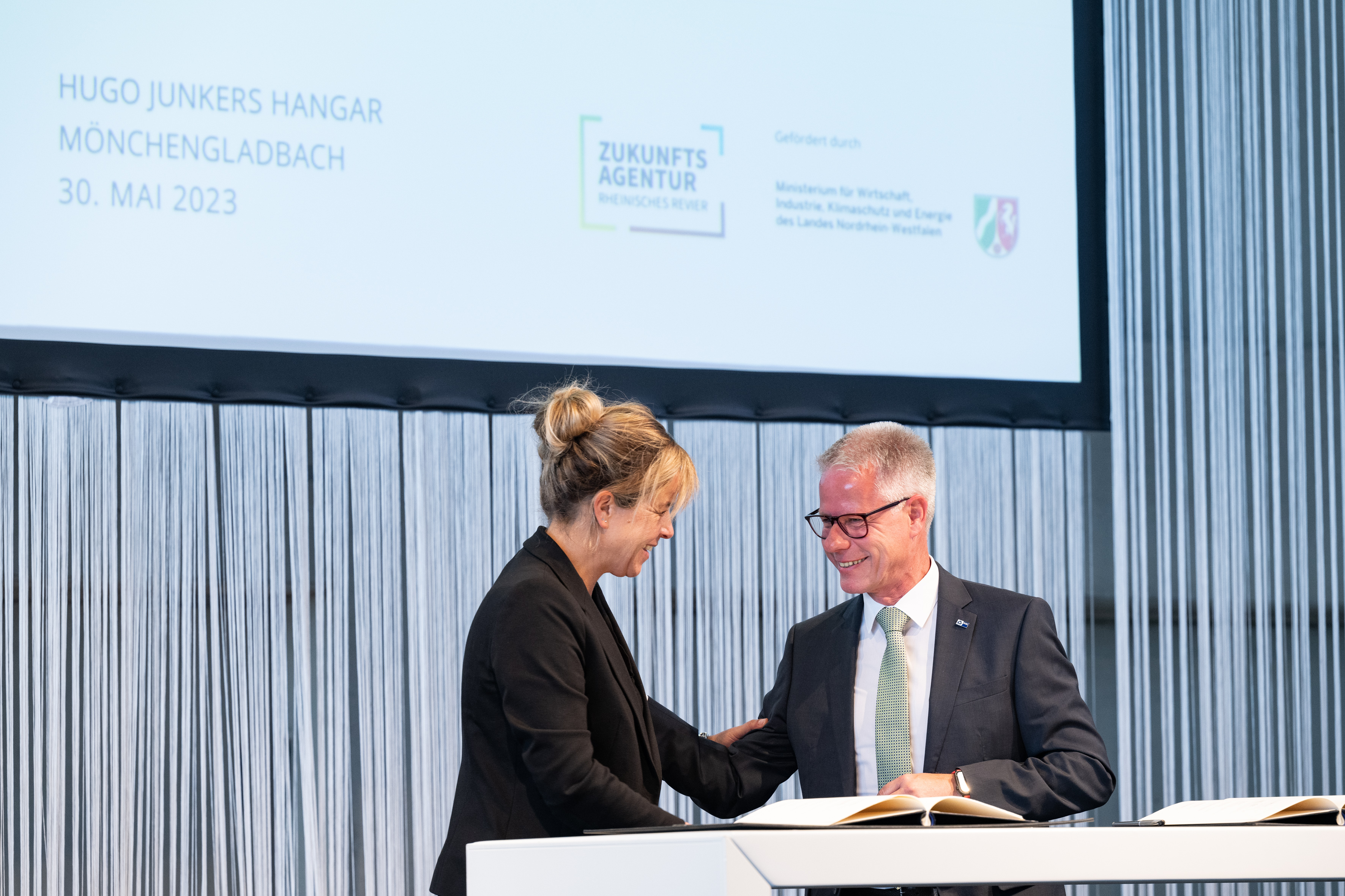 Der Einladung der Zukunftsagentur Rheinisches Revier zur Veranstaltung „Perspektiven Rheinisches Revier“ und zur Vertragsunterzeichnung am Hugo Junkers Hangar in Mönchengladbach folgten neben Ministerpräsident Hendrik Wüst und der stellvertretenden Ministerpräsidentin und Wirtschaftsministerin Mona Neubaur unter anderem Ministerin für Landwirtschaft und Verbraucherschutz Silke Gorißen, Minister für Umwelt, Naturschutz und Verkehr Oliver Krischer, Ministerin für Heimat, Kommunales, Bau und Digitalisierung Ina Scharrenbach, Minister für Bundes- und Europaangelegenheiten, Internationales sowie Medien und Chef der Staatskanzlei Nathanael Liminski sowie viele Industrie- und Handelskammern, Vertreterinnen und Vertreter der Anrainerkommunen, die Gesellschafterversammlung und weitere am Strukturwandel Beteiligte. Bundeswirtschaftsminister Robert Habeck wurde per Videoübertragung zugeschaltet.