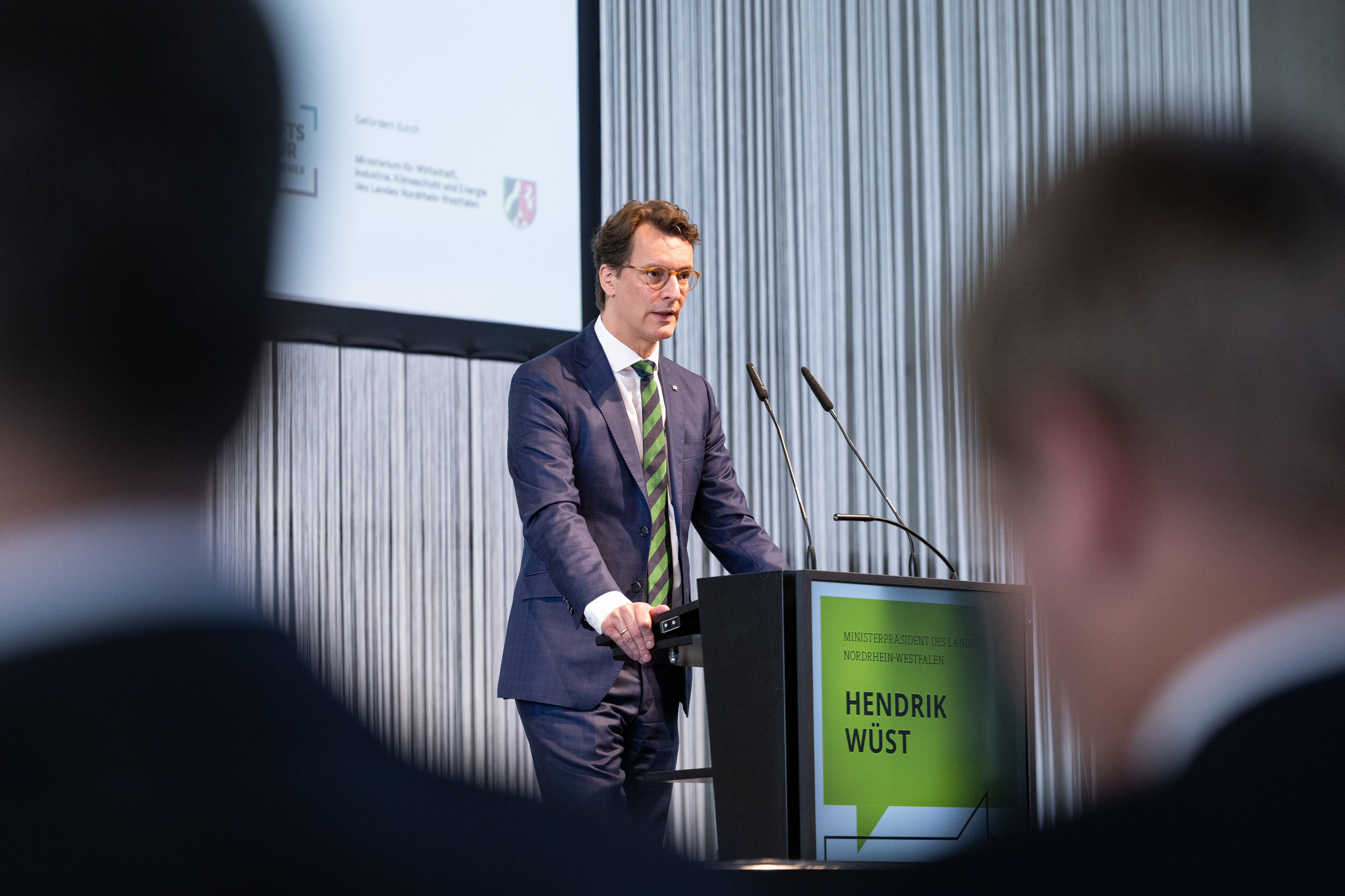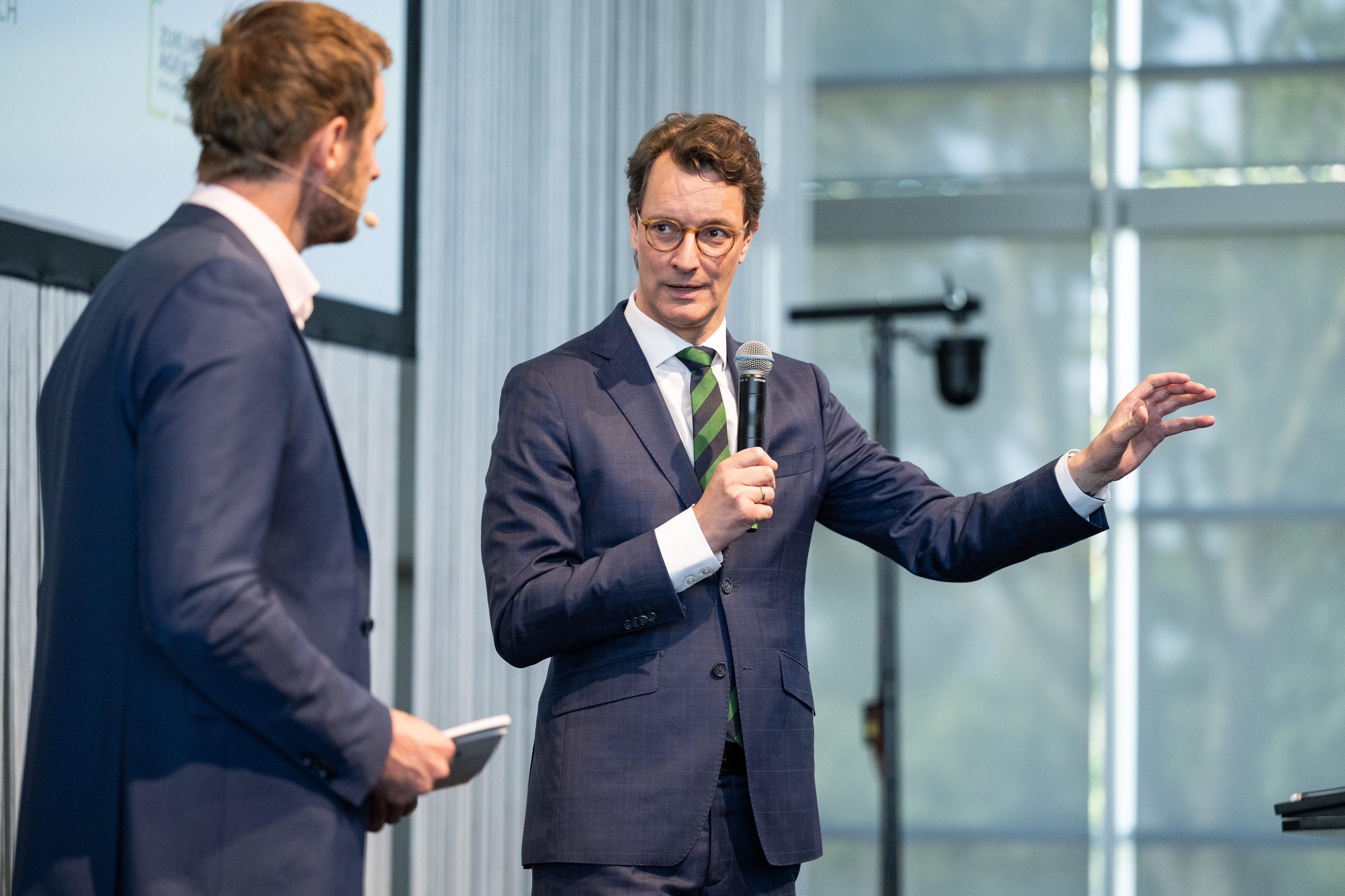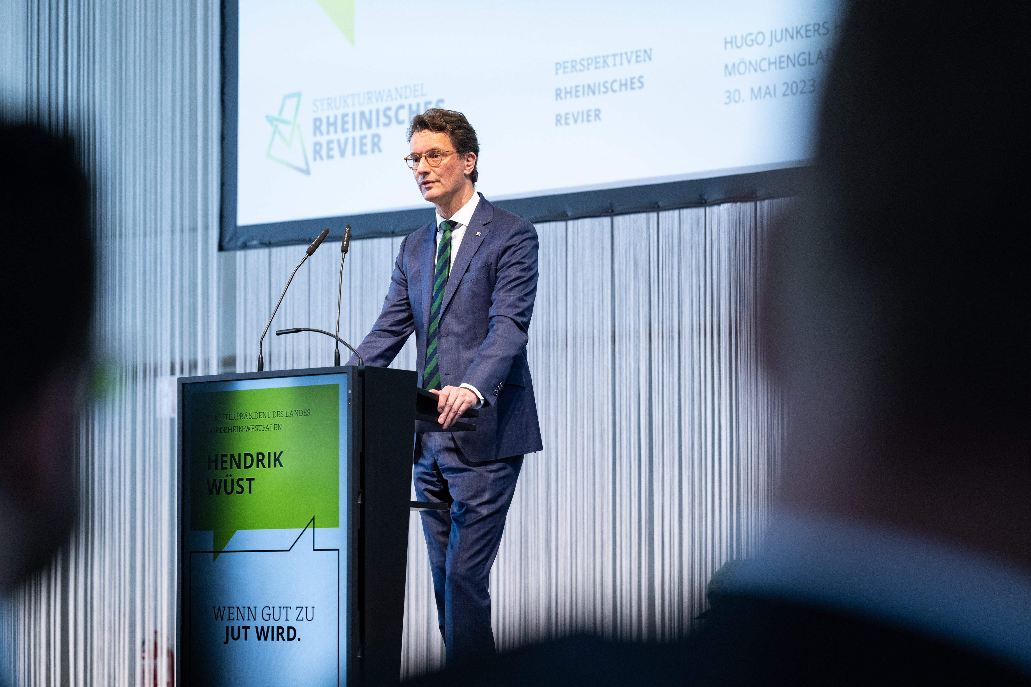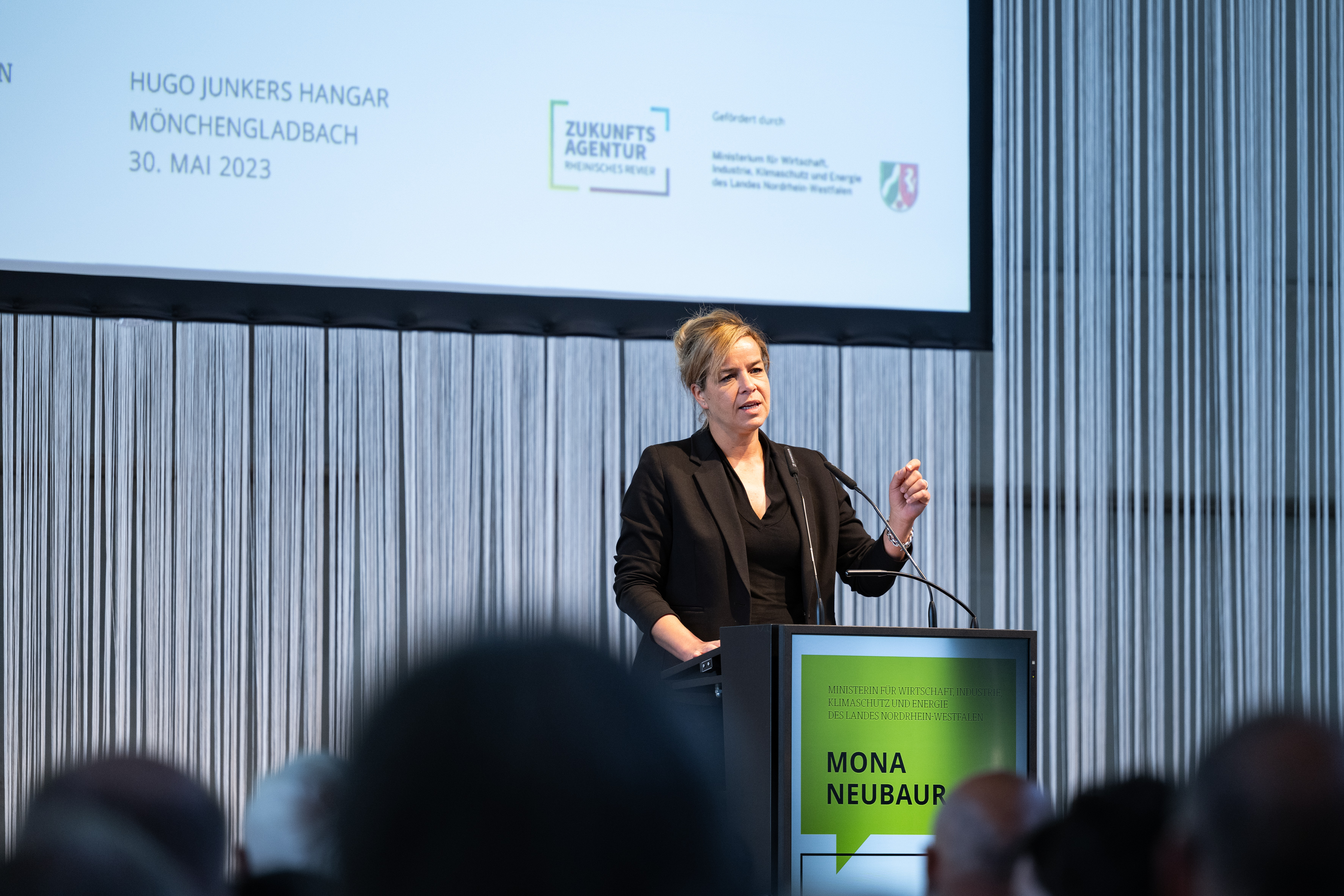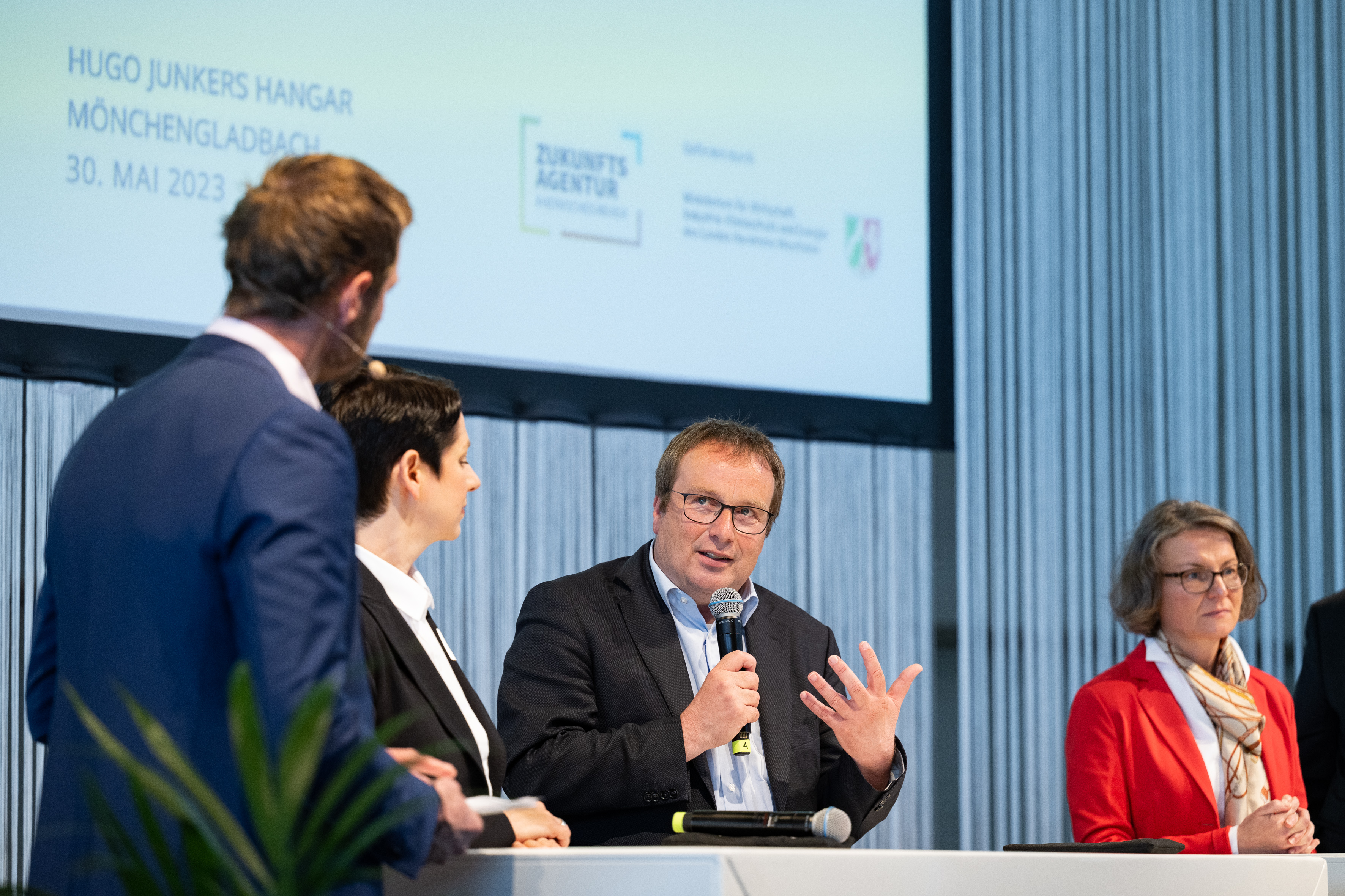 Der Einladung der Zukunftsagentur Rheinisches Revier zur Veranstaltung „Perspektiven Rheinisches Revier“ und zur Vertragsunterzeichnung am Hugo Junkers Hangar in Mönchengladbach folgten neben Ministerpräsident Hendrik Wüst und der stellvertretenden Ministerpräsidentin und Wirtschaftsministerin Mona Neubaur unter anderem Ministerin für Landwirtschaft und Verbraucherschutz Silke Gorißen, Minister für Umwelt, Naturschutz und Verkehr Oliver Krischer, Ministerin für Heimat, Kommunales, Bau und Digitalisierung Ina Scharrenbach, Minister für Bundes- und Europaangelegenheiten, Internationales sowie Medien und Chef der Staatskanzlei Nathanael Liminski sowie viele Industrie- und Handelskammern, Vertreterinnen und Vertreter der Anrainerkommunen, die Gesellschafterversammlung und weitere am Strukturwandel Beteiligte. Bundeswirtschaftsminister Robert Habeck wurde per Videoübertragung zugeschaltet.