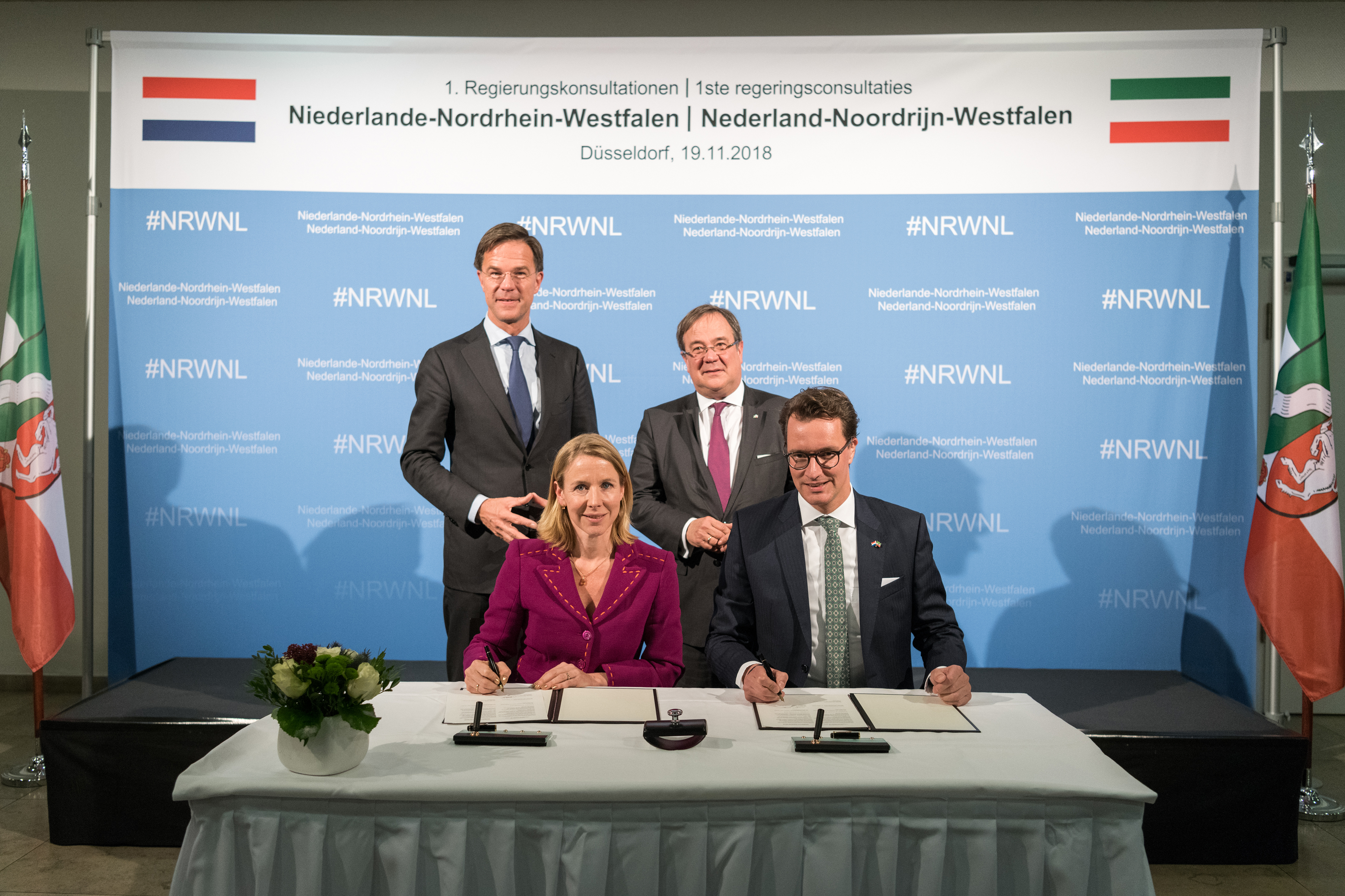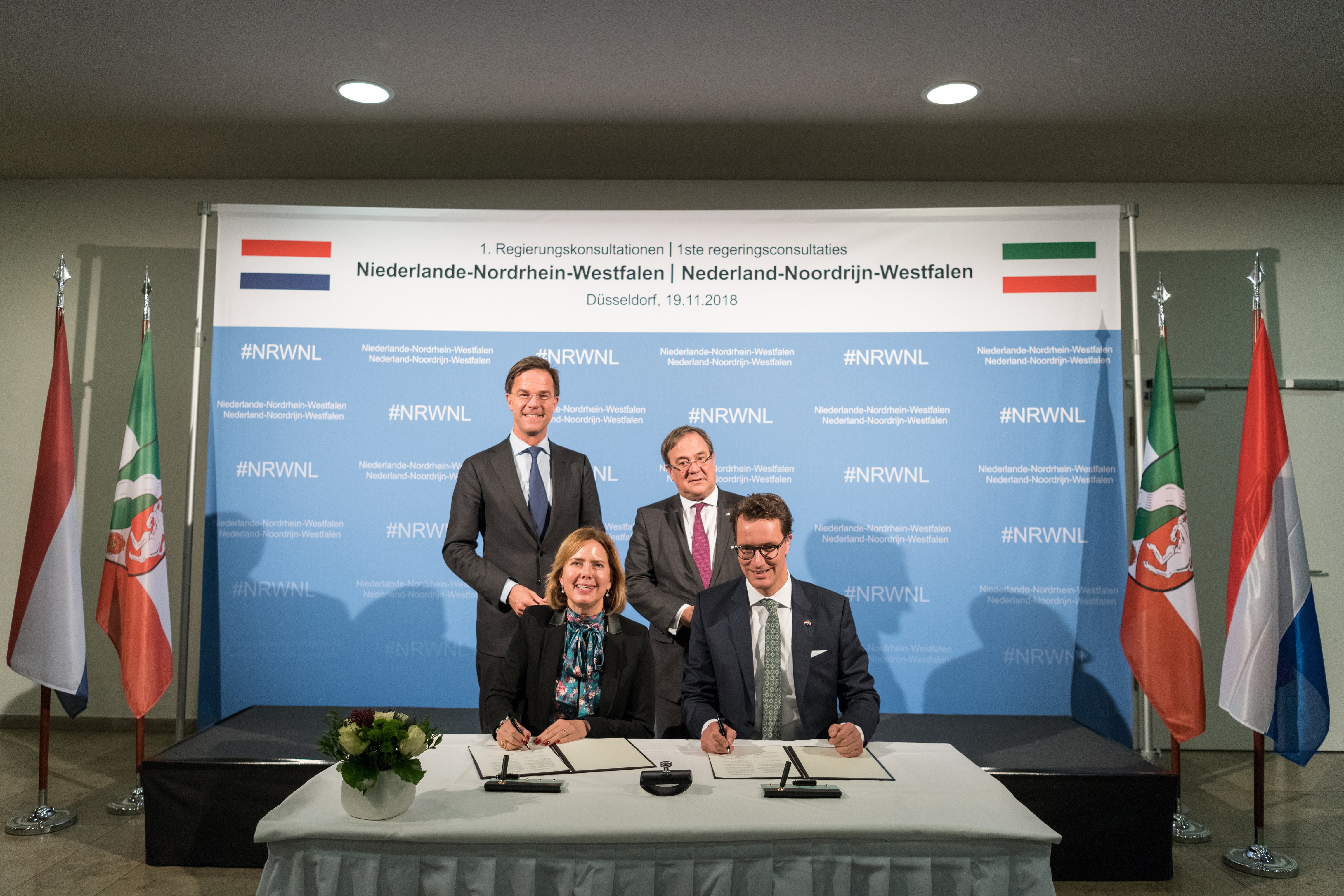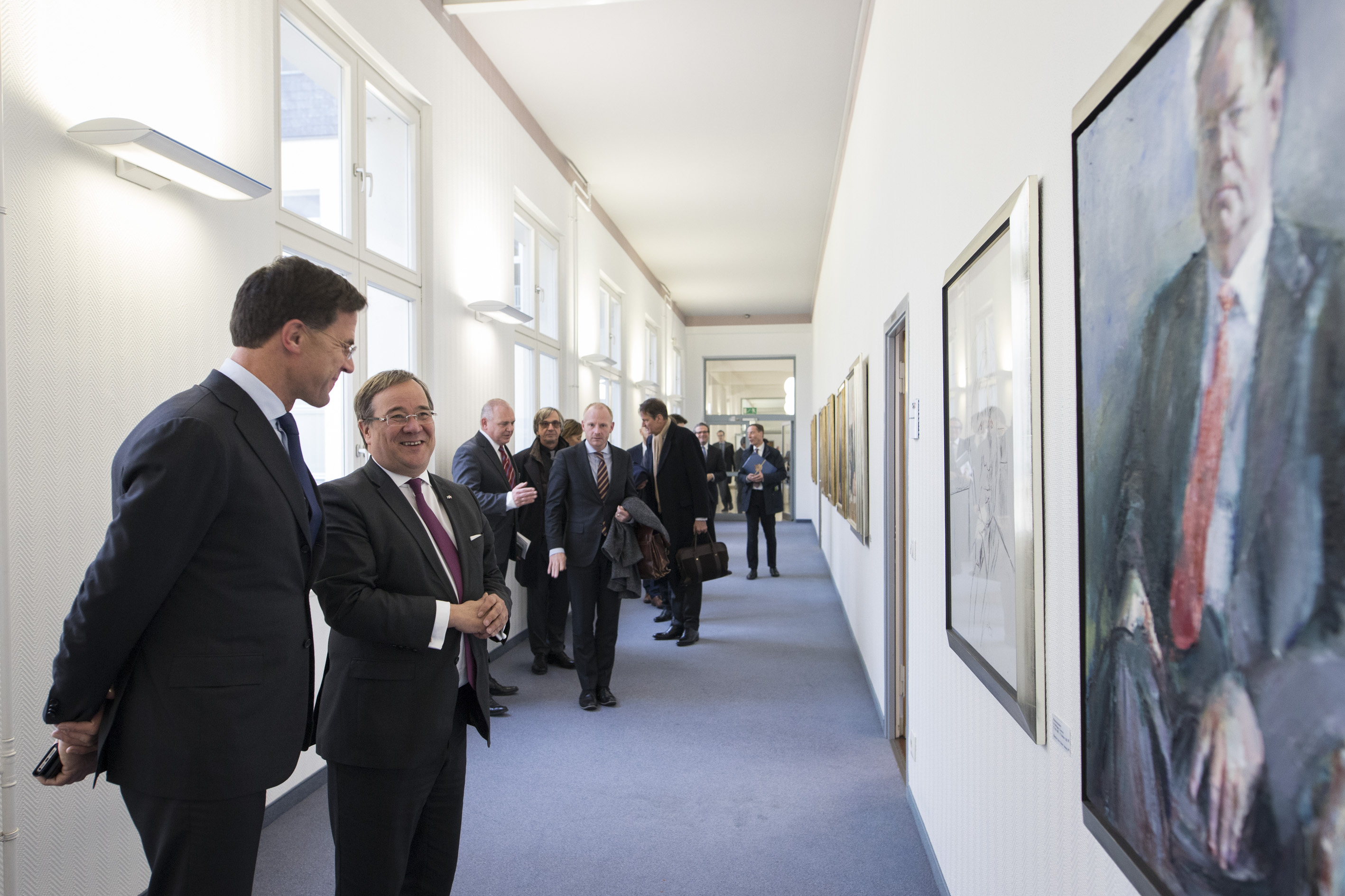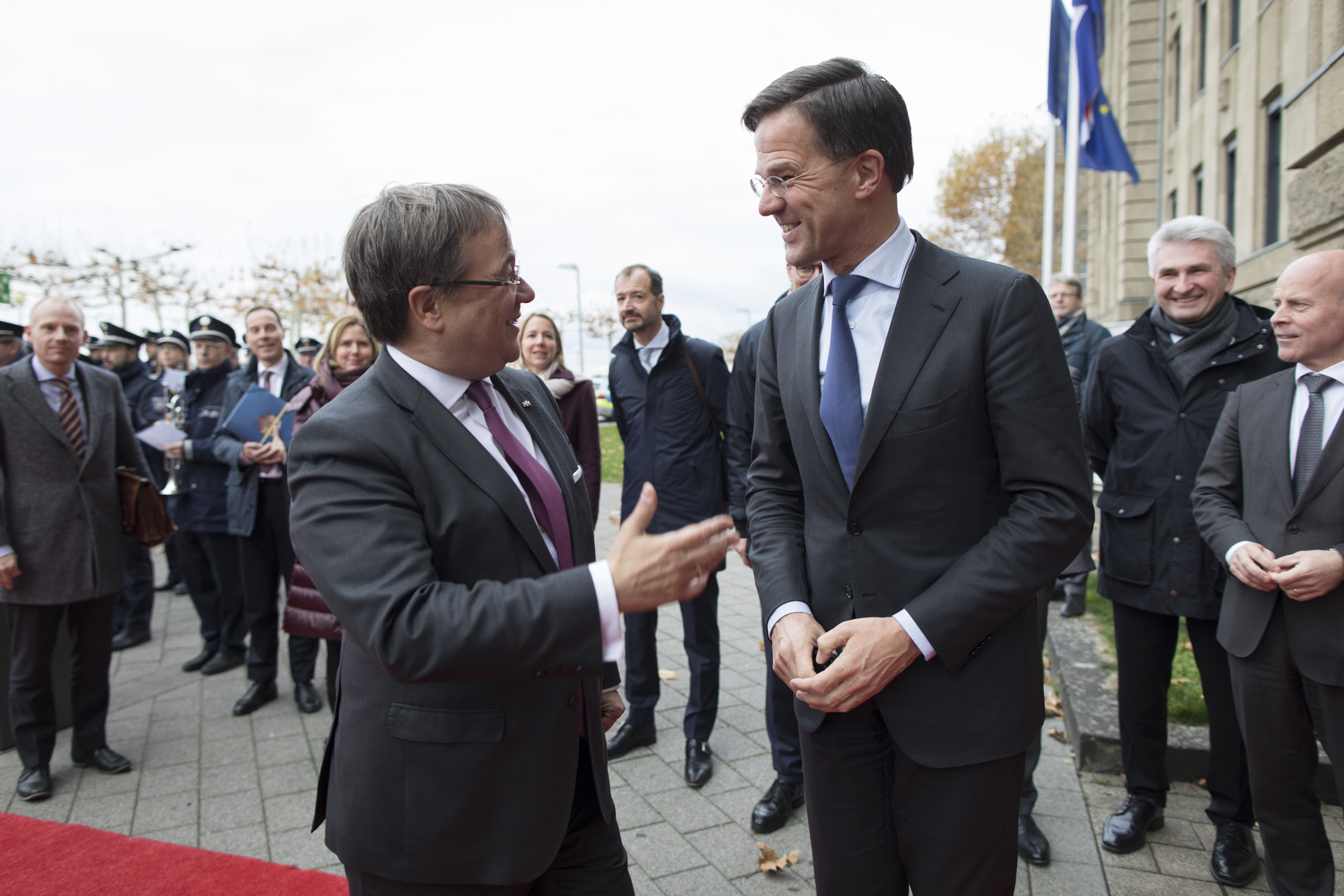 Beide Ministerpräsidenten hatten das Format eines regelmäßigen Austauschs ihrer Regierungen im September 2017 in Den Haag im Rahmen der ersten Auslandsreise von Ministerpräsident Laschet in die Niederlande verabredet und sind nun übereinkommen, die Regierungstreffen künftig regelmäßig fortzuführen.Ministerpräsident Rutte wurde beim dem Besuch im Landeshaus von mehreren Kabinettsmitgliedern begleitet: dem Minister für Wirtschaft und Klima, Eric Wiebes, der Ministerin für Infrastruktur und Wasserwirtschaft, Cora van Nieuwenhuizen, der Staatssekretärin für Infrastruktur und Wasserwirtschaft, Stientje van Veldhoven sowie dem Staatssekretär für grenzüberschreitende Zusammenarbeit und Königreichsbeziehungen im Innenministerium, Raymond Knops.