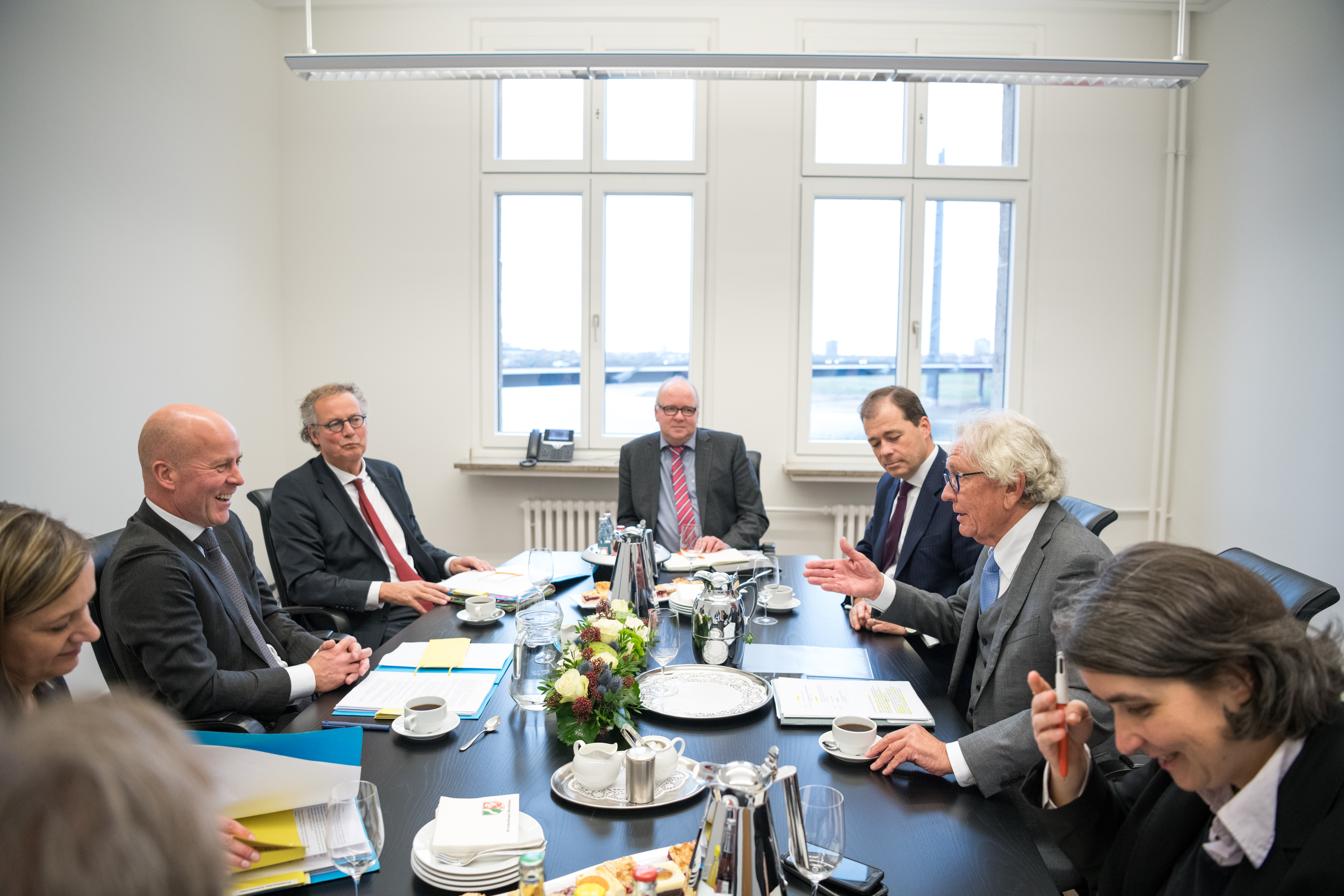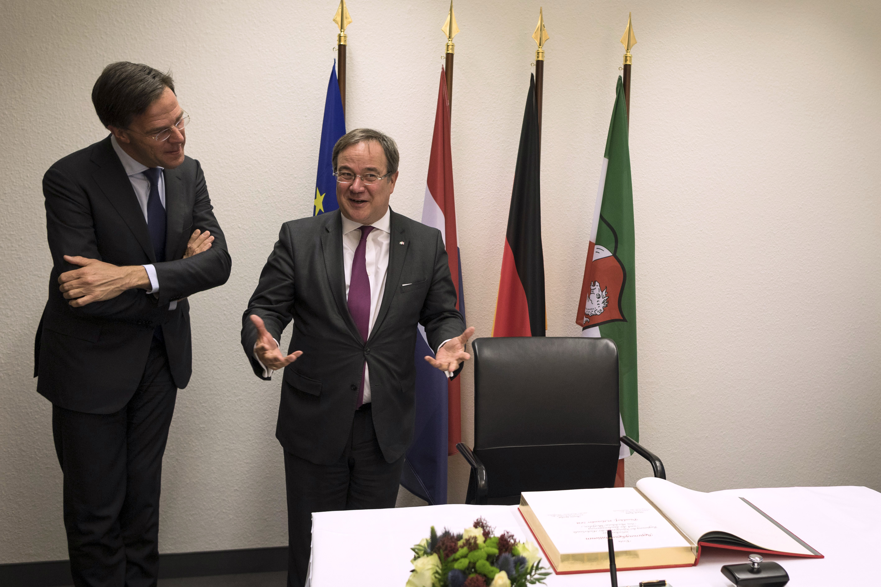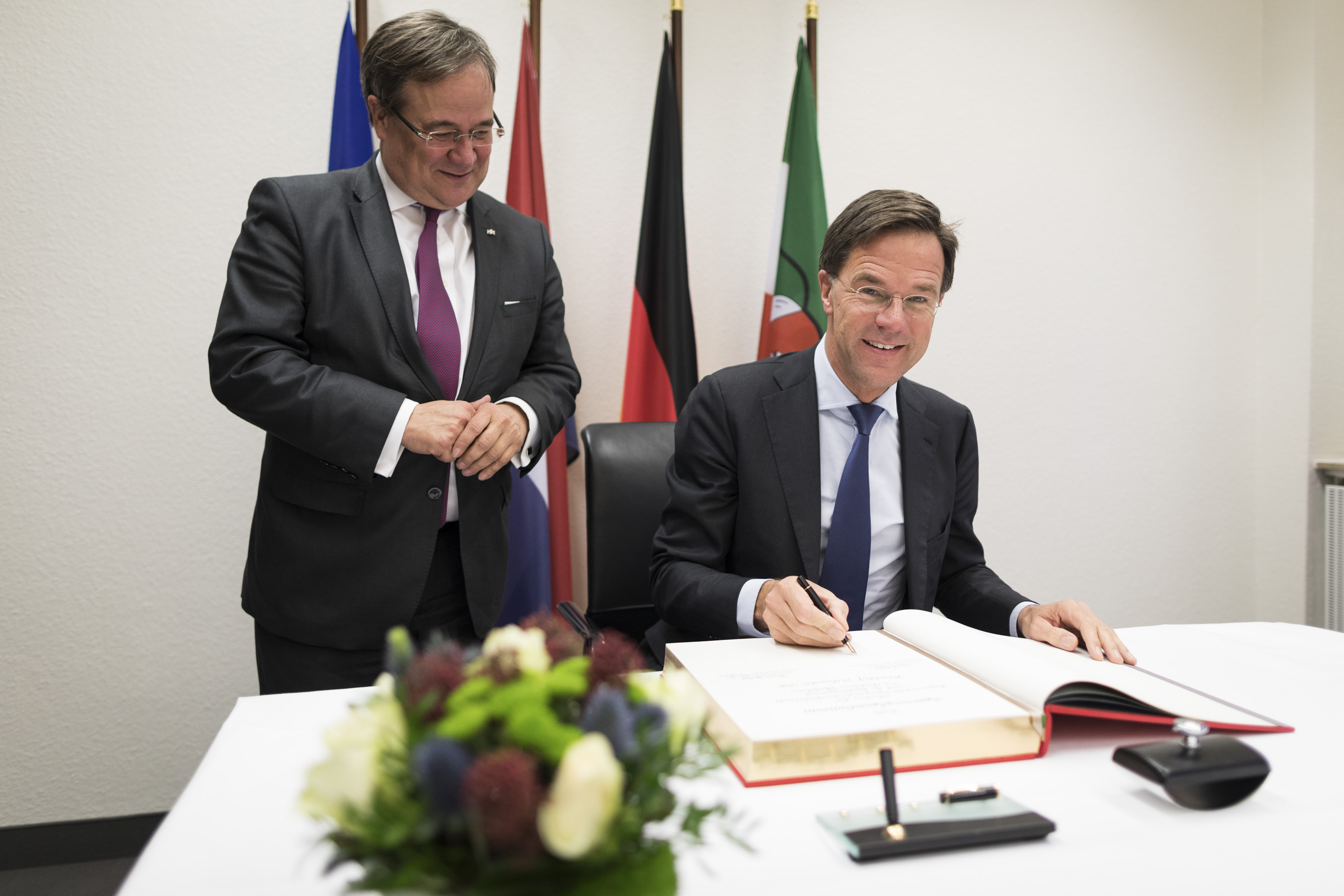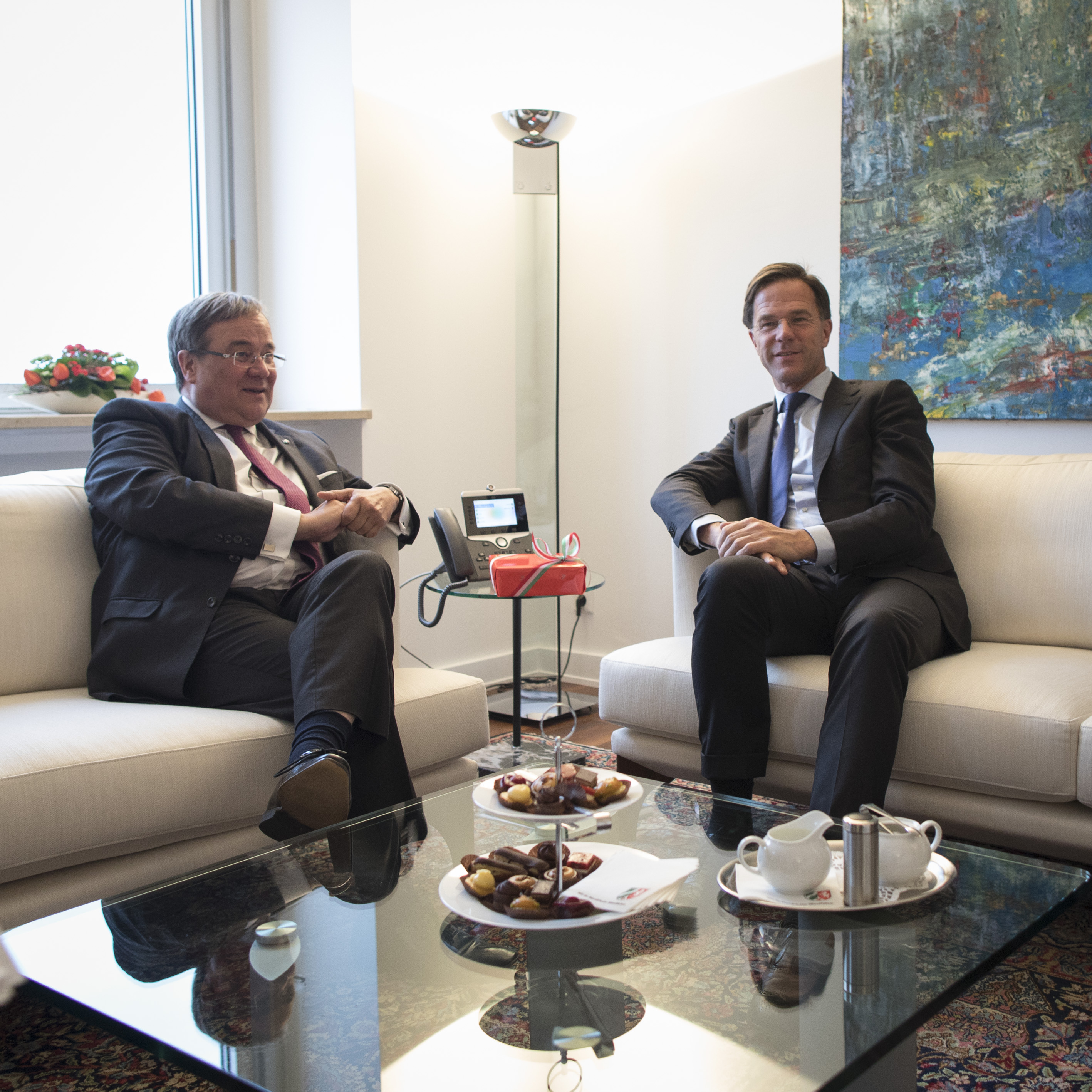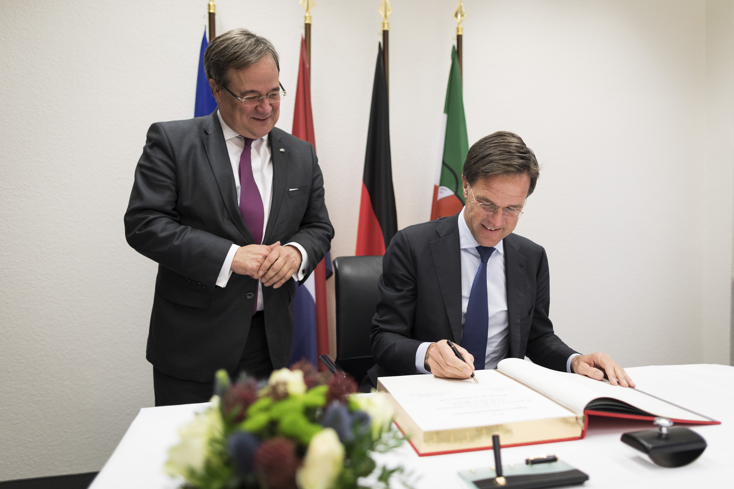 Beide Ministerpräsidenten hatten das Format eines regelmäßigen Austauschs ihrer Regierungen im September 2017 in Den Haag im Rahmen der ersten Auslandsreise von Ministerpräsident Laschet in die Niederlande verabredet und sind nun übereinkommen, die Regierungstreffen künftig regelmäßig fortzuführen.Ministerpräsident Rutte wurde beim dem Besuch im Landeshaus von mehreren Kabinettsmitgliedern begleitet: dem Minister für Wirtschaft und Klima, Eric Wiebes, der Ministerin für Infrastruktur und Wasserwirtschaft, Cora van Nieuwenhuizen, der Staatssekretärin für Infrastruktur und Wasserwirtschaft, Stientje van Veldhoven sowie dem Staatssekretär für grenzüberschreitende Zusammenarbeit und Königreichsbeziehungen im Innenministerium, Raymond Knops.