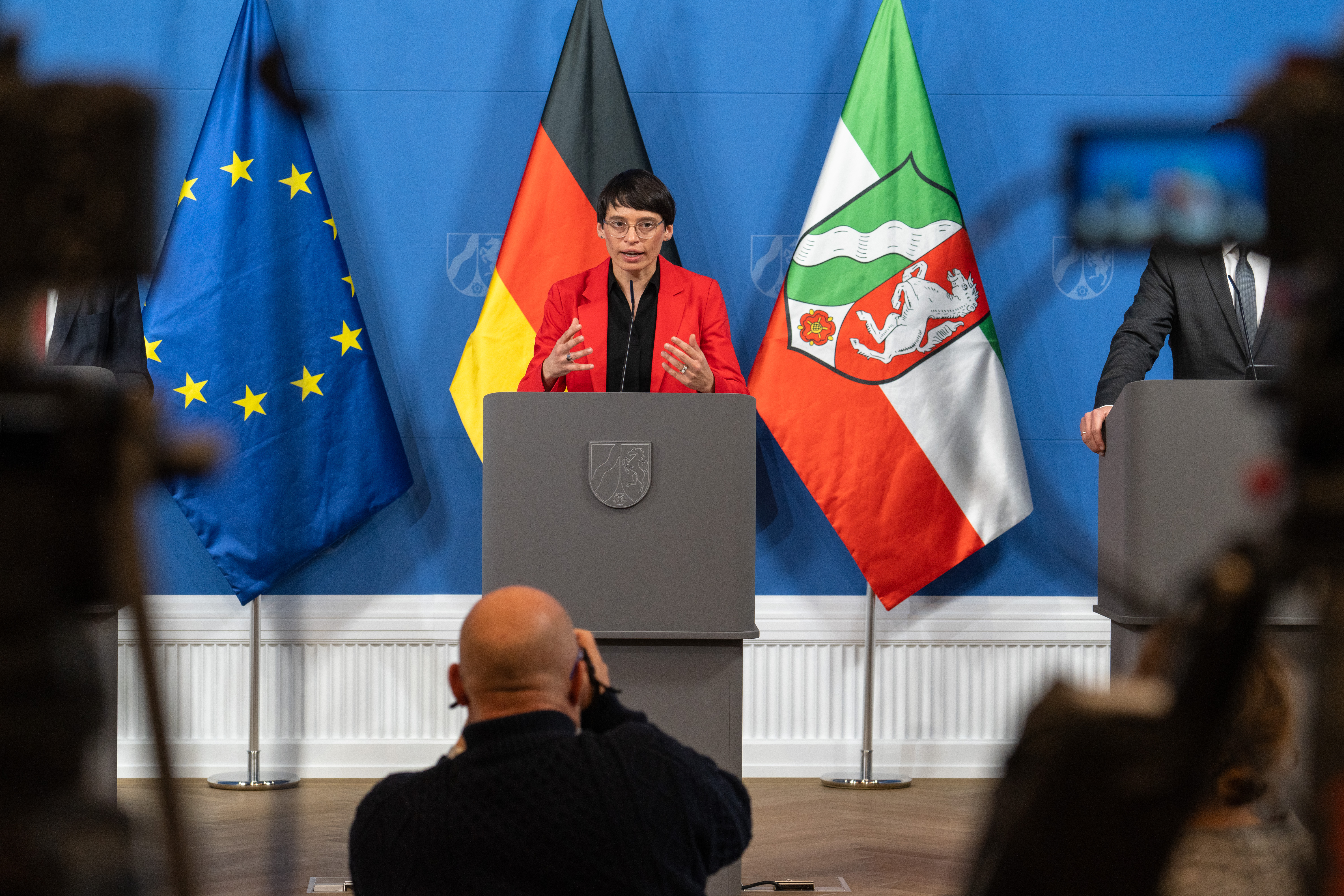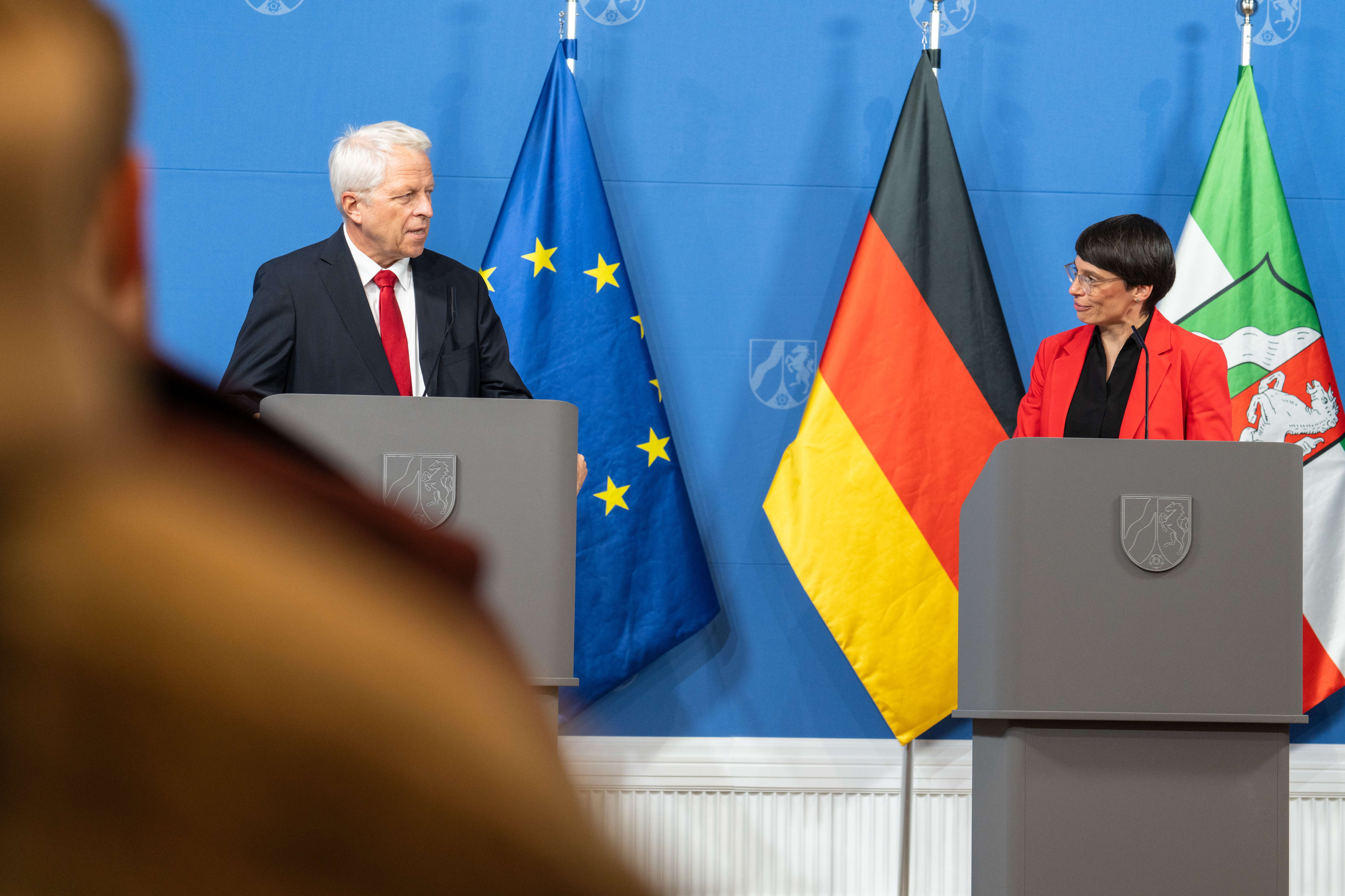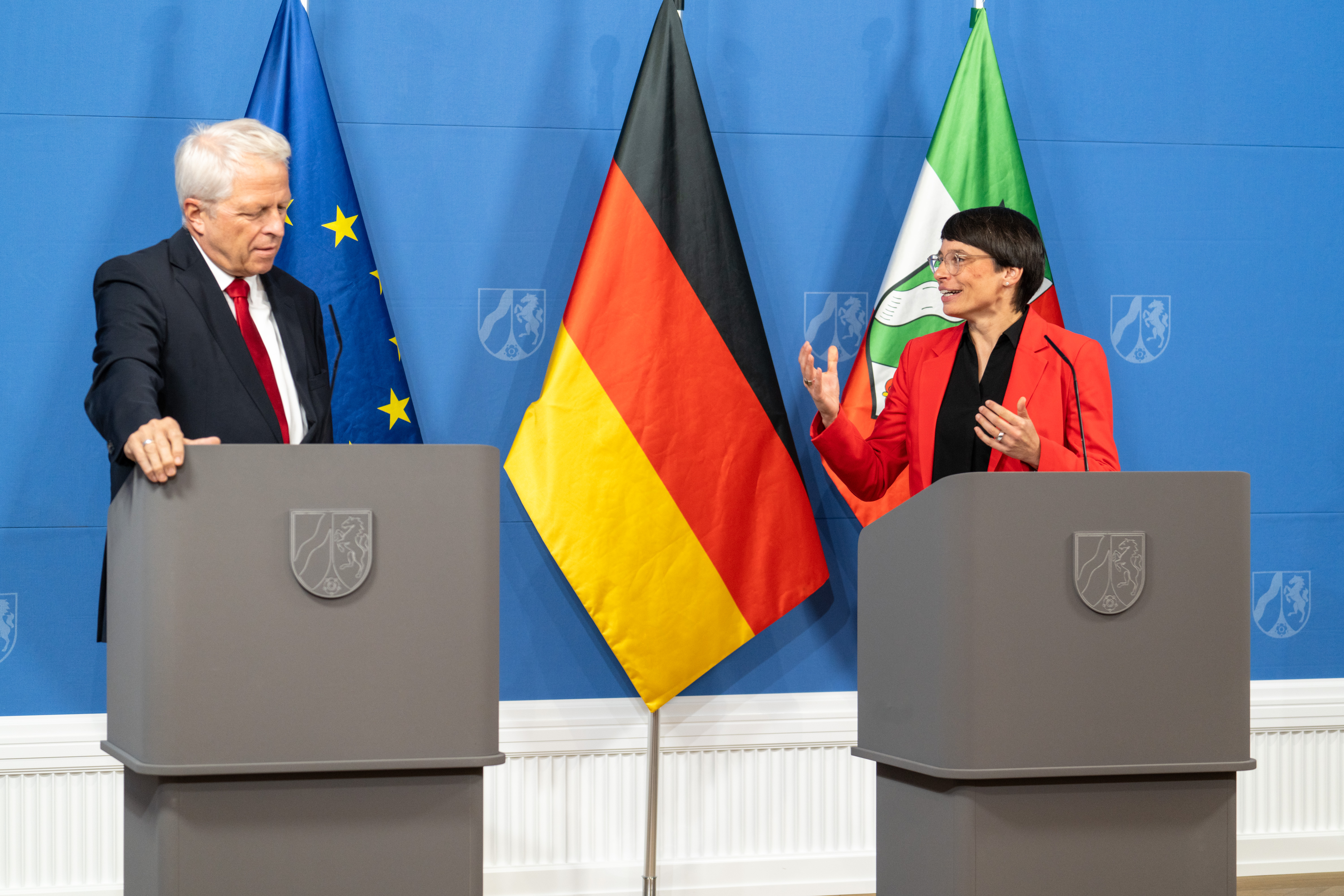 Die Ministerin für Kinder, Jugend, Familie, Gleichstellung, Flucht und Integration, Josefine Paul, stellt im Nachgang der Kabinettsitzung den neuen Berater des Ministeriums für Unterbringungsfragen, Staatssekretär a.D. Jürgen Mathies, vor.