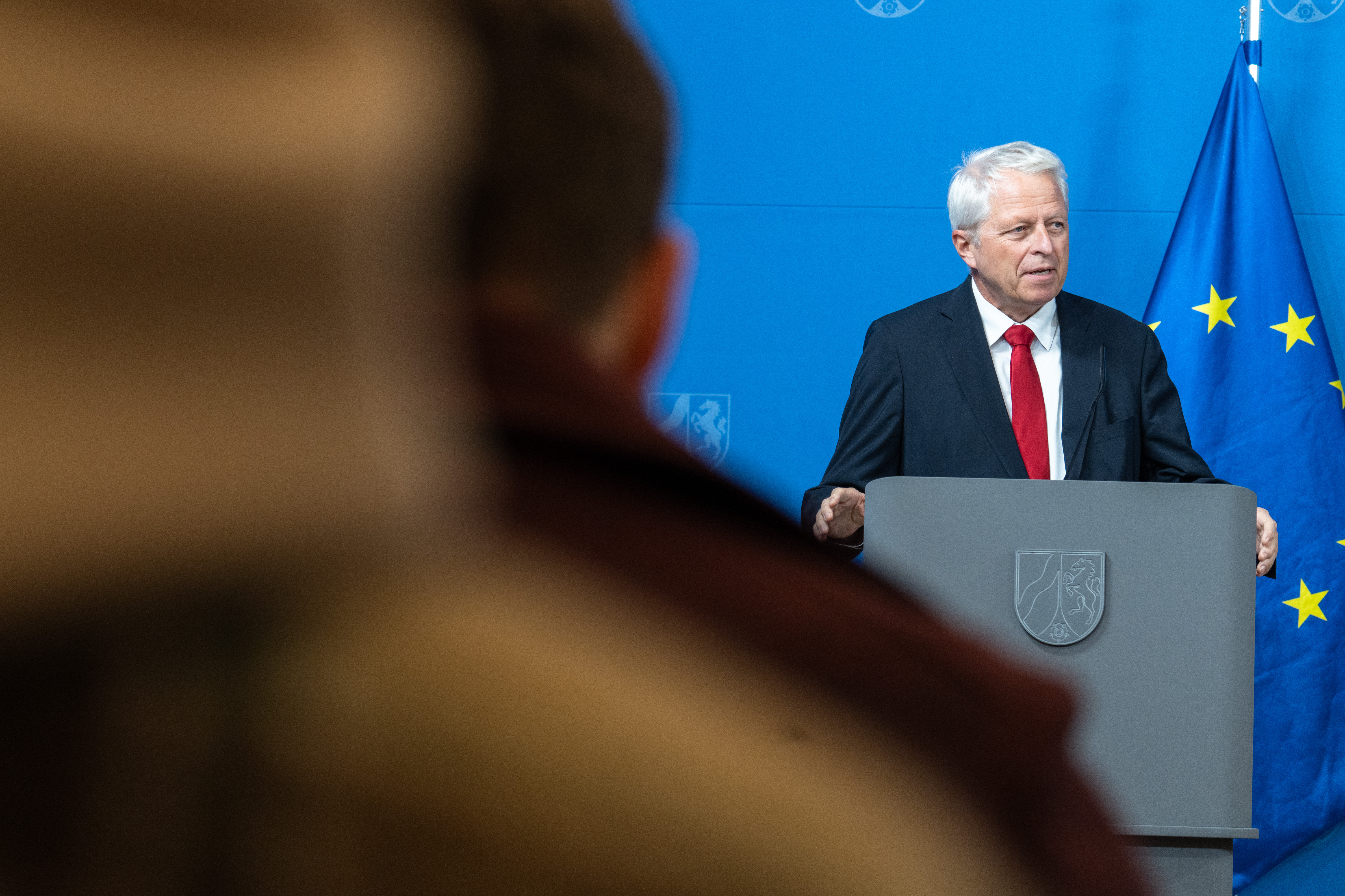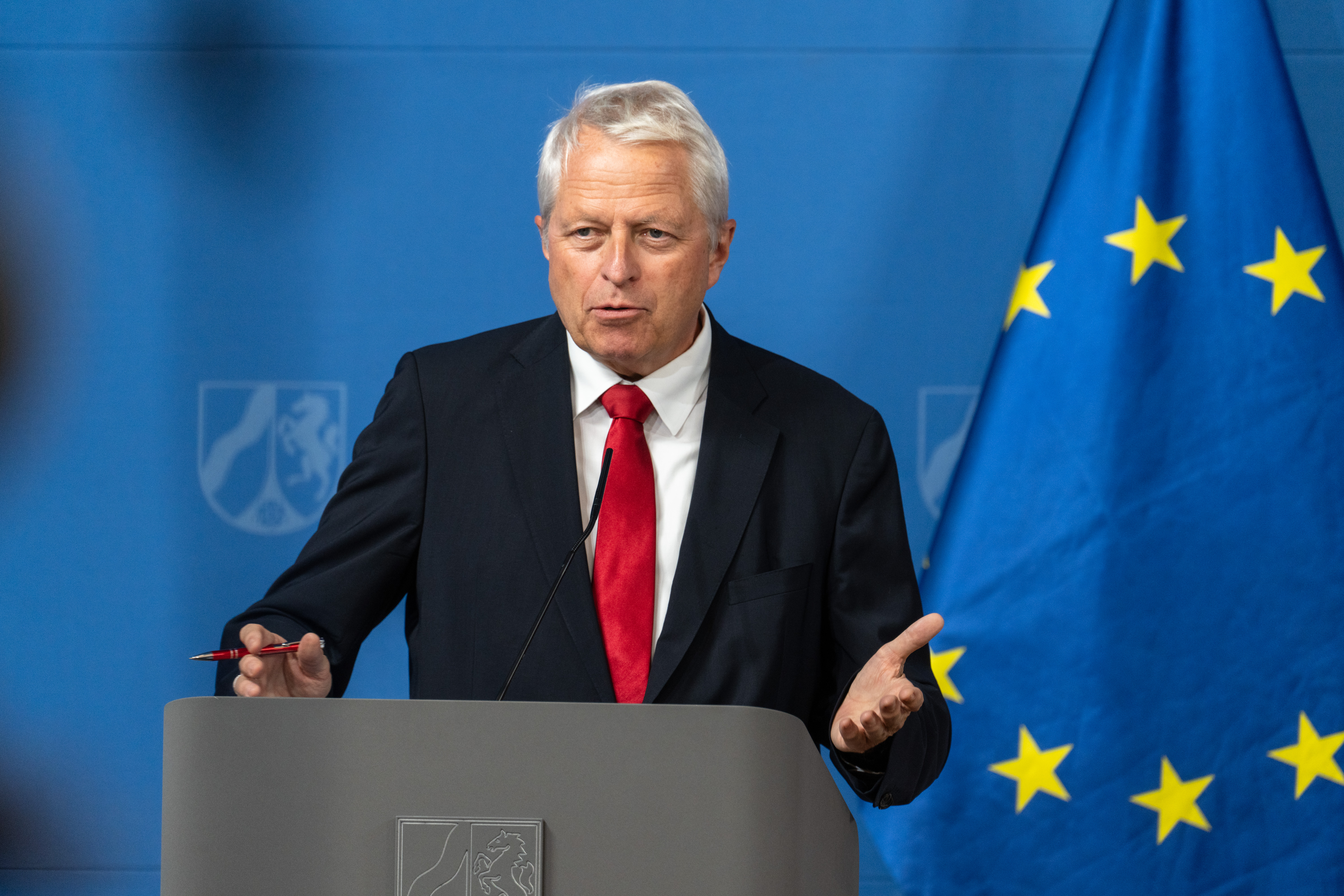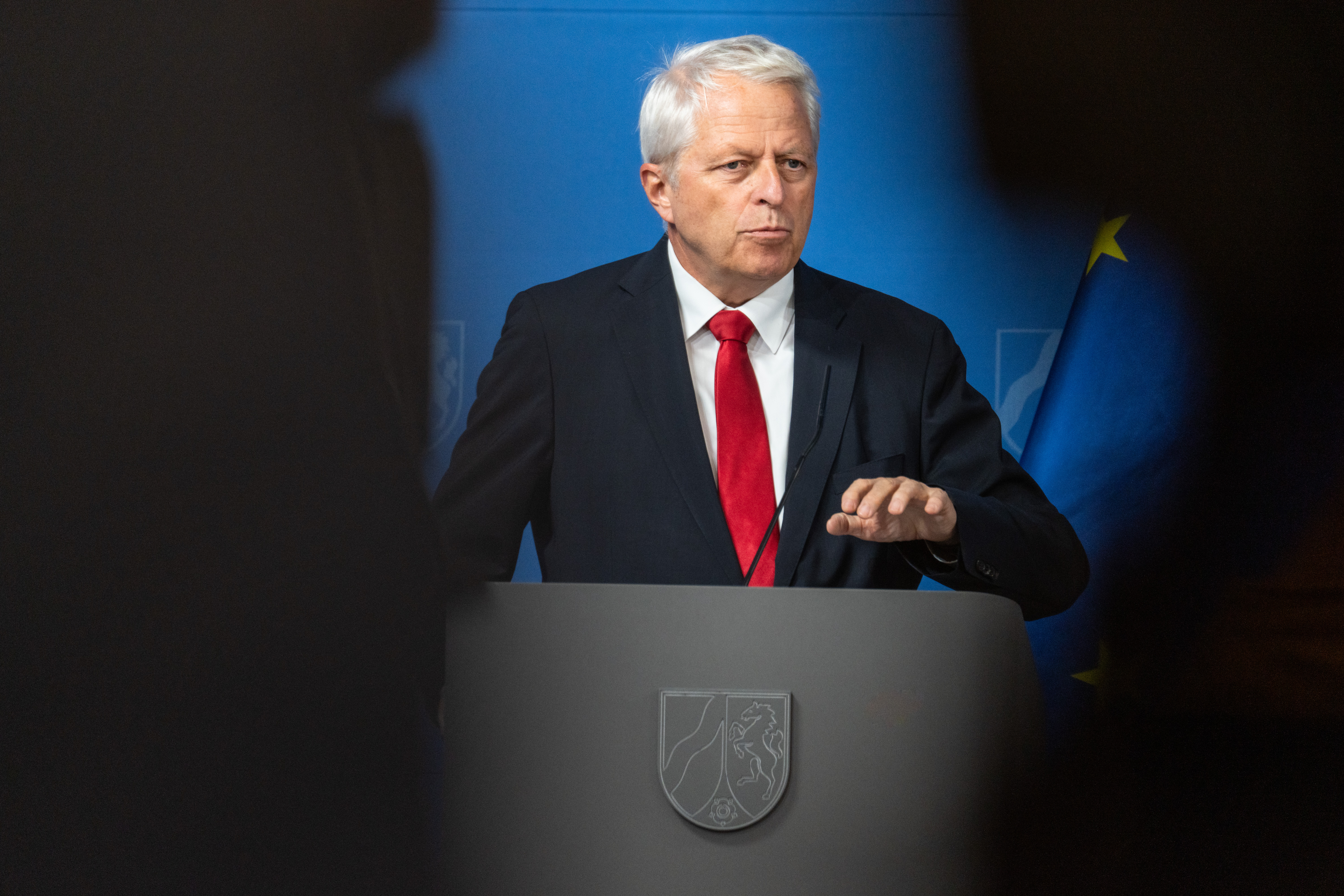 Die Ministerin für Kinder, Jugend, Familie, Gleichstellung, Flucht und Integration, Josefine Paul, stellt im Nachgang der Kabinettsitzung den neuen Berater des Ministeriums für Unterbringungsfragen, Staatssekretär a.D. Jürgen Mathies, vor.