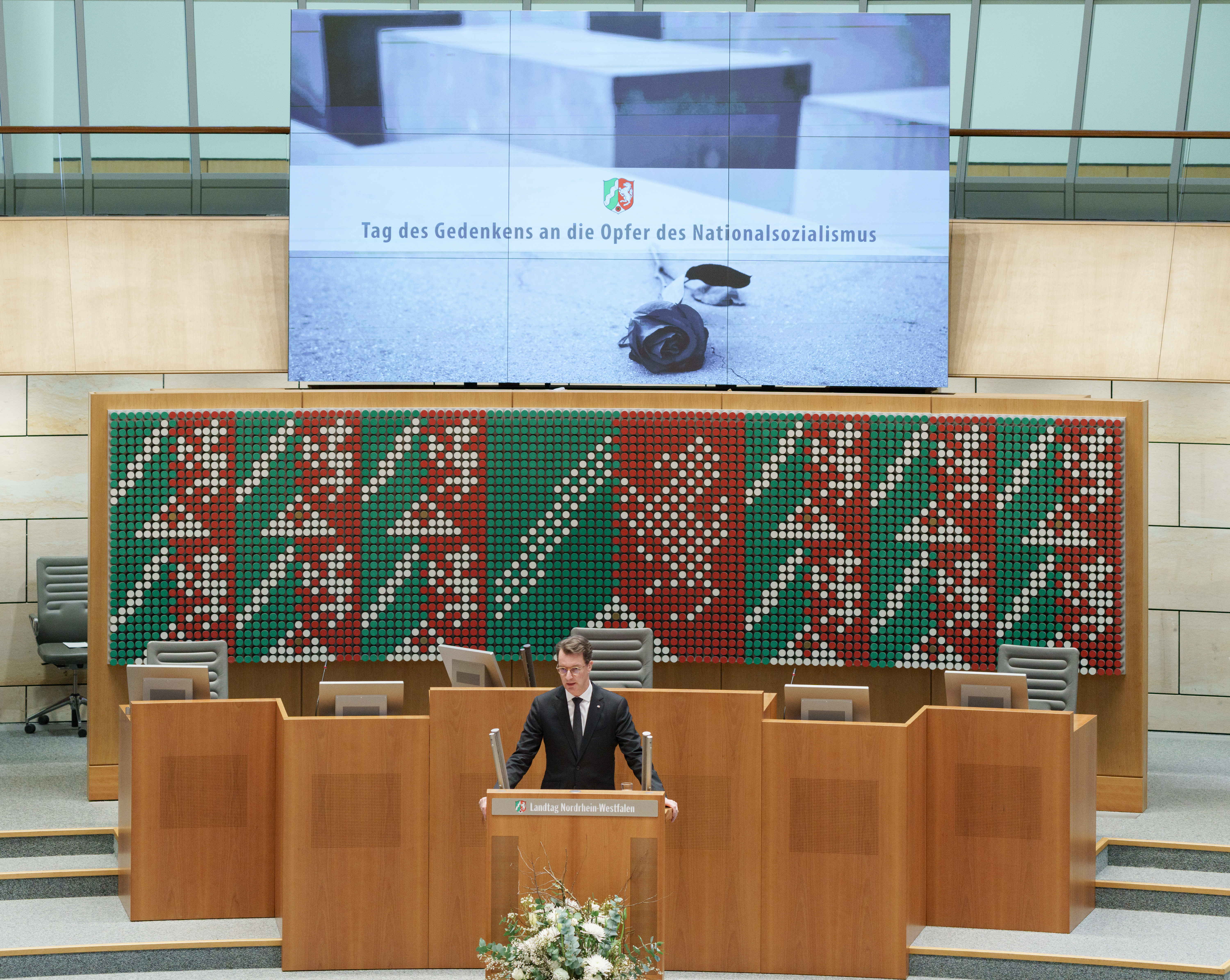 Der Landtag und die Landesregierung Nordrhein-Westfalen haben bei einer Gedenkstunde im Plenarsaal gemeinsam an die Opfer des Nationalsozialismus erinnert. Sie stand in diesem Jahr anlässlich des Jahrestags der Befreiung des Konzentrationslagers Auschwitz-Birkenau 1945 besonders im Zeichen des Erinnerns an die Verfolgung und Ermordung sexueller Minderheiten durch das nationalsozialistische Regime.