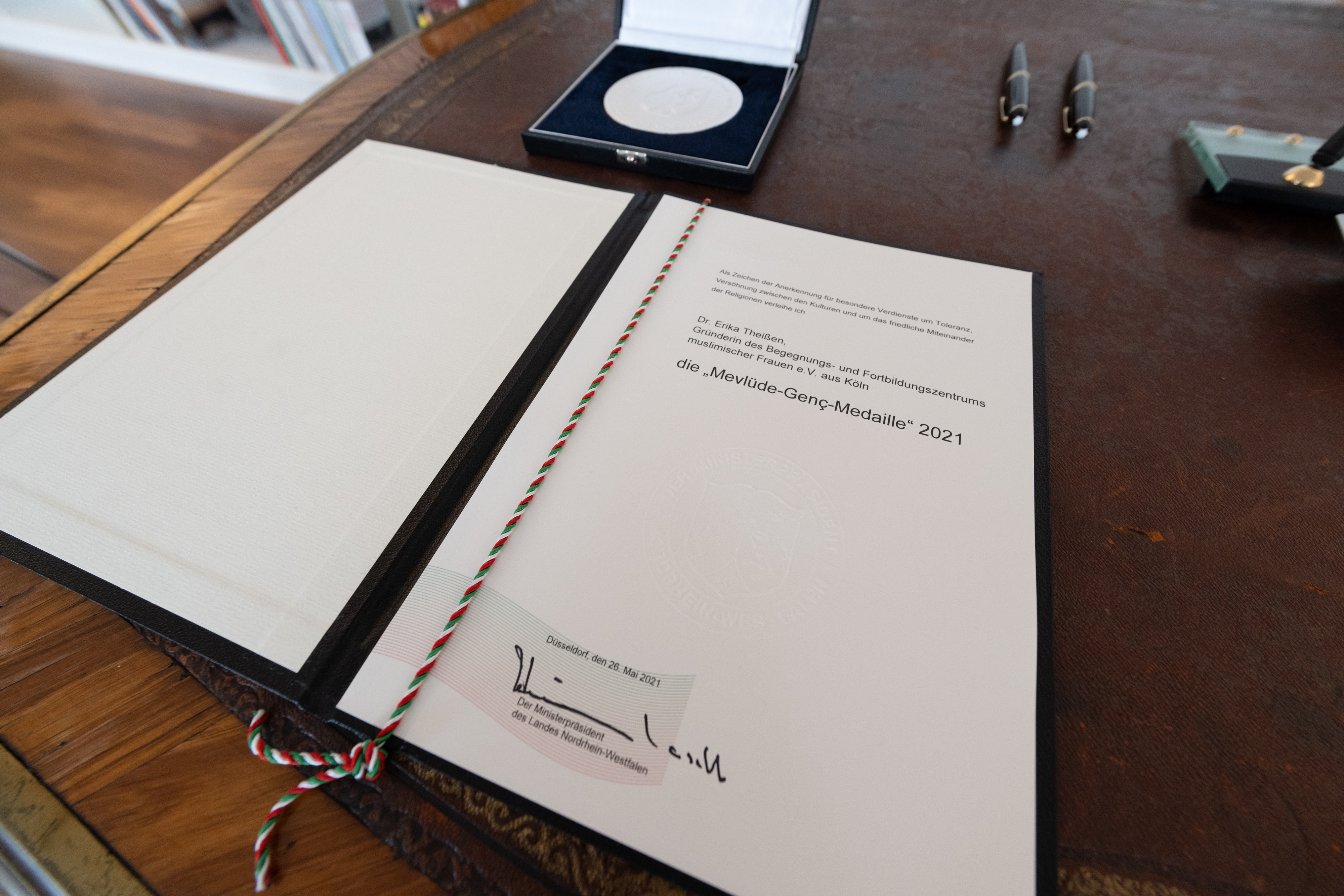 Ministerpräsident Armin Laschet hat am Mittwoch, 26. Mai 2021, der Gründerin und langjährigen Geschäftsführerin des Begegnungs- und Fortbildungszentrumsmuslimischer Frauen e.V., Dr. Erika Theißen, die Mevlüde-Genç-Medaille des Landes Nordrhein-Westfalen verliehen. Die Ehrung fand in der Staatskanzlei in Düsseldorf im Vorfeld des 28. Jahrestages des Brandanschlags von Solingen (29. Mai 1993) statt. Mit der von der Landesregierung gestifteten Medaille zeichnet der Ministerpräsident jährlich Personen und Vereine aus, die sich im Sinne von Mevlüde Genç für mehr gesellschaftliche, religiöse und kulturelle Toleranz und Versöhnung sowie für das friedliche Miteinander stark machen.