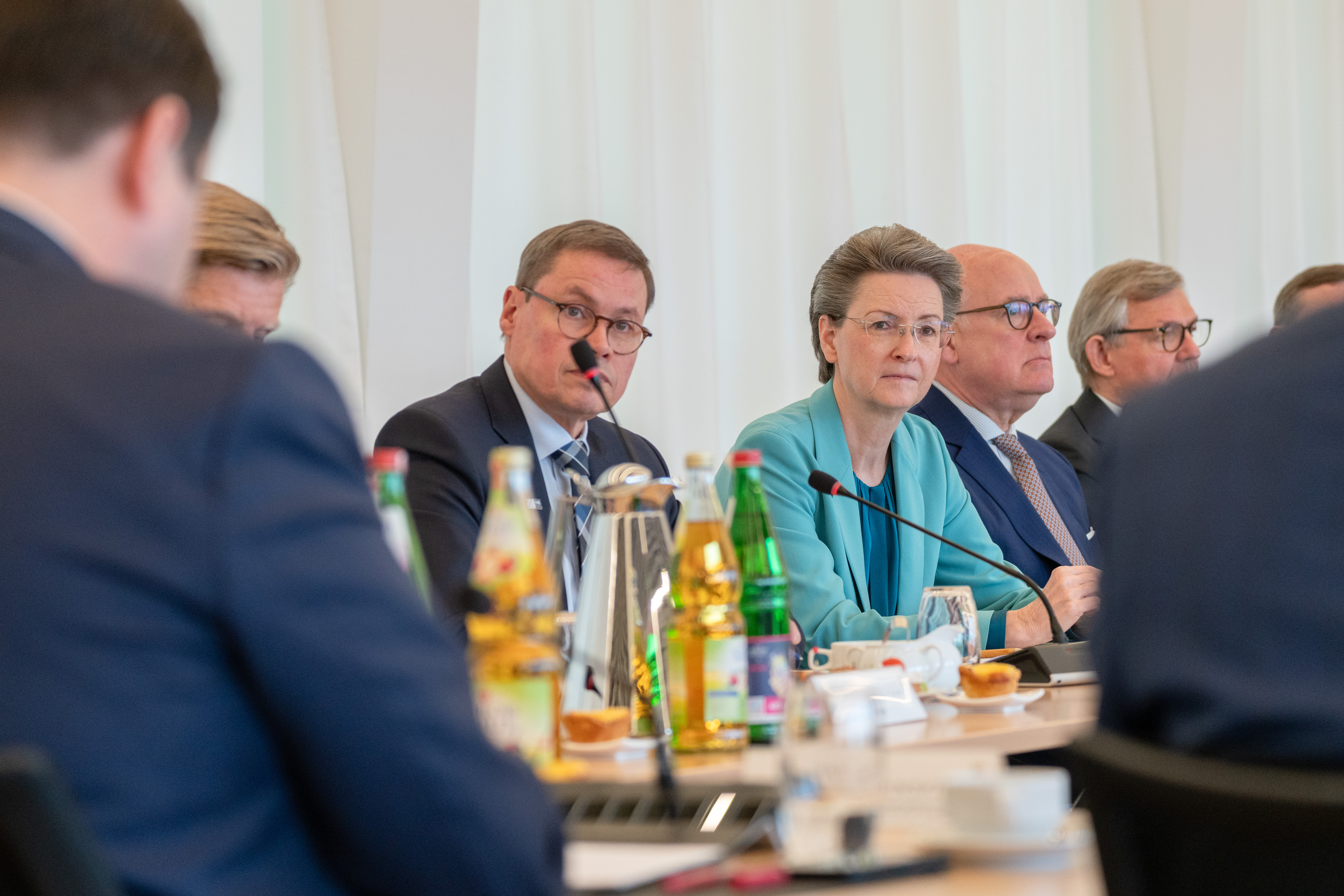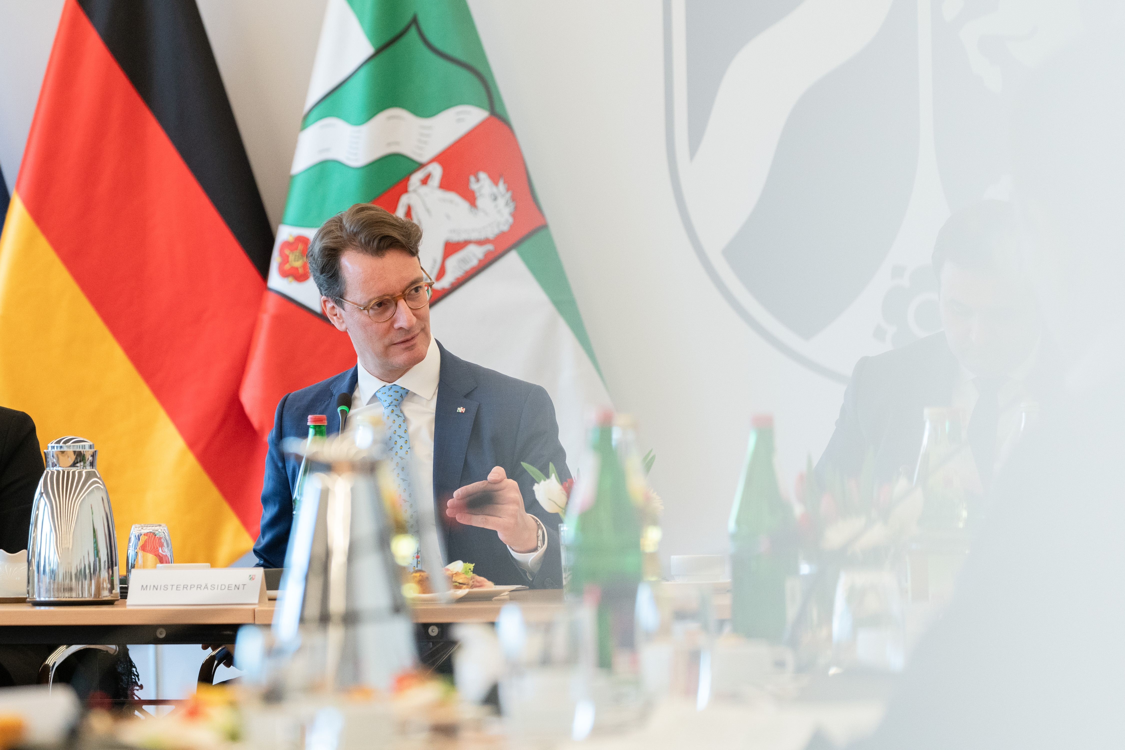 Ministerpräsident Hendrik Wüst hat am Donnerstag, 13. März 2025, Spitzenvertreterinnen und -vertreter der nordrhein-westfälischen Industrie zu einem Austausch in der Staatskanzlei empfangen. Bei dem industriepolitischen Austausch, an dem auch Wirtschaftsministerin Mona Neubaur und Minister und Chef der Staatskanzlei Nathanael Liminski teilnahmen, wurden zentrale wirtschaftliche Herausforderungen diskutiert und gemeinsame Erwartungen an die künftige Bundesregierung hinsichtlich der Stärkung der Wettbewerbsfähigkeit der nordrhein-westfälischen Industrie formuliert. Dabei wurde das Ergebnis der Sondierungsgespräche begrüßt, aber weitere Maßnahmen zur Erhöhung der Wettbewerbsfähigkeit der Industrie für erforderlich gehalten.