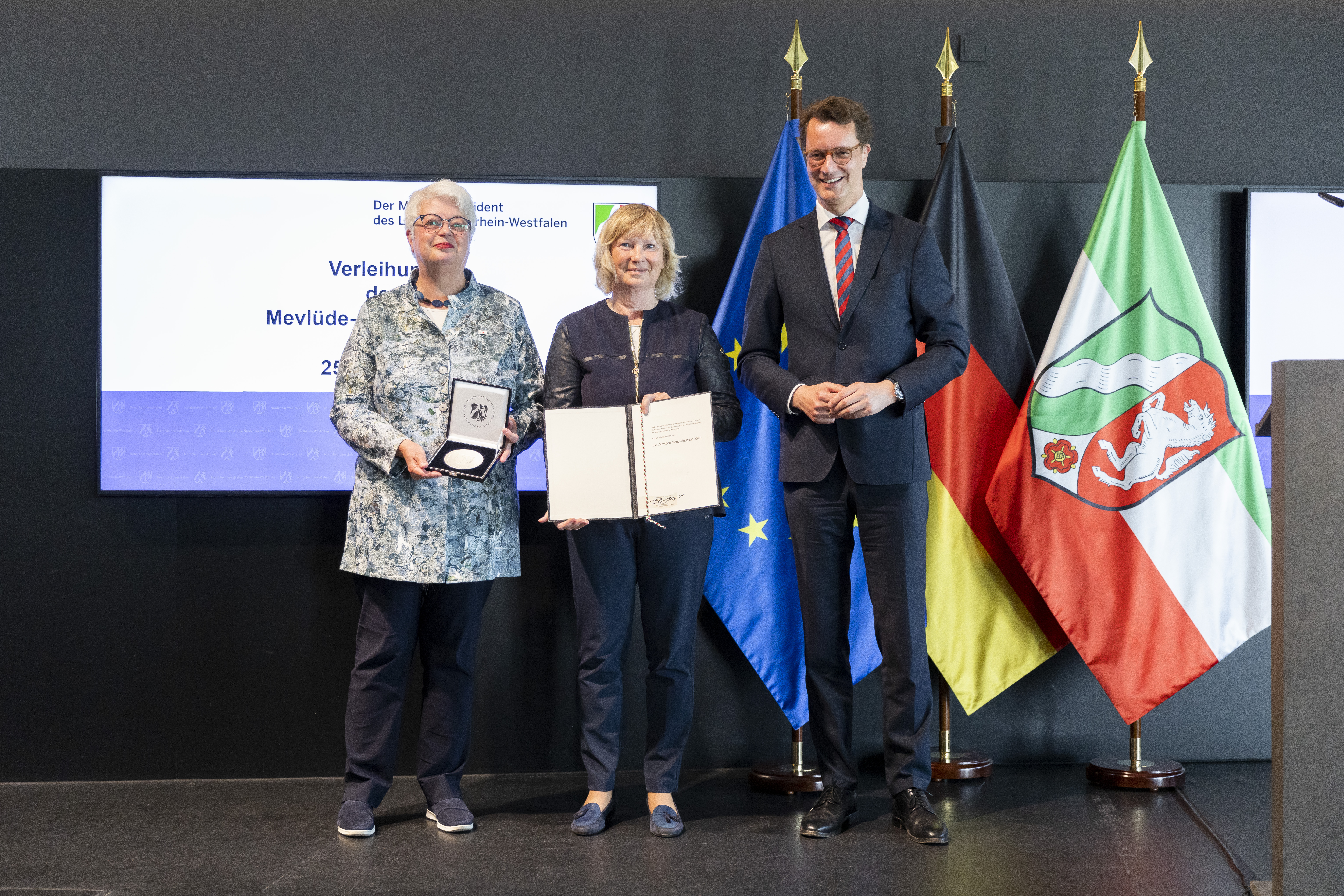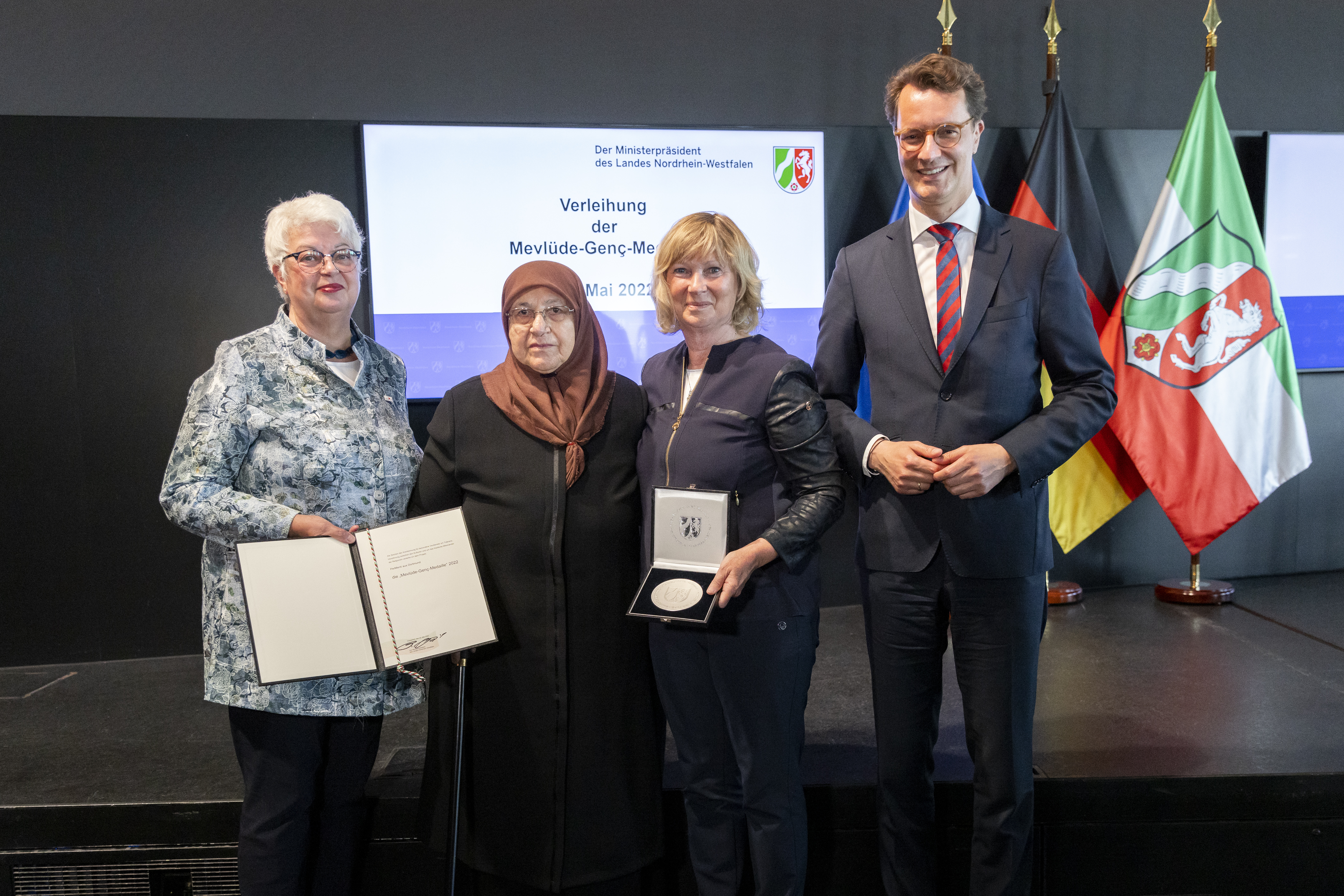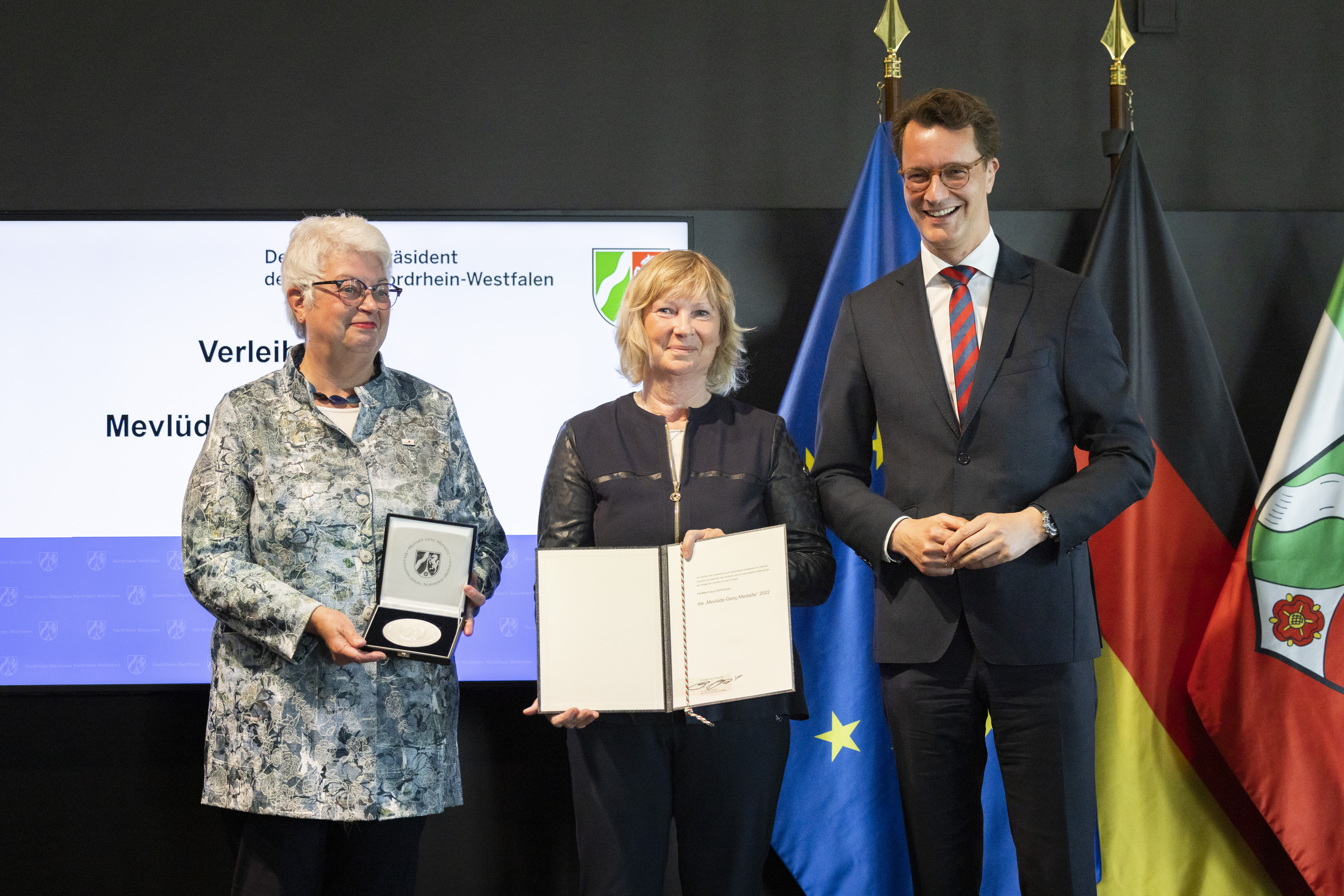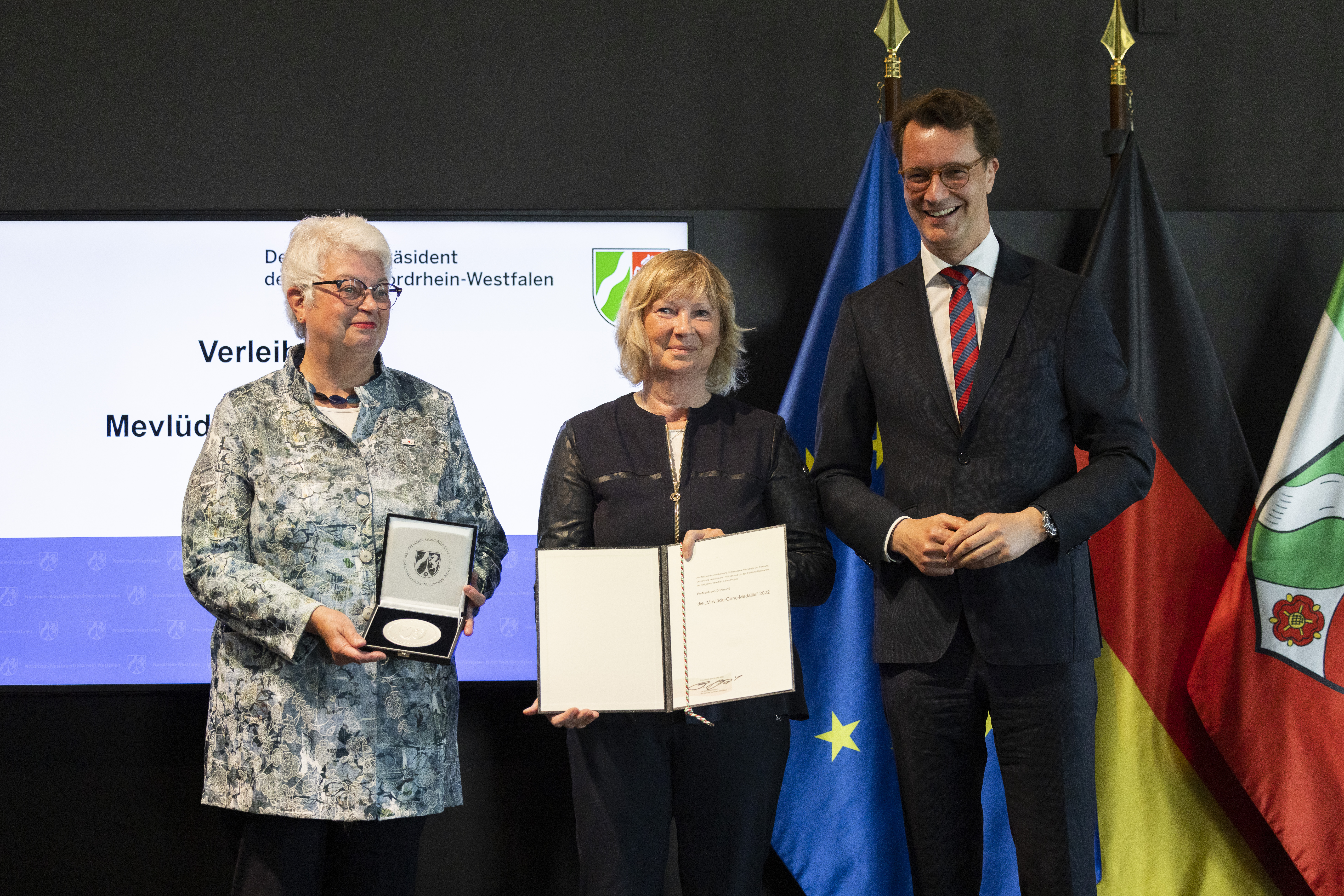 Ministerpräsident Hendrik Wüst hat am Mittwoch, 25. Mai 2022, das Projekt PerMenti mit der Mevlüde-Genç-Medaille des Landes Nordrhein-Westfalen geehrt. Projektleiterin Barbara Wenzel und ihre langjährige Wegbegleiterin Mechthild Greive nahmen die Auszeichnung stellvertretend für das Projekt entgegen. Die Ehrung fand im Rahmen einer Feierstunde im Kreativzentrum „Dortmunder U“ im Vorfeld des 29. Jahrestages des Brandanschlags von Solingen (29. Mai 1993) statt. Mit der von der Landesregierung gestifteten Medaille zeichnet der Ministerpräsident jährlich Personen oder Gruppen aus, die sich im Sinne von Mevlüde Genç im Besonderen um Toleranz und Versöhnung zwischen den Kulturen und ein friedliches Miteinander der Religionen in Nordrhein-Westfalen verdient gemacht haben. Mevlüde Genç nahm gemeinsam mit ihrem Mann Durmuş Genç und zwei Enkelkindern an der Preisverleihung teil.