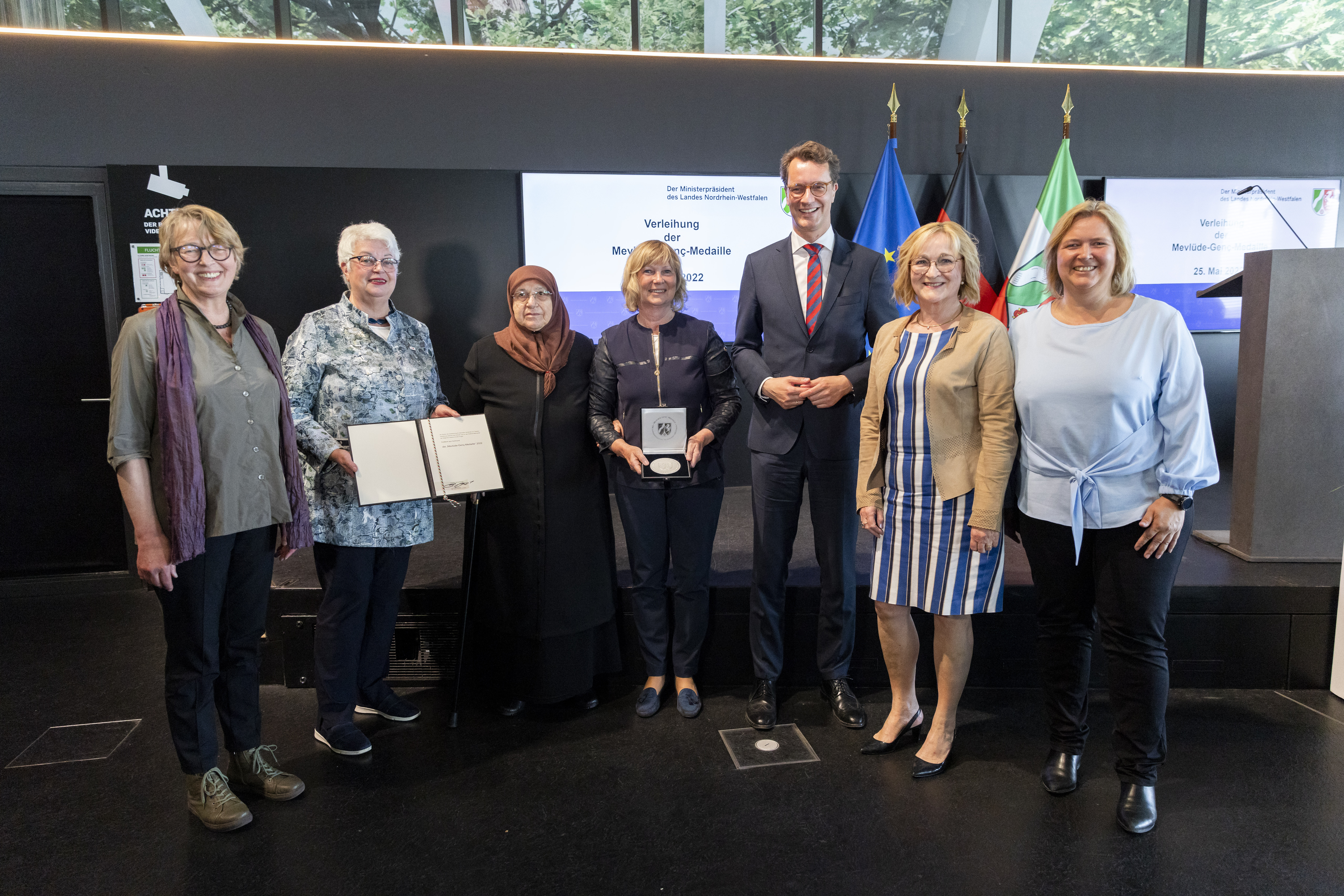 Die Landesregierung hat 2018 die Mevlüde-Genç-Medaille für besondere Verdienste um Toleranz, Versöhnung zwischen den Kulturen und um das friedliche Miteinander der Religionen gestiftet. Der Name geht auf Mevlüde Genç zurück. Sie und ihr Mann Durmuş Genç verloren zwei Töchter, zwei Enkelkinder und eine Nichte, als in der Nacht des 29. Mai 1993 vier Jugendliche Brandsätze in das Haus der Familie Genç in der Untere Wernerstraße in Solingen warfen. 17 Familienmitglieder wurden bei der Tat mit rechtsextremem Hintergrund zum Teil sehr schwer verletzt und leiden noch heute an den Folgen.