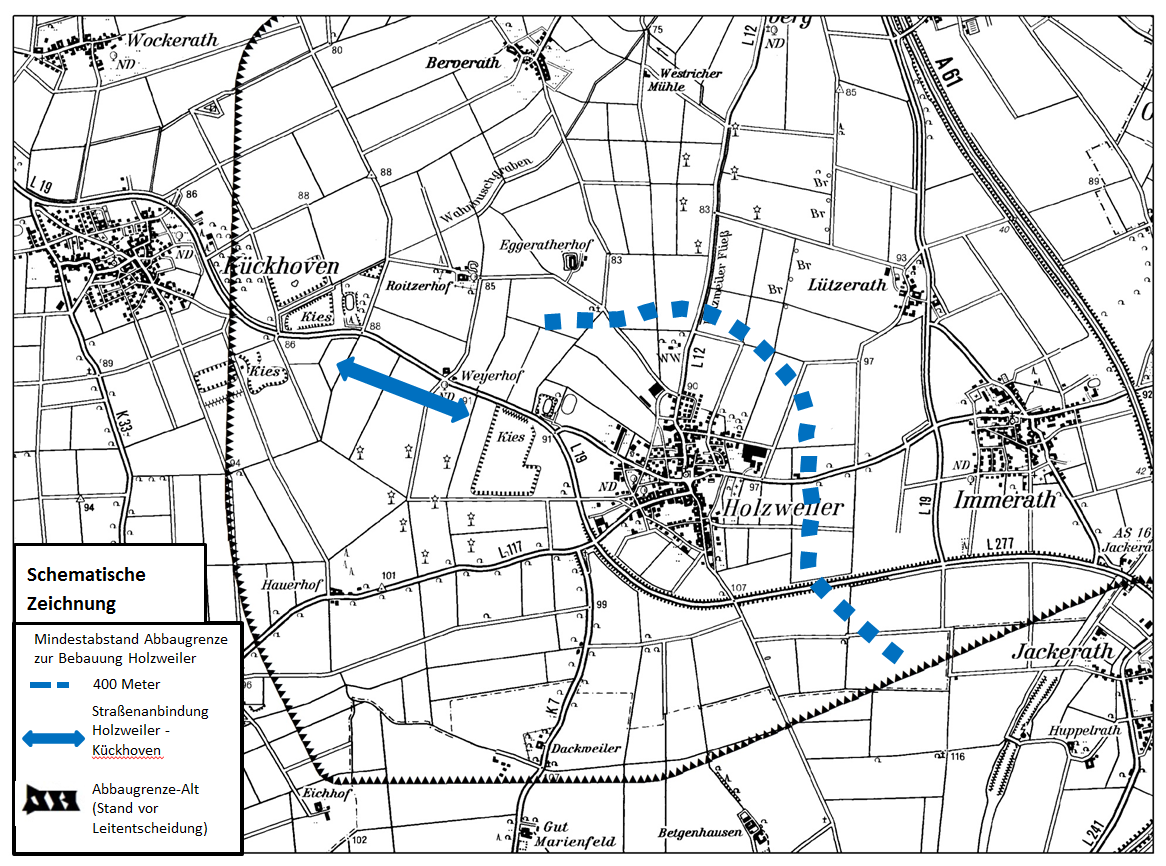 Um eine positive Entwicklung von Holzweiler zu gewährleisten, ist der Abbaubereich des Tagebaus Garzweiler II so zu verkleinern, dass der Tagebau an Holzweiler nur von zwei Ortsseiten heranrückt und eine Insellage vermieden wird. Dabei ist ein Mindestabstand von 400 m zur Abbaugrenze zu gewährleisten. Eine direkte Anbindung an Kückhoven und Erkelenz ist zu gewährleisten, soweit möglich soll die L 19 erhalten bleiben. Der Uferbereich des Restsees ist so zu modellieren, dass eine Zwischennutzung des Sees während des Füllvorgangs möglich ist. Bei den vom Abbau betroffenen Höfen ist die Existenz der landwirtschaftlichen Betriebe zu erhalten.