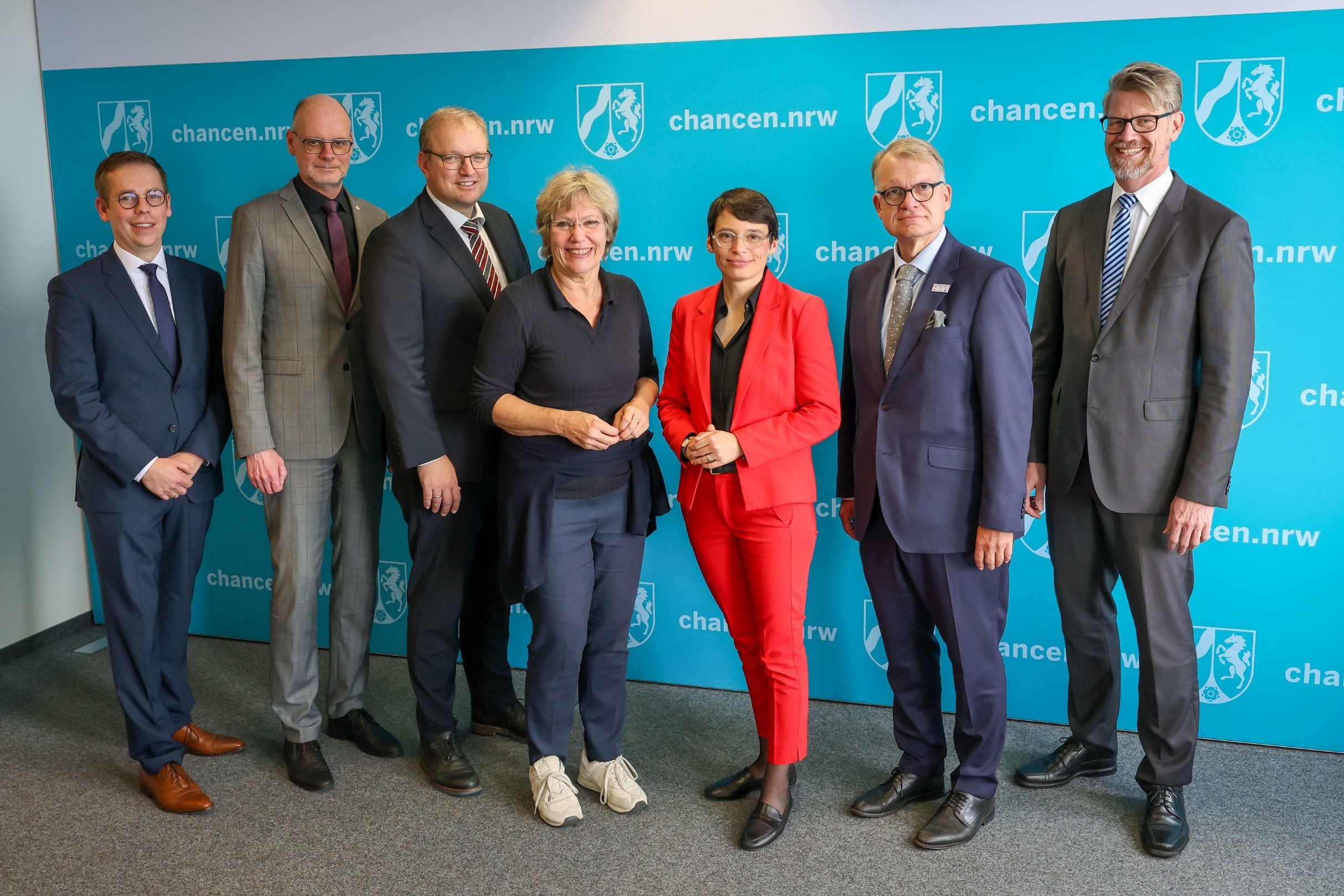 V.l.n.r.: Florian Strecker (Katholisches Büro NRW), Christof Sommer (Hauptgeschäftsführer Städte- und Gemeindebund NRW), Martin Engels (Beauftragter der Evangelischen Kirche bei Landtag und Landesregierung in Nordrhein-Westfalen), Daniela Schneckenburger (Beigeordnete Städtetag NRW), Ministerin Josefine Paul (MKJFGFI NRW), Hartmut Krabs-Höhler (Vorsitzender Landesarbeitsgemeinschaft der Freien Wohlfahrtspflege NRW), Dr. Kai Zentara (Beigeordneter Landkreistag NRW)