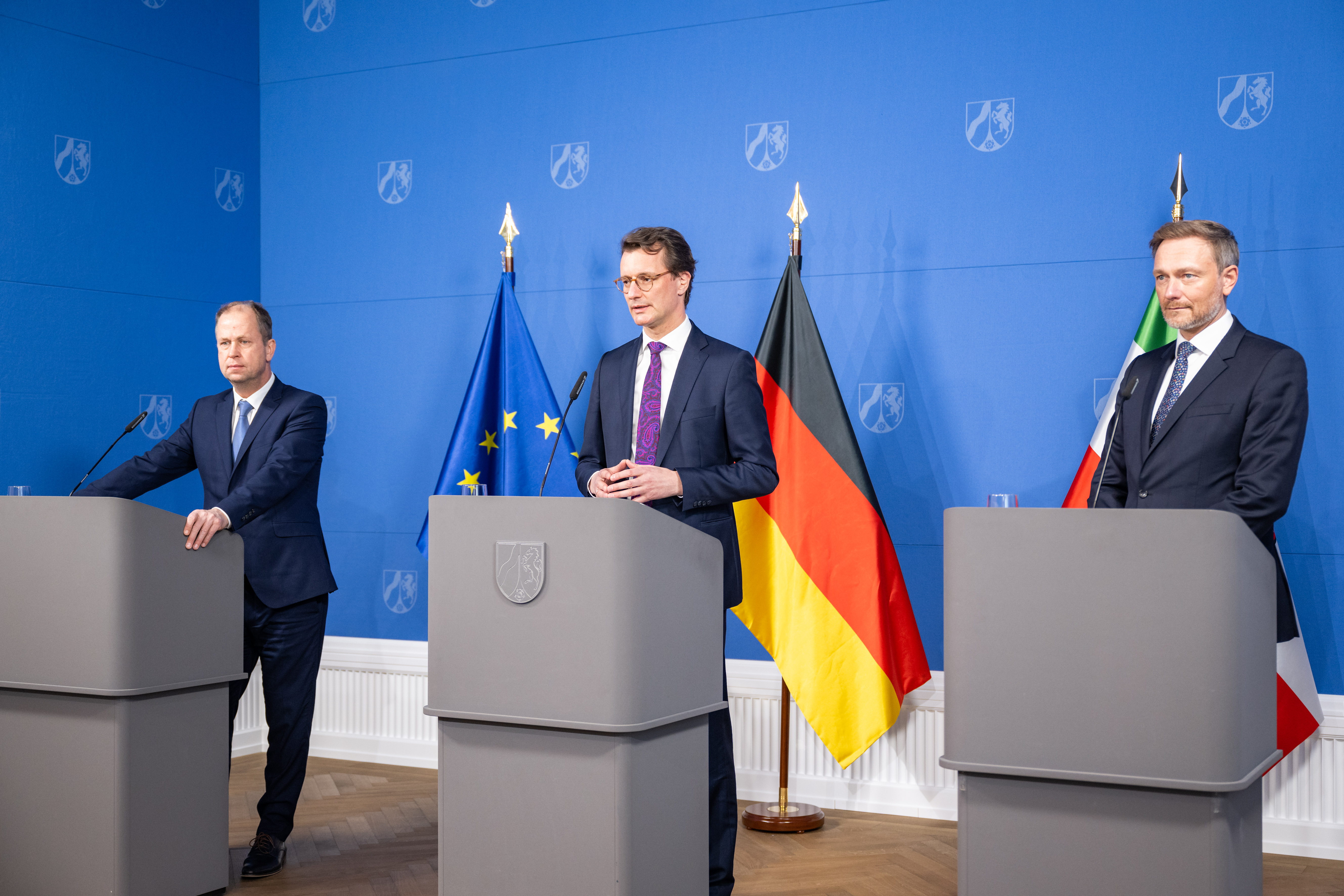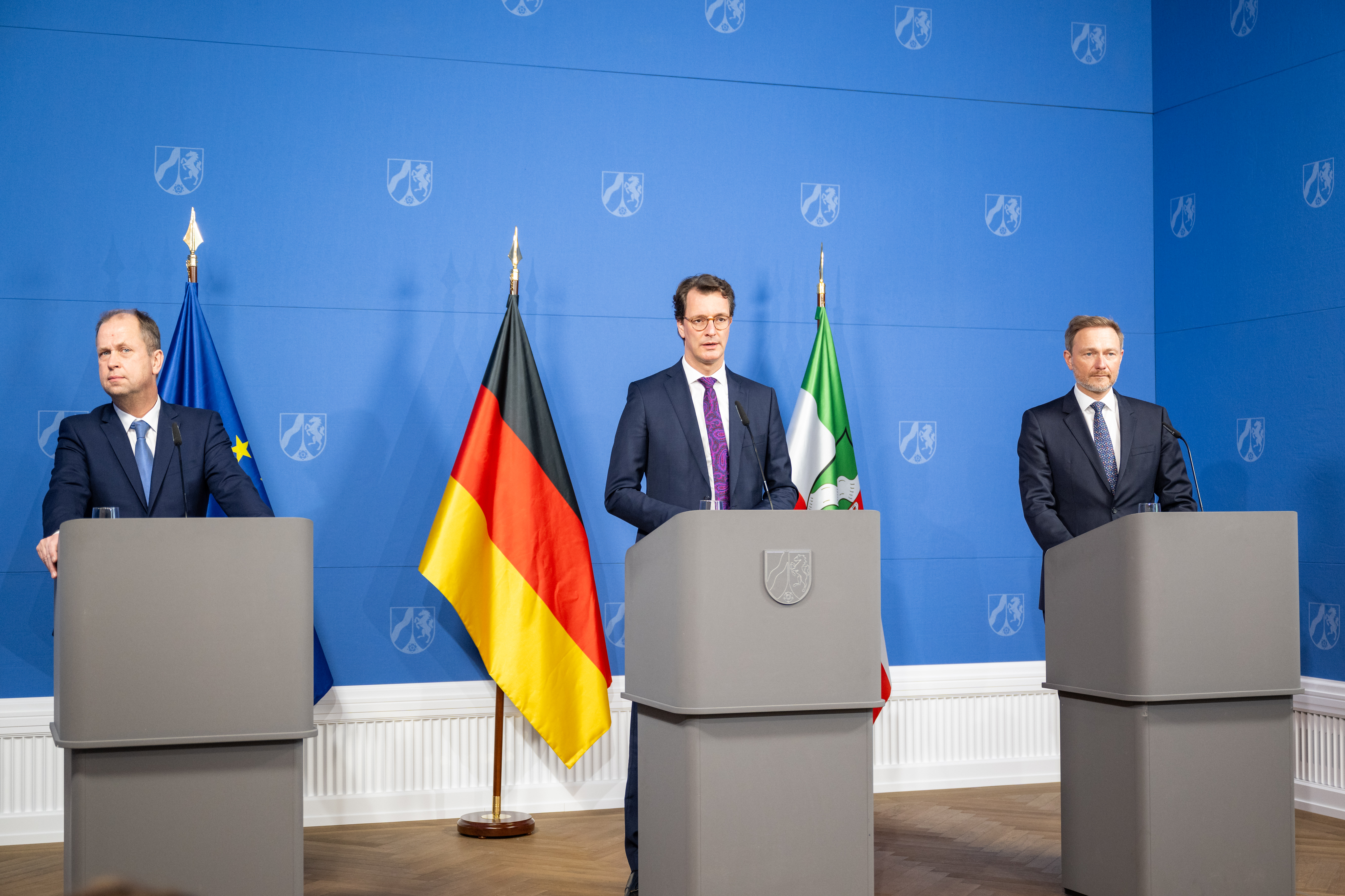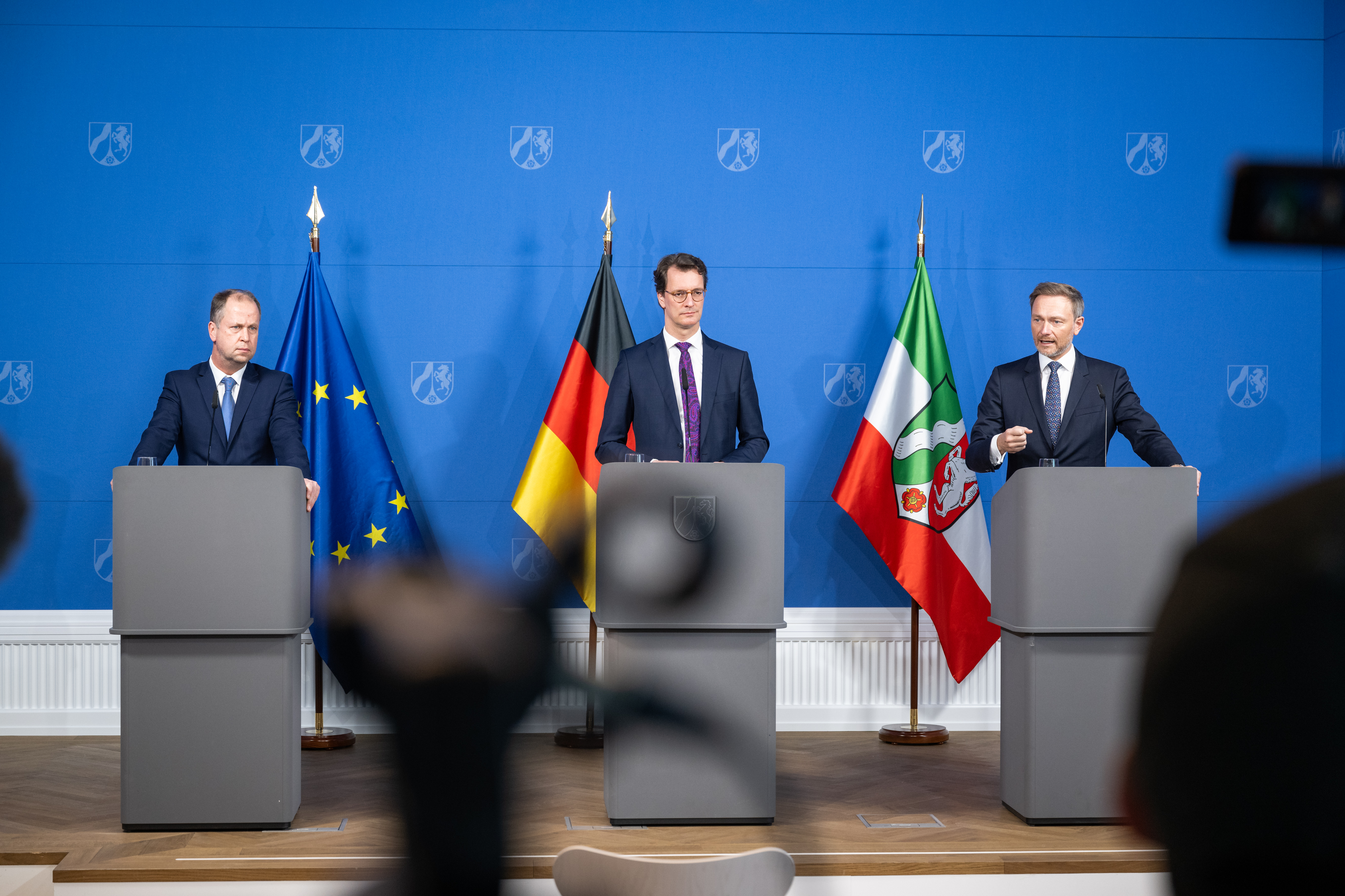 Gemeinsame Pressekonferenz im Anschluss an den Besuch von Bundesminister der Finanzen Christian Lindner mit Ministerpräsident Hendrik Wüst und dem stellvertretenden Ministerpräsidenten und Minister für Kinder, Familie, Flüchtlinge und Integration Dr. Joachim Stamp.