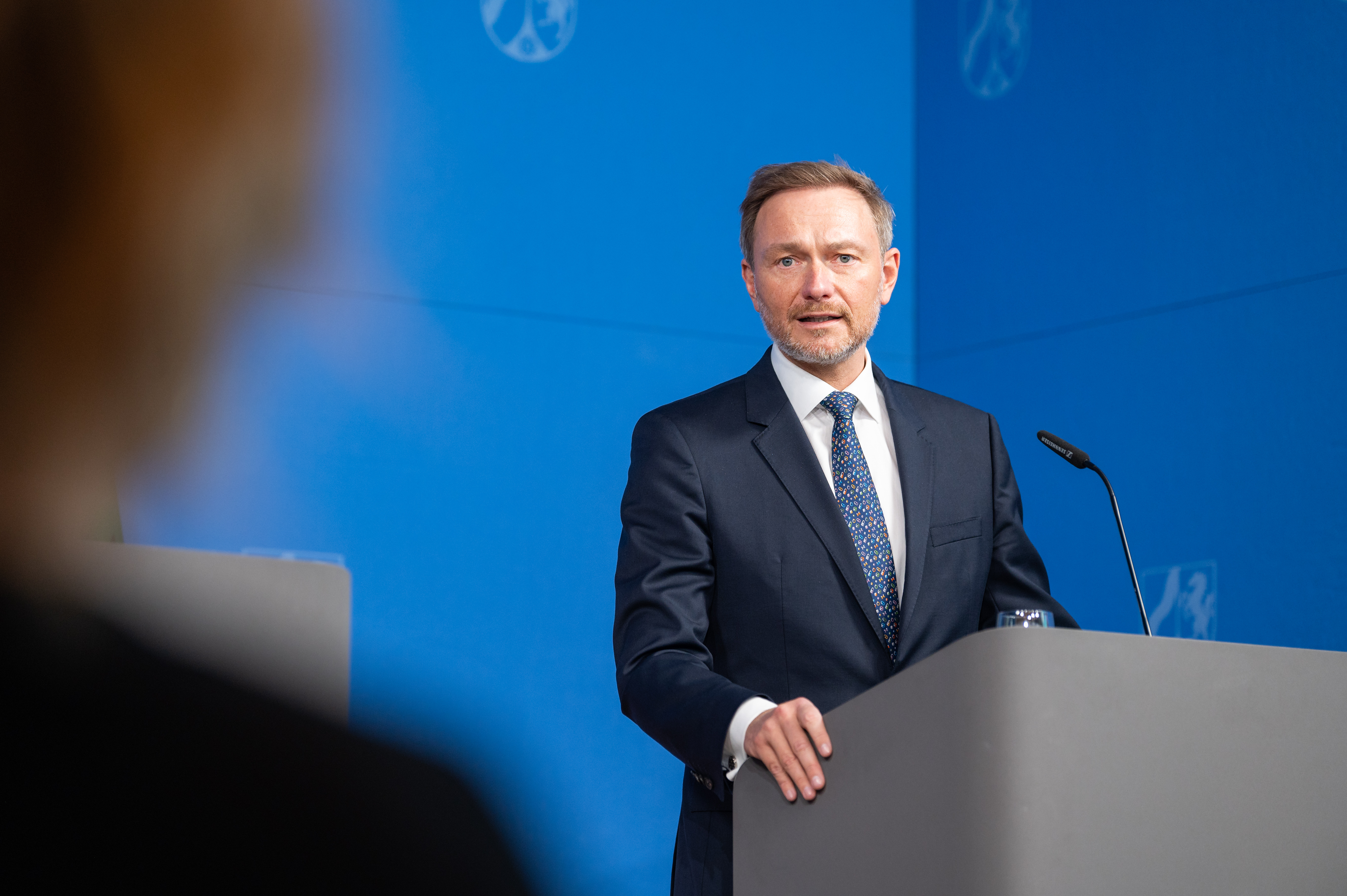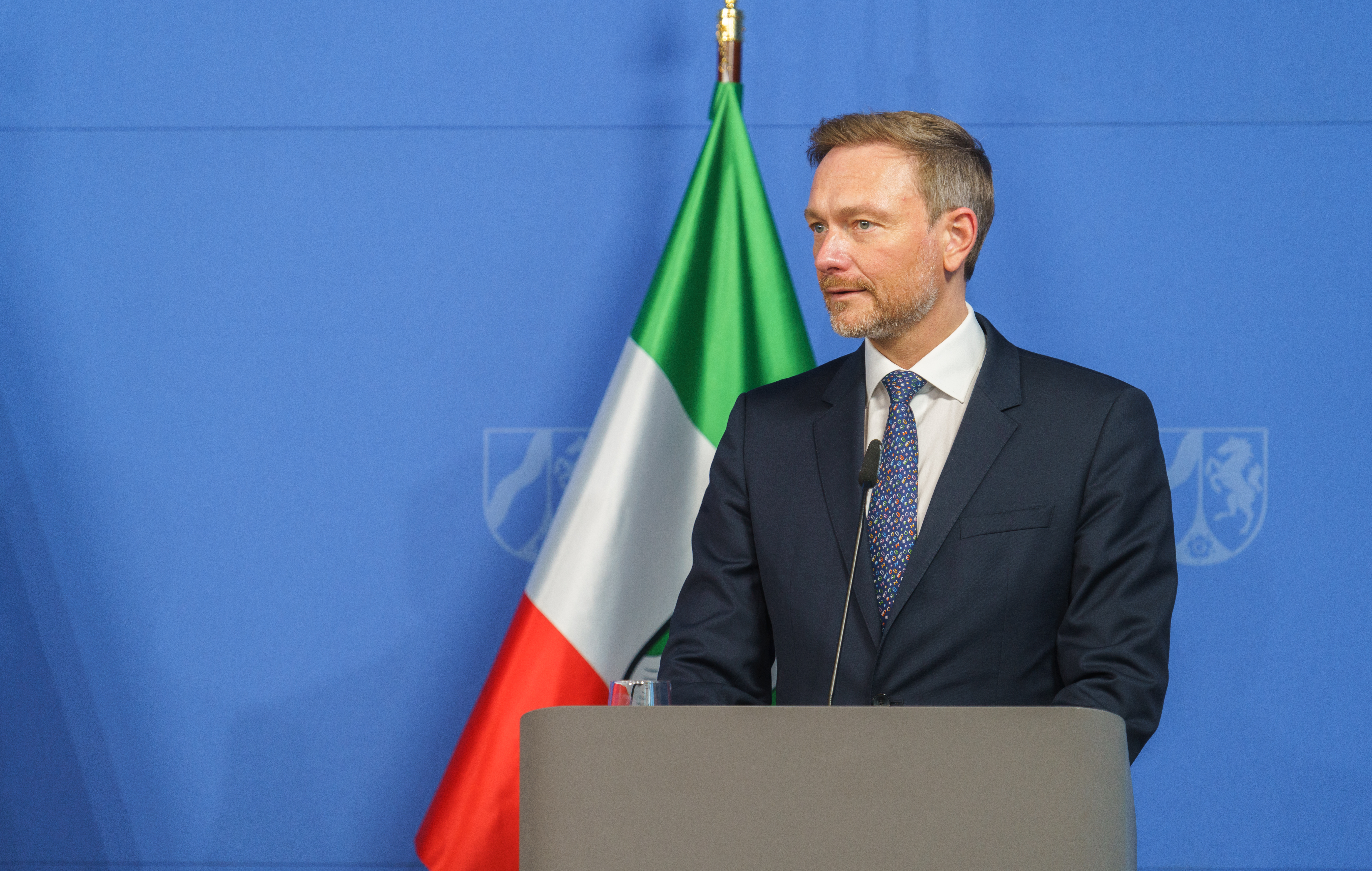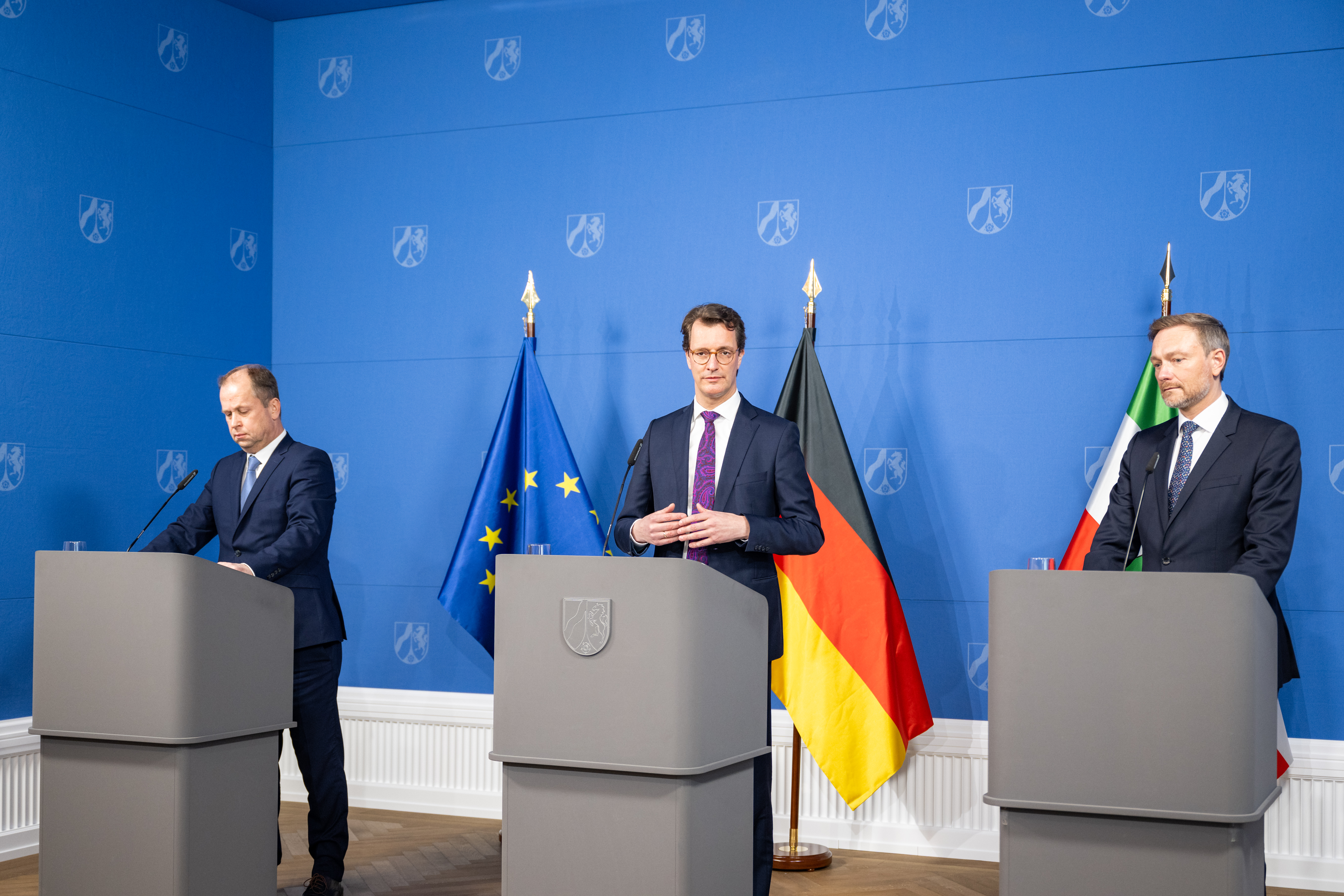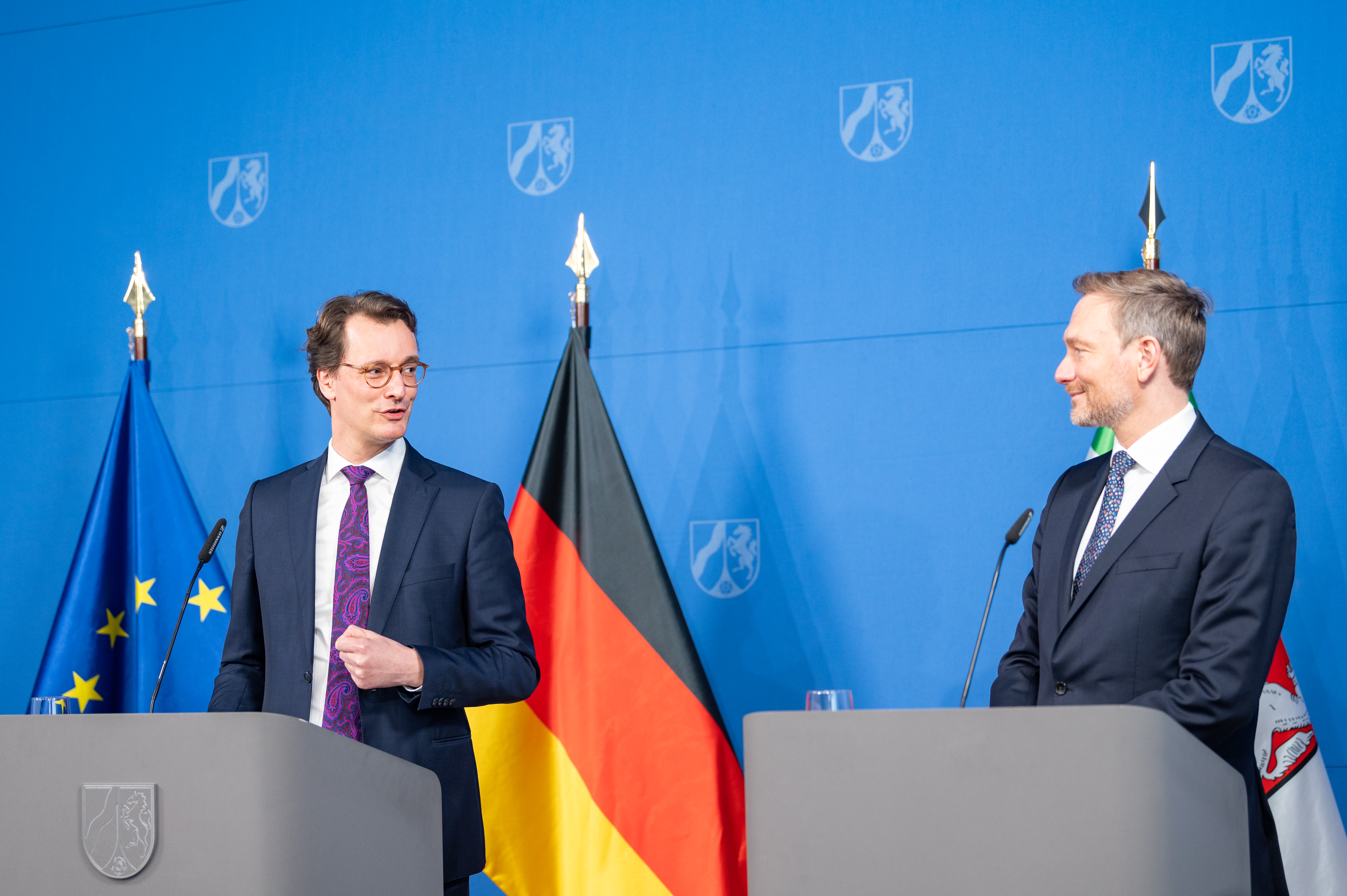 Gemeinsame Pressekonferenz im Anschluss an den Besuch von Bundesminister der Finanzen Christian Lindner mit Ministerpräsident Hendrik Wüst und dem stellvertretenden Ministerpräsidenten und Minister für Kinder, Familie, Flüchtlinge und Integration Dr. Joachim Stamp.