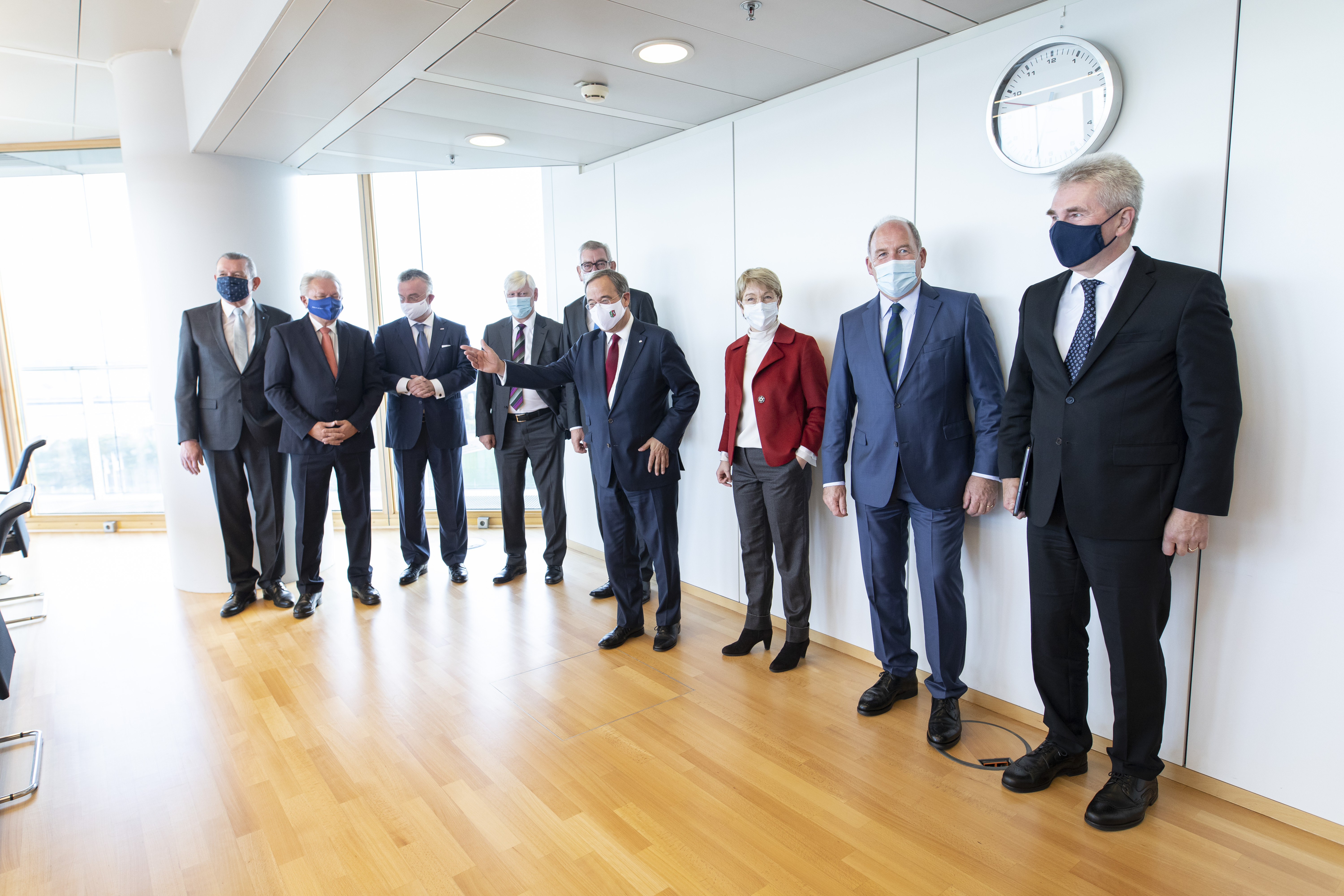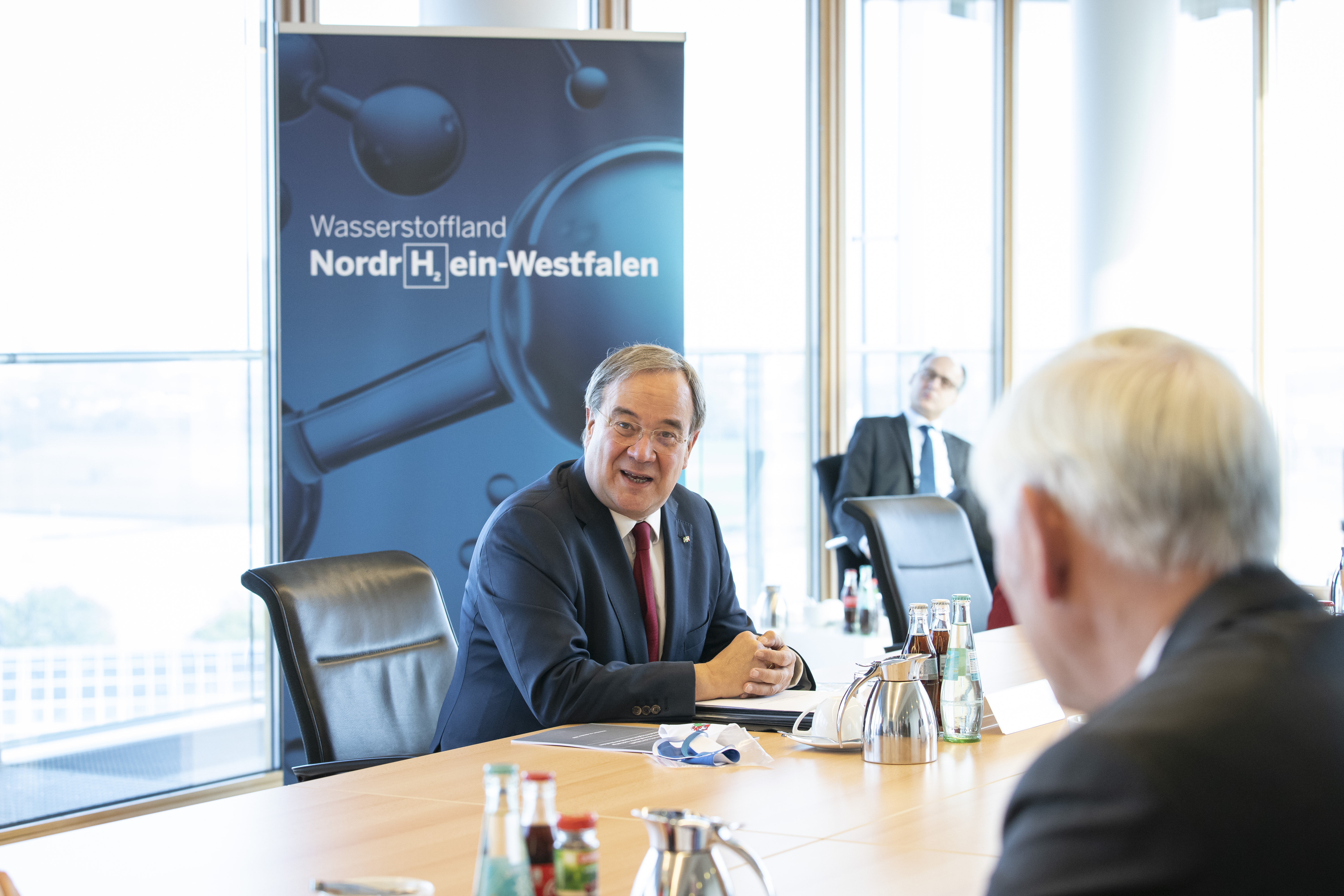 Ministerpräsident Armin Laschet und Wirtschafts- und Digitalminister Prof. Dr. Andreas Pinkwart haben Vorstandsvorsitzende und Inhaber nordrhein-westfälischer Unternehmen zu einem branchenübergreifenden Spitzengespräch Wasserstoff in Düsseldorf getroffen.