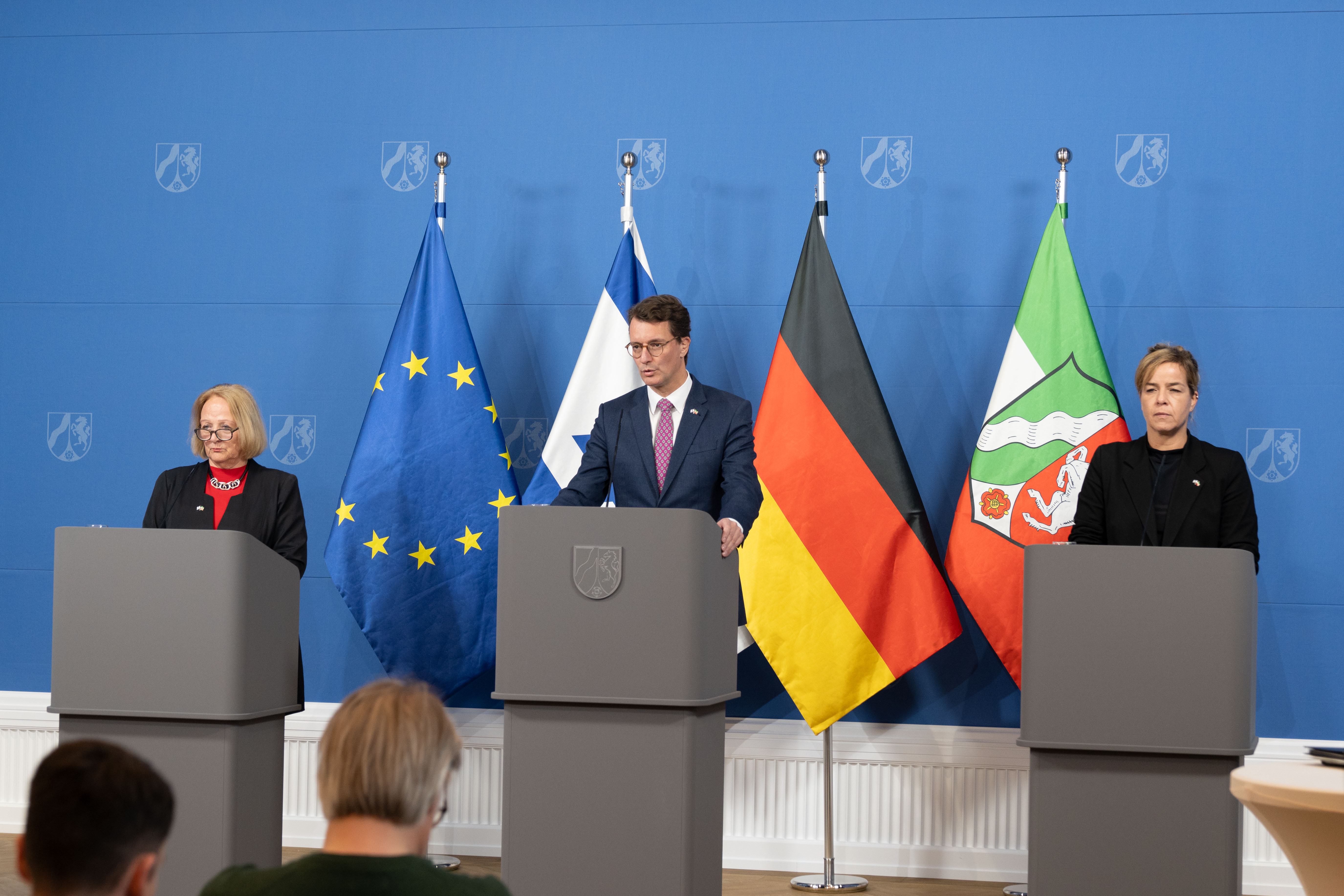 Am Mittwoch, 8. November 2023, haben Ministerpräsident Hendrik Wüst, die stellvertretende Ministerpräsidentin und Ministerin für Wirtschaft, Industrie, Klimaschutz und Energie Mona Neubaur und die Antisemitismusbeauftragte Sabine Leutheusser-Schnarrenberger die Landeskampagne #NieWiederIstJetzt und einen 10-Punkte-Plan gegen Antisemitismus vorgestellt.