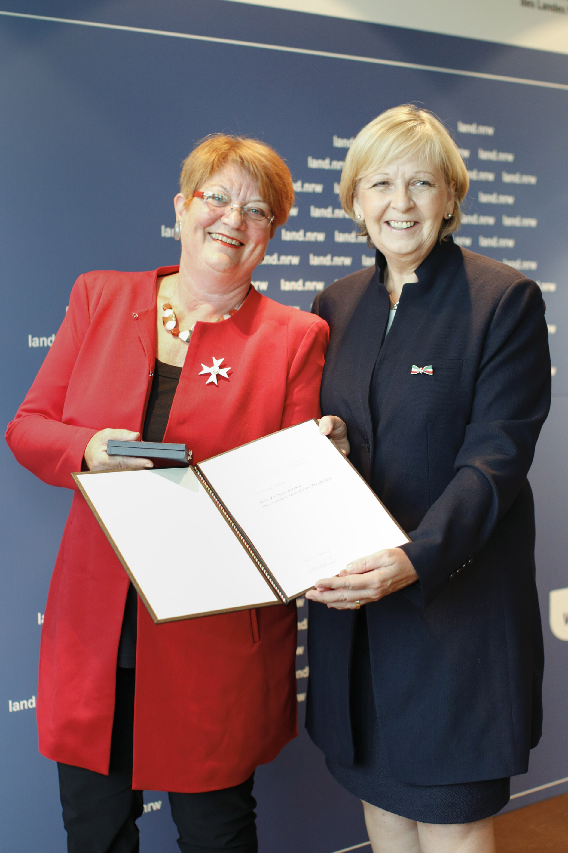 An die Ausgezeichneten gewandt sagte Hannelore Kraft: „Der Orden ist unsere Art, ‚Danke‘ zu sagen für außergewöhnliche Leistungen, die teilweise über Jahrzehnte erbracht worden sind. Was wäre das Land, wenn es nicht solche aufopferungsvollen Menschen gäbe? Ich meine, es wäre viel kälter und nicht so lebens- und liebenswert, wie es ist.“