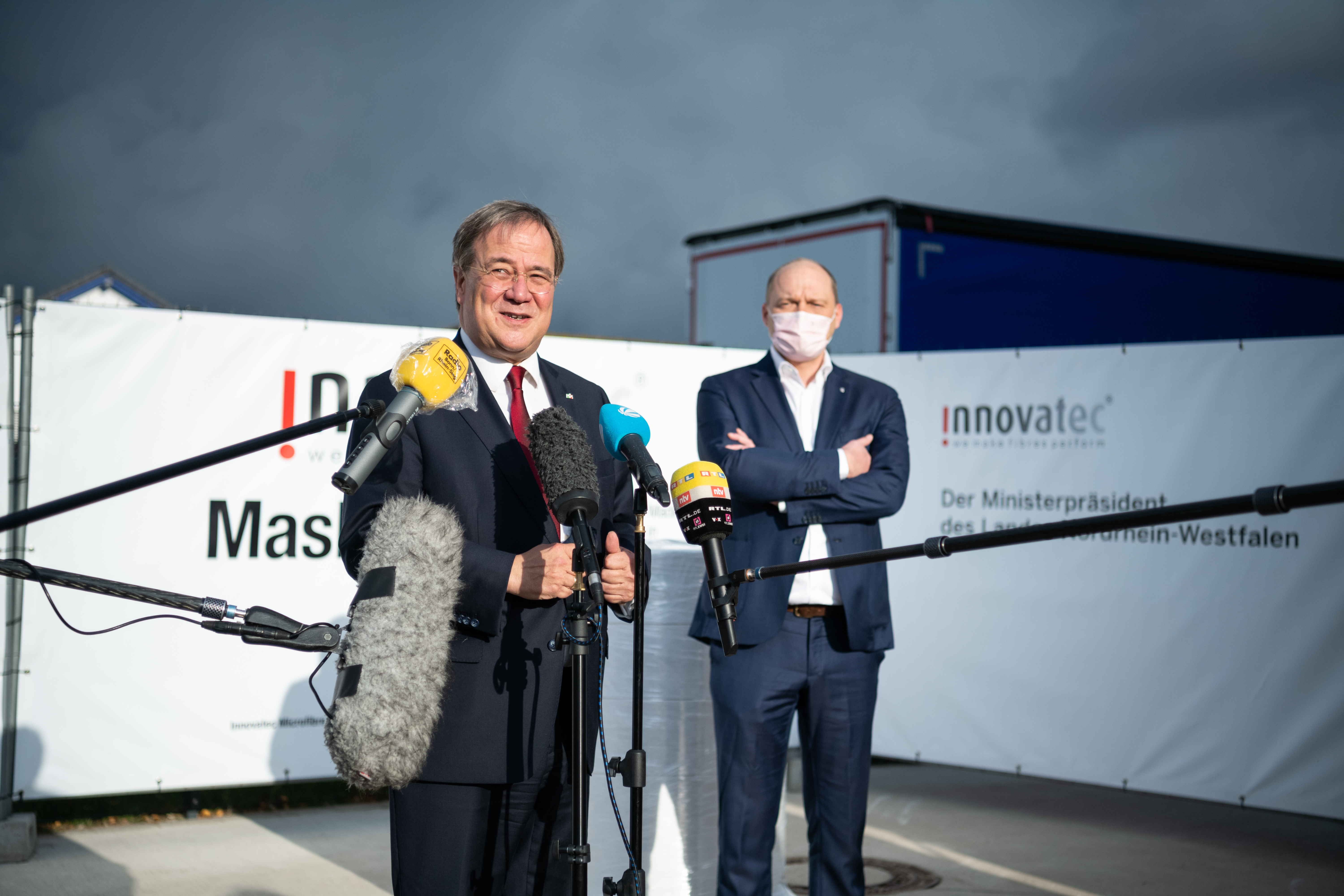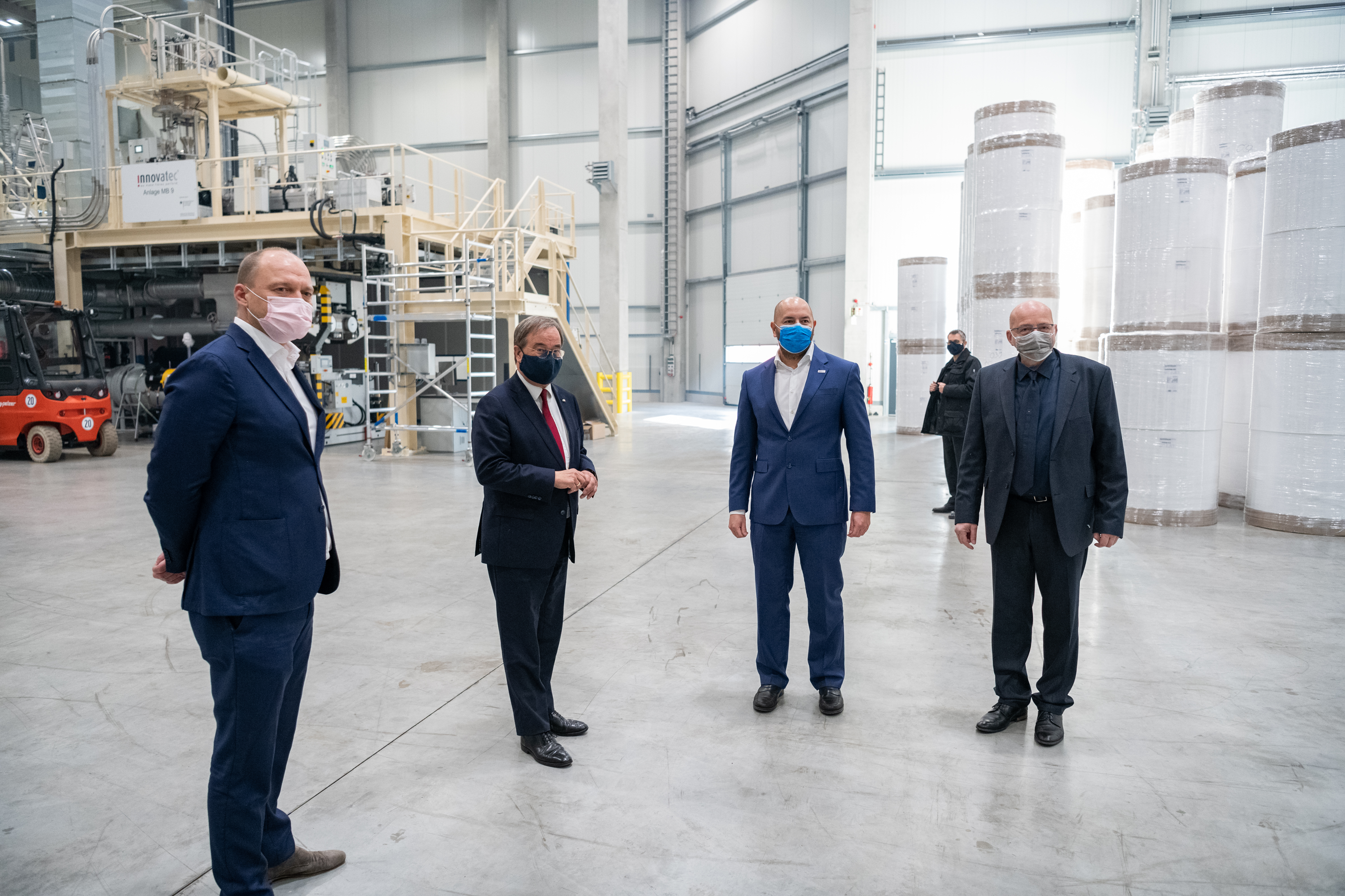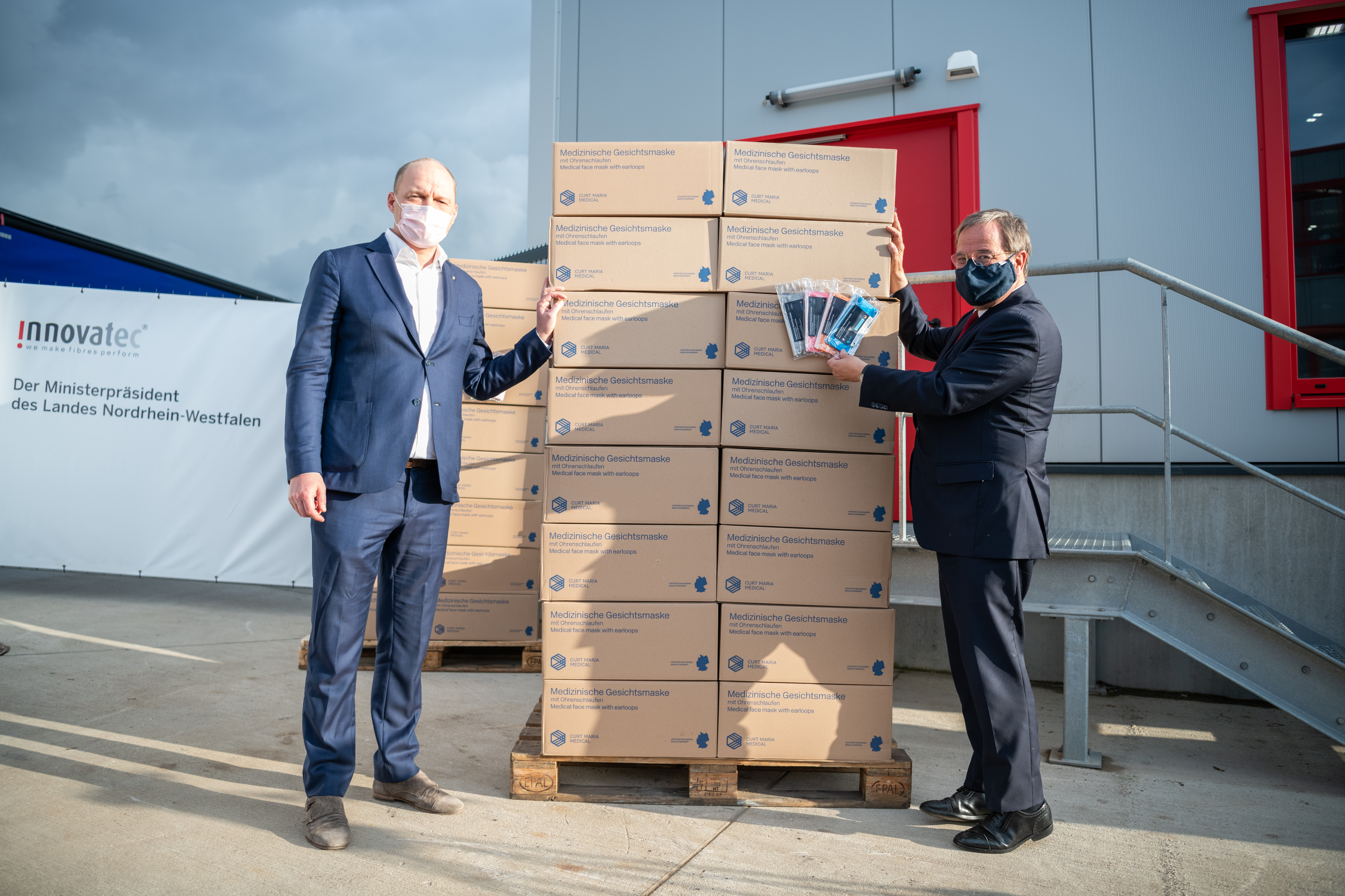 Innovatec ist Weltmarktführer für Meltblown-Vlies. Mit Beginn der Corona-Krise im Frühjahr hat das Unternehmen seine Produktion von Meltblown-Vlies hochgefahren. Im Juni 2020 erhielt Innovatec Bundesmittel zur Anschaffung von zwei neuen Meltblown-Anlagen mit einem Vliesausstoß für bis zu 2,5 Milliarden OP-Masken oder 1 Milliarde FFP2-Masken. Meltblown ist ein mikrofeines Kunststoffvlies, das in OP- und FFP-Masken als Filtermedium gegen Viren und Bakterien eingesetzt wird. Mit den Fördergeldern nimmt Innovatec zwei hochmoderne Meltblown-Anlagen in seiner neu erbauten Produktionshalle in Troisdorf in Betrieb.Inhaber Christian Klöber und Geschäftsführer Daniel Krumme überreichten dem Ministerpräsidenten bei seinem Besuch zwei Paletten bzw. 80.000 OP-Masken. „Diese Masken sind zu 100 Prozent Made in NRW und sollen unter anderem – als Spende – an die Uniklinik Düsseldorf gehen: An diejenigen, die tagtäglich an der vordersten Corona-Front im Einsatz für die Gesundheit ihrer Mitmenschen sind! Das ist unsere Anerkennung und unser Dank, aber auch ein Signal an die Bevölkerung, weiterhin solidarisch die Maßnahmen in der Corona-Bekämpfung zu unterstützen“, so Christian Klöber.
