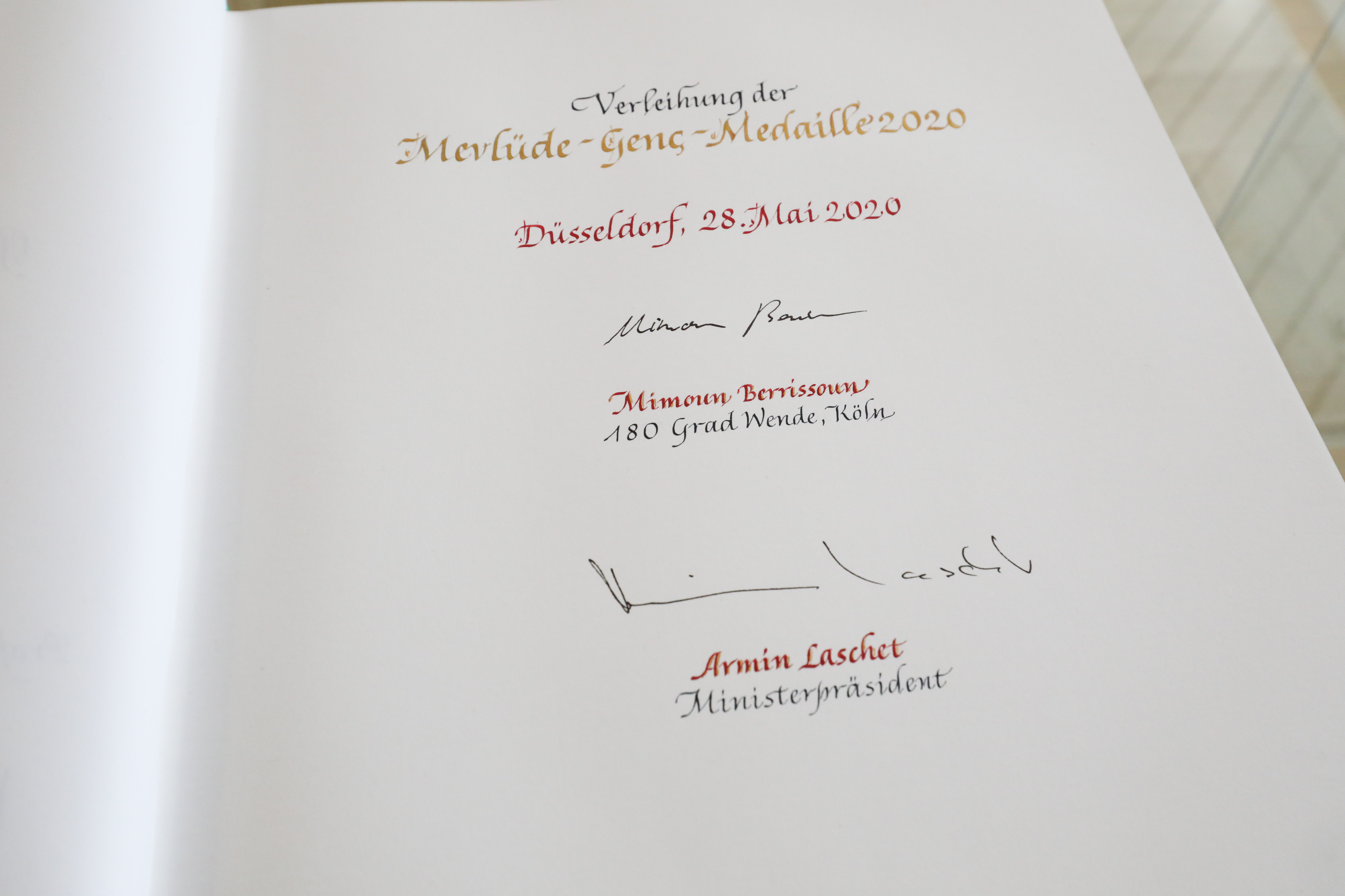 Ministerpräsident Armin Laschet hat am Donnerstag, 28. Mai 2020, Mimoun Berrissoun, dem Leiter und Mitgründer der Initiative „180 Grad Wende“ die Mevlüde-Genç-Medaille des Landes Nordrhein-Westfalen im Rahmen einer Feierstunde in der Staatskanzlei in Düsseldorf verliehen. Die Ehrung fand am Vortag des 27. Jahrestages des Brandanschlags von Solingen statt. Der Ministerpräsident stiftet und zeichnet jährlich Einzelpersonen und Vereine aus, die im Sinne von Mevlüde Genç einen besonderen Einsatz für mehr gesellschaftliche, religiöse und kulturelle Toleranz und Versöhnung geleistet haben und sich für das gemeinsame friedliche Miteinander stark machen.