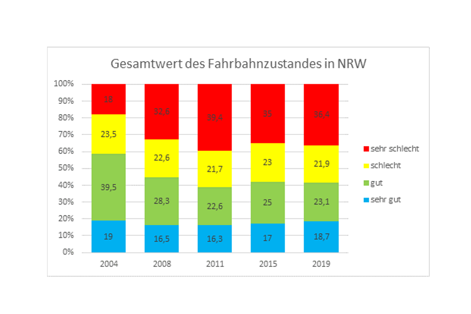 Die Dringlichkeit der Sanierungsoffensive unterstreicht auch der aktuell veröffentlichte Straßenzustandsbericht für Nordrhein-Westfalen. Vor dem Hintergrund der zunehmenden Verkehrsbelastung, insbesondere des Schwerlastverkehrs, ist erkennbar, dass es aufgrund der zu geringen Erhaltungsinvestitionen der Vergangenheit zu einer stetigen Verschlechterung des Fahrbahnzustandes von 2004 bis 2011 kam.