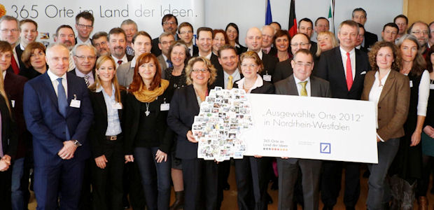 68 der „365 Orte im Land der Ideen“ kamen im Wettbewerbsjahr 2012 aus Nordrhein-Westfalen. Svenja Schulze, Ministerin für Innovation, Wissenschaft und Forschung des Landes Nordrhein-Westfalen, begrüßte anlässlich eines Empfangs in der Staatskanzlei diese „Ausgewählten Orte 2012“. Die Preisträger des Wettbewerbs sind Beispiele für die ausgeprägte Innovationskultur Deutschlands und Spiegelbild bedeutender Zukunftstrends. Um das Engagement der Menschen zu fördern und vorbildliche Ideen sichtbar zu machen, realisiert die Initiative „Deutschland – Land der Ideen“ gemeinsam mit der Deutschen Bank bereits seit 2006 den bundesweiten Wettbewerb „365 Orte im Land der Ideen“. Alle 365 Preisträger präsentierten sich im Laufe des Jahres 2012 jeweils an einem speziellen Tag als „Ausgewählter Ort“ der Öffentlichkeit.