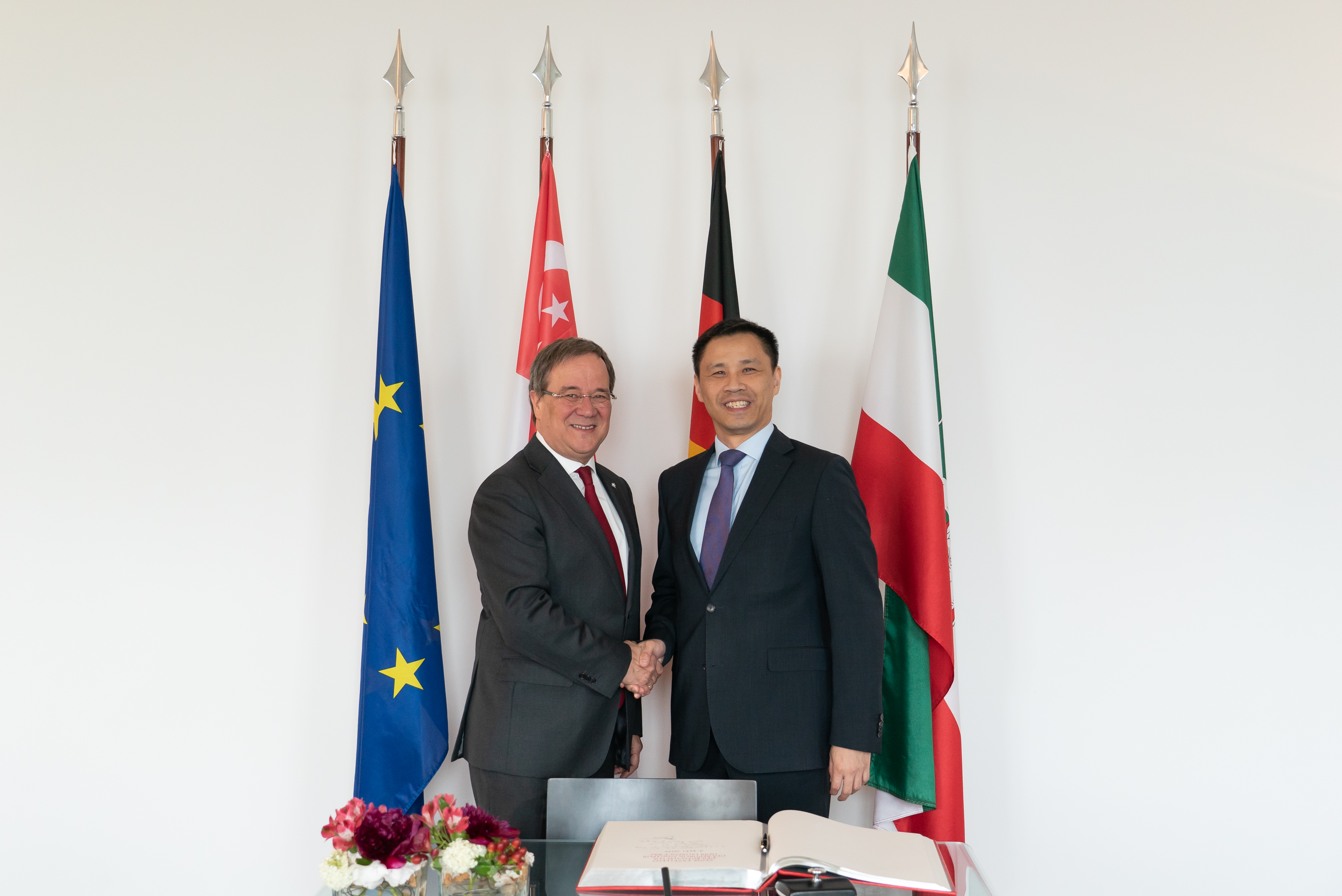 Nach dem Eintrag in das Gästebuch der Landesregierung tauschen sich Ministerpräsident Armin Laschet und Botschafter Laurence Bay Siow Hon über die wirtschaftliche Zusammenarbeit beider Länder aus: „Singapur und Nordrhein-Westfalen mögen dreizehn Flugstunden voneinander entfernt sein, aber uns verbindet trotzdem vieles: Beide Länder verfügen über eine hochindustrialisierte, erfolgreiche und exportorientierte Marktwirtschaft. Für Nordrhein-Westfalen, als starkes Exportland, ist Singapur eine wichtige Logistikdrehscheibe im globalen Welthandel. Als eines der bedeutendsten Finanzzentren Asiens und einflussreicher Innovationstreiber auf dem Gebiet der Digitalisierung ist Singapur für Nordrhein-Westfalen ein attraktiver Partner. Singapur verfügt für Nordrhein-Westfalen über ein großes Potenzial für Unternehmenskooperationen, zum Beispiel bei IT-, Bio- und Gentechnologien“, so Ministerpräsident Armin Laschet.