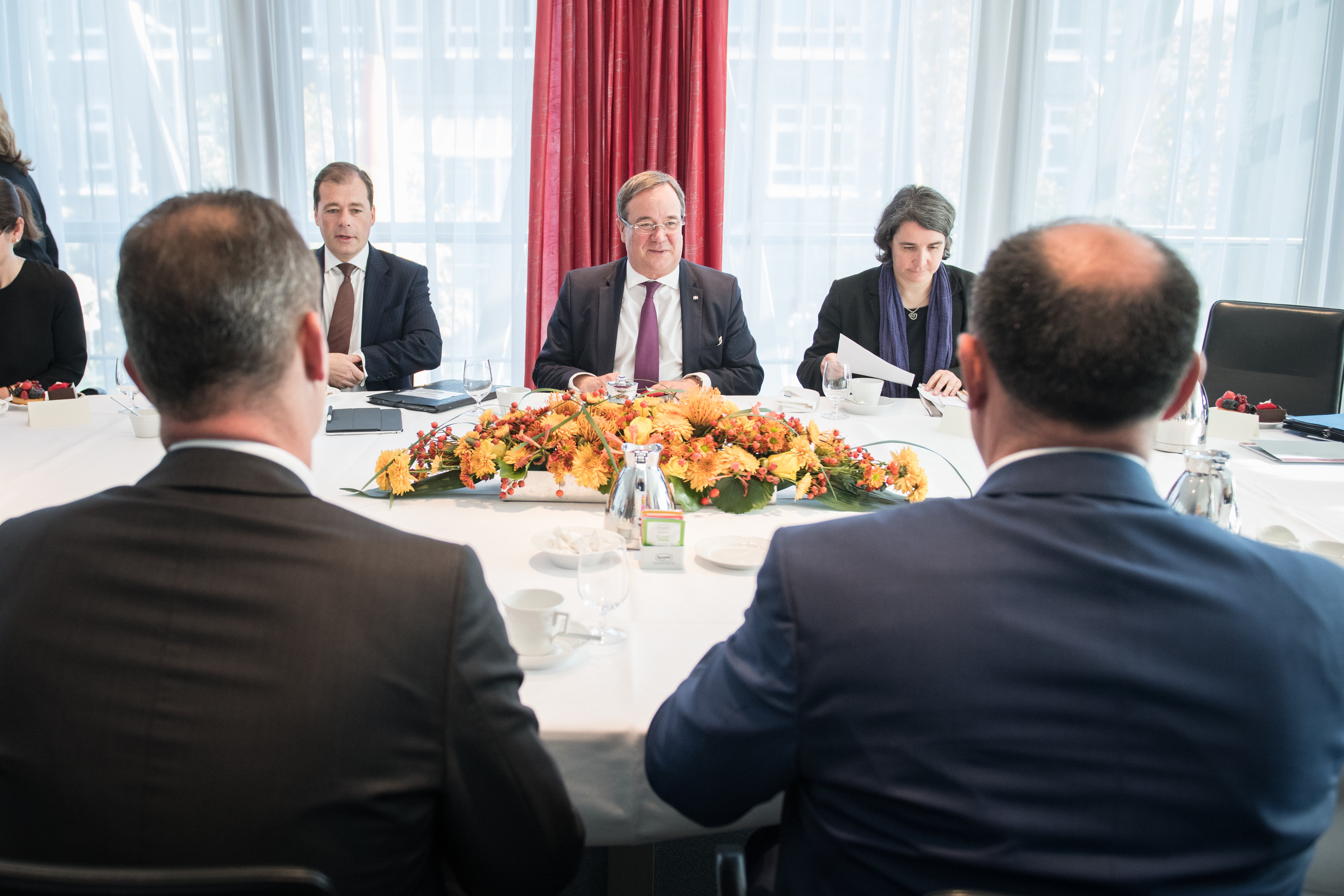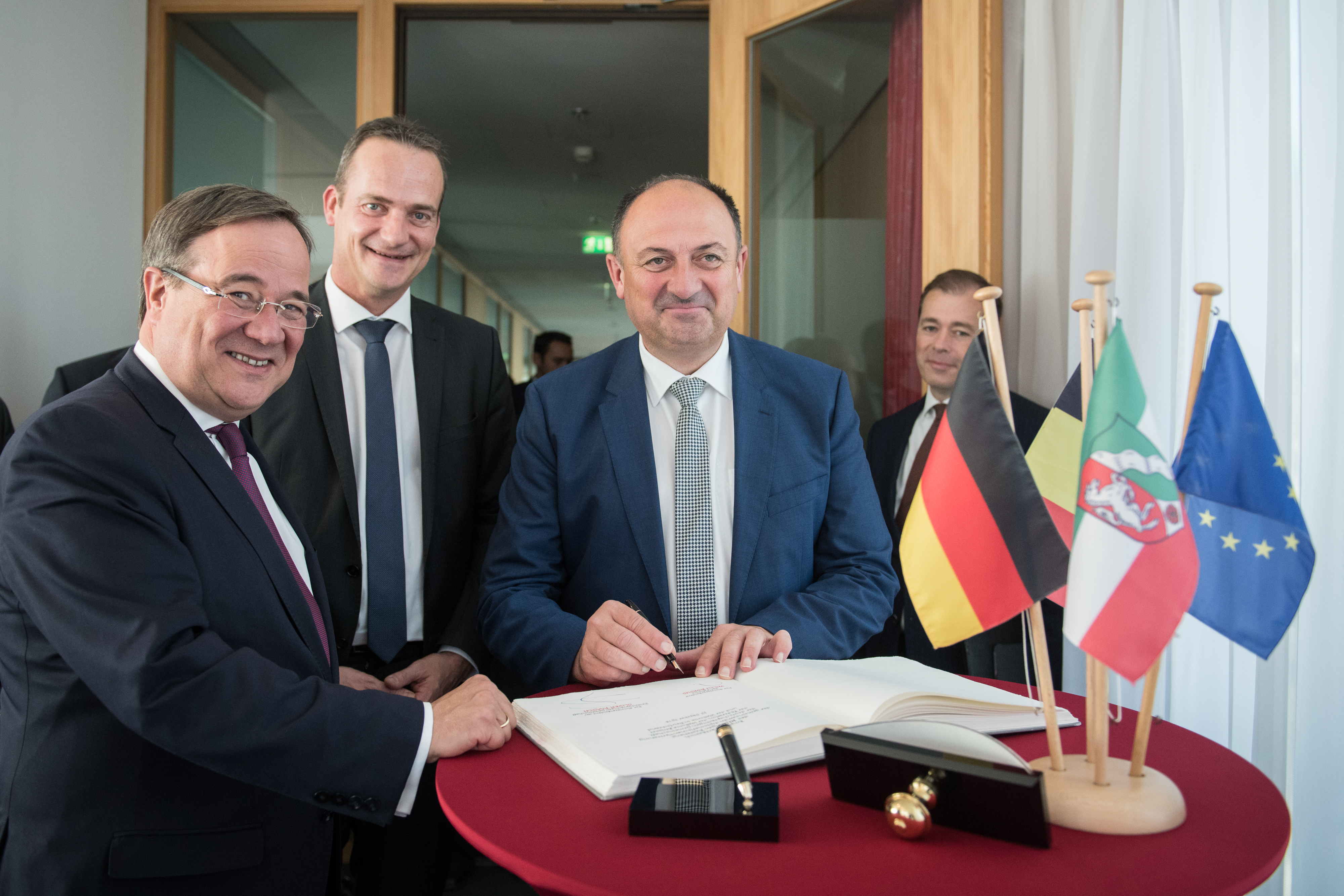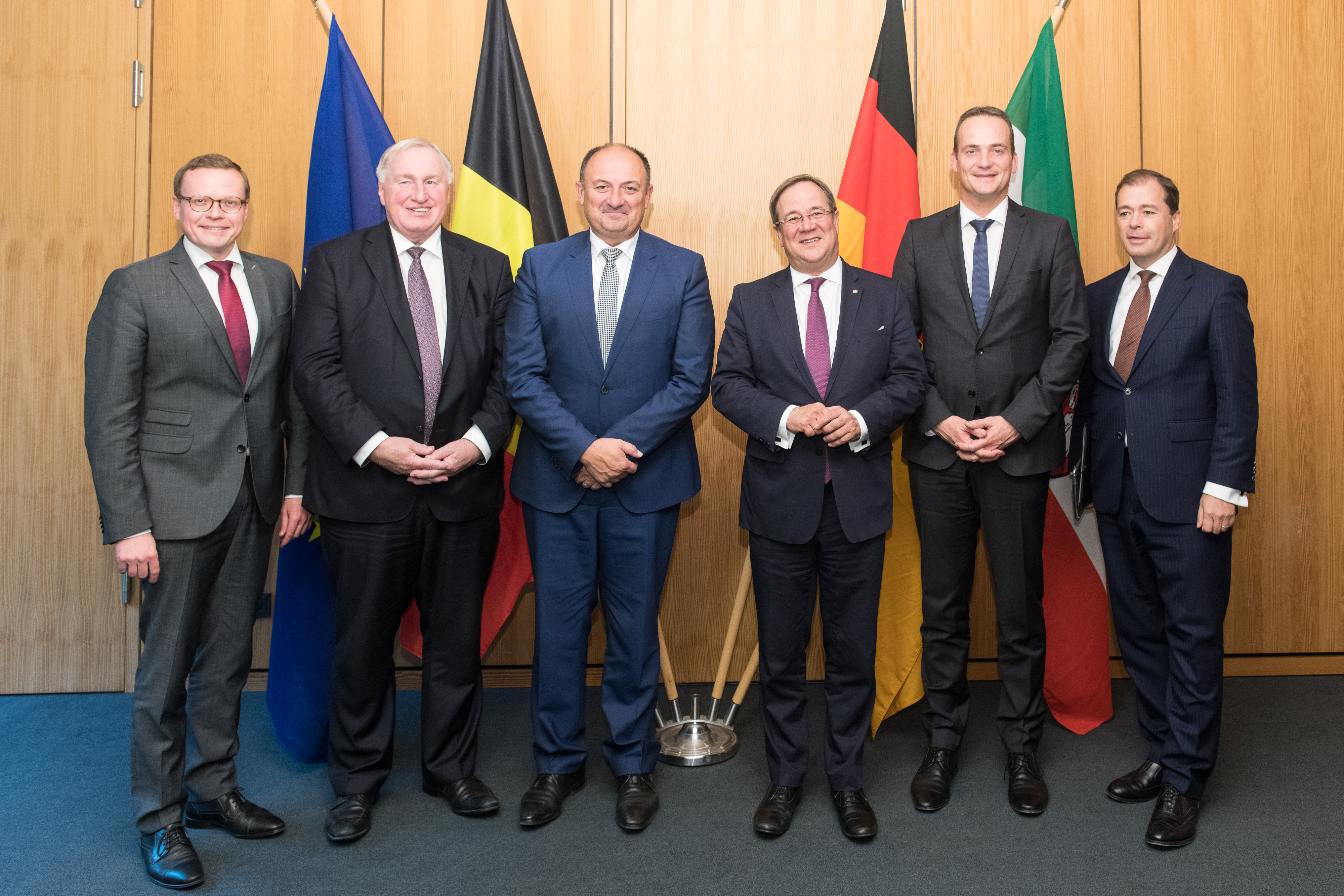 Nordrhein-Westfalen pflegt mit Belgien eine über Jahrzehnte hinweg gewachsene Freundschaft. Um die Beziehungen weiter zu vertiefen, ist Ministerpräsident Armin Laschet am Freitag, 19. Oktober 2018, mit Willy Borsus, Ministerpräsident der belgischen Region Wallonie, und mit Oliver Paasch, Ministerpräsident der Deutschsprachigen Gemeinschaft Belgiens, in der Vertretung Nordrhein-Westfalens beim Bund in Berlin zu einem Gespräch zusammengekommen. An dem Treffen nahmen ebenfalls der ehemalige Ministerpräsident Ostbelgiens und heutige Präsident des Ausschusses der Regionen der Europäischen Union, Karl-Heinz Lambertz, sowie Alexander Miesen, Parlamentspräsident Ostbelgiens teil. Die hochrangige Delegation von Regierungsvertretern belgischer Regionen und Gemeinschaften besucht derzeit Berlin, um ebenfalls das zehnjährige Jubiläum der Vertretung der Deutschsprachigen Gemeinschaft, der Föderation Wallonie-Brüssel und der Wallonie in Deutschland zu feiern.