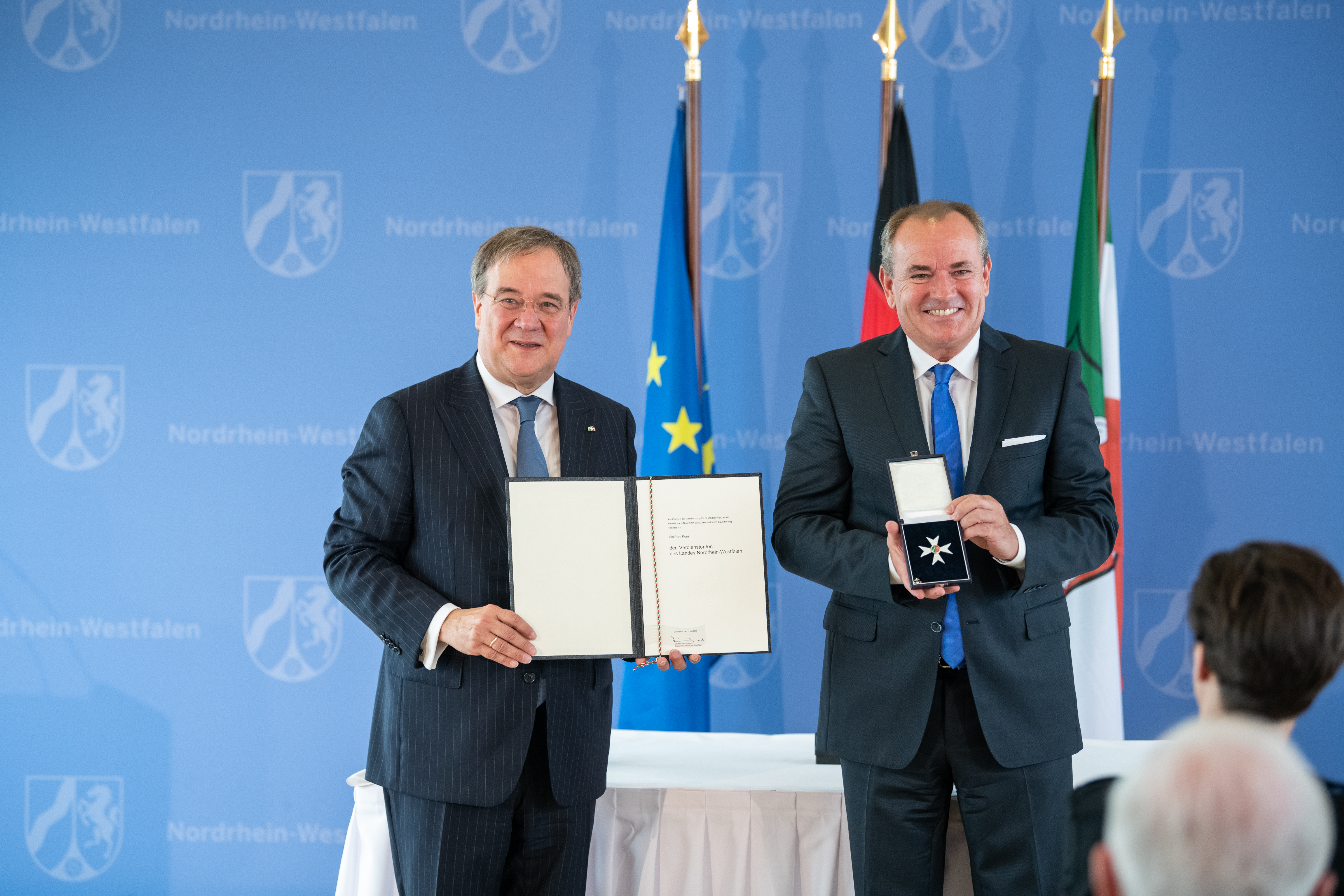 Für ihn stehen immer die Mitmenschen im Mittelpunkt, die kleinen und die großen. Lieber Wolfram Kons – heute stehen Sie selbst einmal im Mittelpunkt. Mit großem Dank für Ihren Einsatz für die Menschen, die oft am Rande der Gesellschaft stehen, überreiche ich Ihnen den Verdienstorden des Landes Nordrhein-Westfalen.