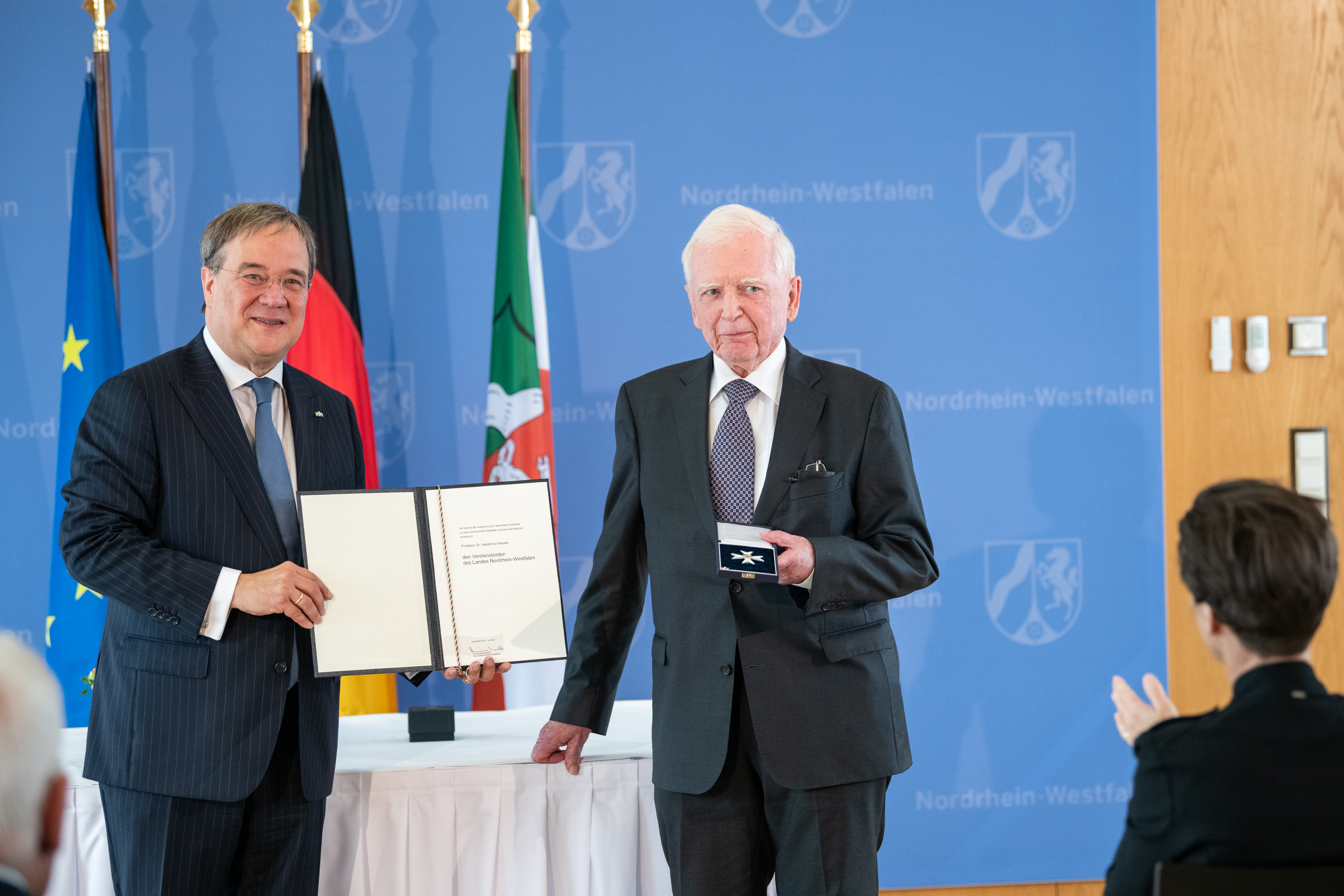 Und darum ist der Nobelpreisträger Harald zur Hausen trotz seines ehrwürdigen Alters von 84 Jahren nicht im wohlverdienten Ruhestand. Bis heute – ja, Sie haben richtig gehört: bis heute! – forscht er am Deutschen Krebsforchungszentrum in Heidelberg und kämpft dort weiter unermüdlich gegen den Krebs. Sehr verehrter Harald zur Hausen, es ist mir eine besondere Ehre, Ihre Verdienste mit dem Verdienstorden des Landes Nordrhein-Westfalen zu würdigen.