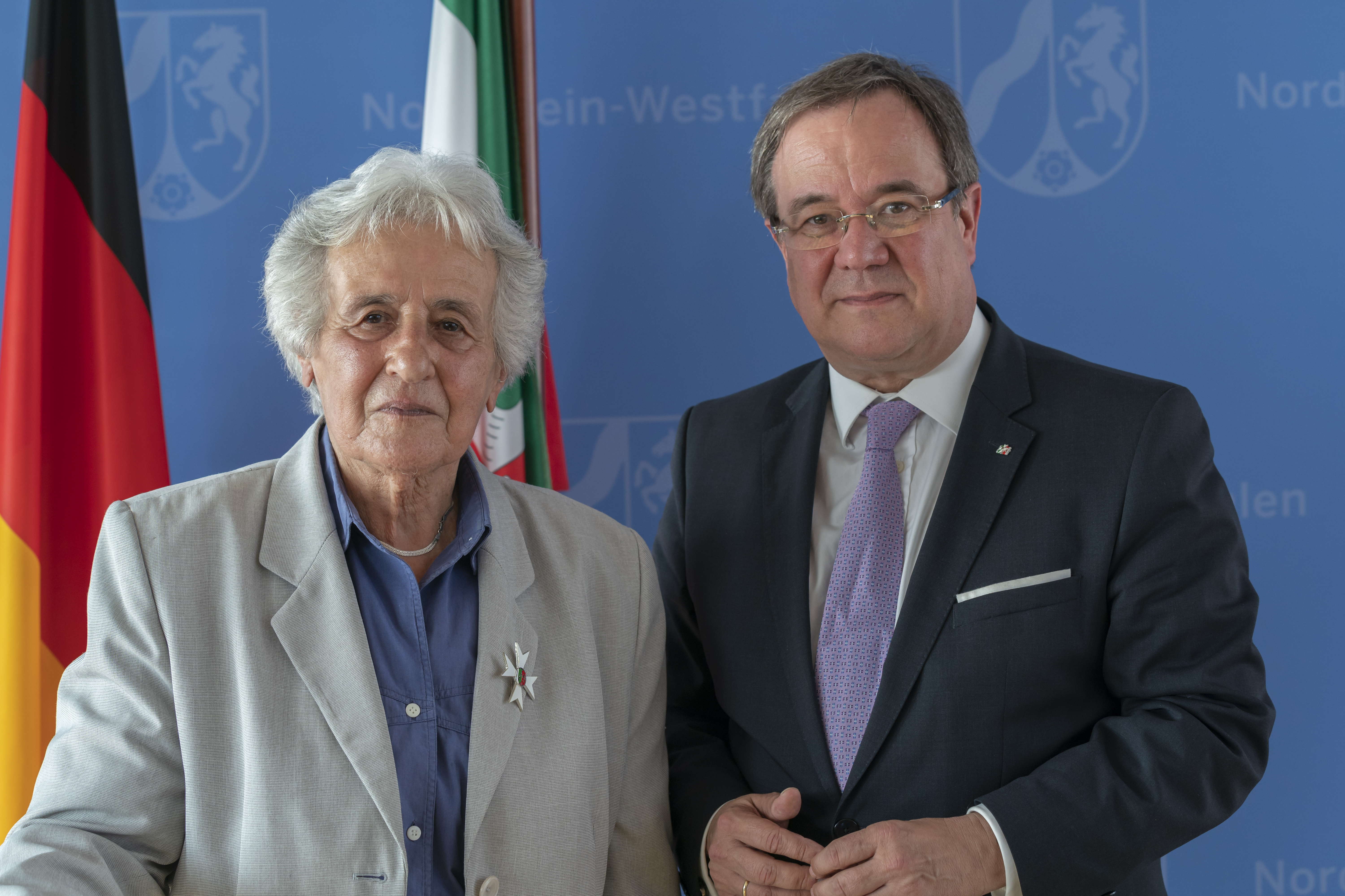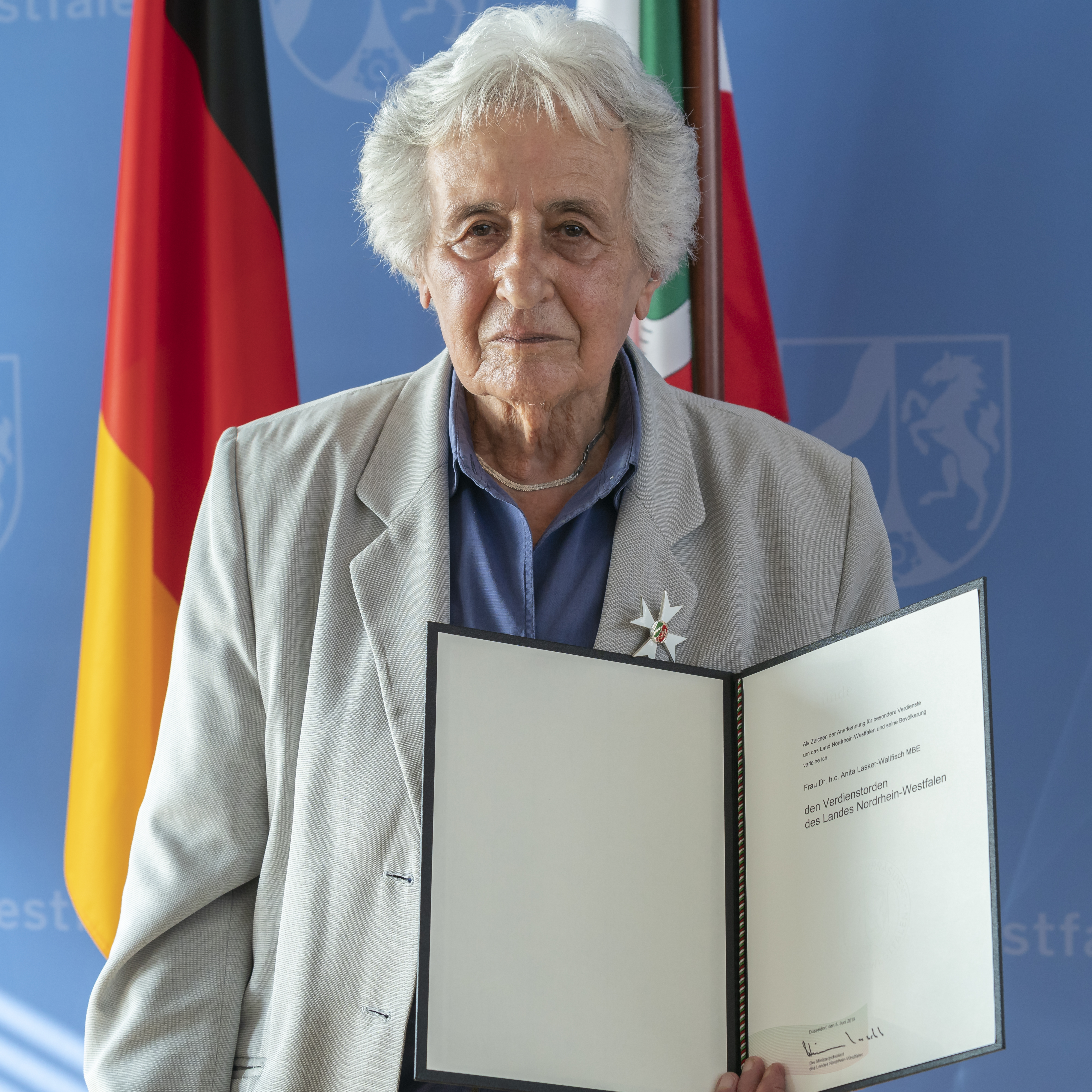 Ministerpräsident Armin Laschet hat am Dienstag, 5. Juni 2018, auf den Tag 75 Jahre nach ihrer Verurteilung, Dr. h.c. Anita Lasker-Wallfisch mit dem Verdienstorden des Landes Nordrhein-Westfalen ausgezeichnet. Die deutsch-britische Cellistin jüdischer Abstammung gehört zu den letzten Überlebenden des Mädchen-Orchesters von Auschwitz. Die Verleihung des Verdienstordens fand im Rahmen einer Feierstunde in der Staatskanzlei statt.