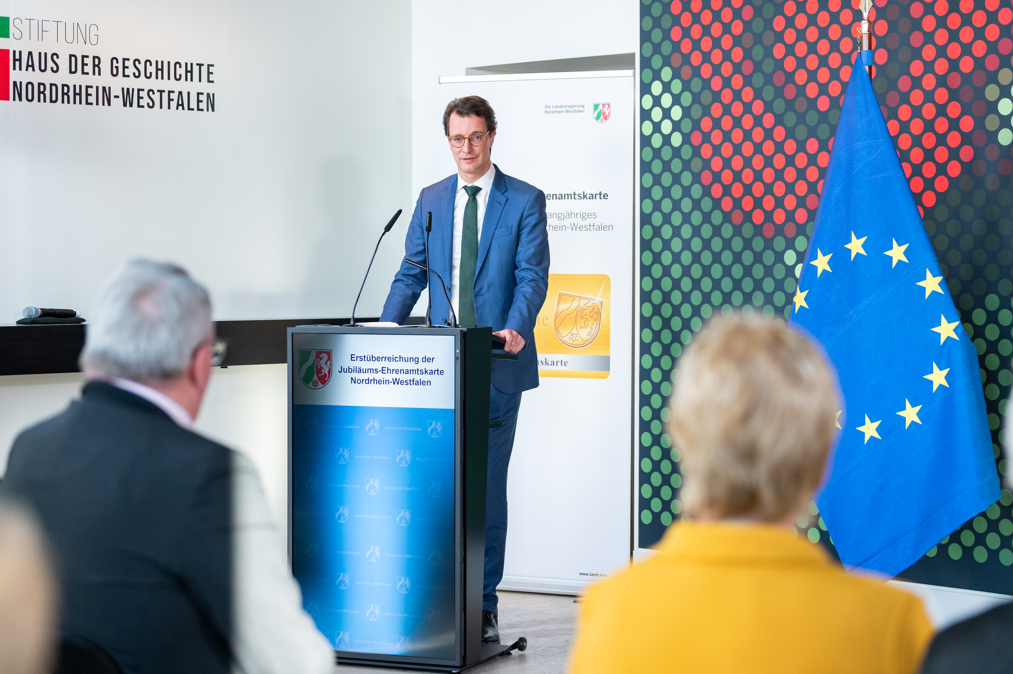 Ministerpräsident Hendrik Wüst hat am Mittwoch (9. März 2022) den langjährigen Einsatz von elf Bürgerinnen und Bürgern gewürdigt und ihnen für ihr vorbildliches Engagement im Ehrenamt gedankt. Bei einer Festveranstaltung im Haus der Geschichte Nordrhein-Westfalen in Düsseldorf überreichte der Ministerpräsident, gemeinsam mit der Staatssekretärin für Sport und Ehrenamt, Andrea Milz, Engagierten aus allen Landesteilen Nordrhein-Westfalens die neue „Jubiläums-Ehrenamtskarte Nordrhein-Westfalen“.