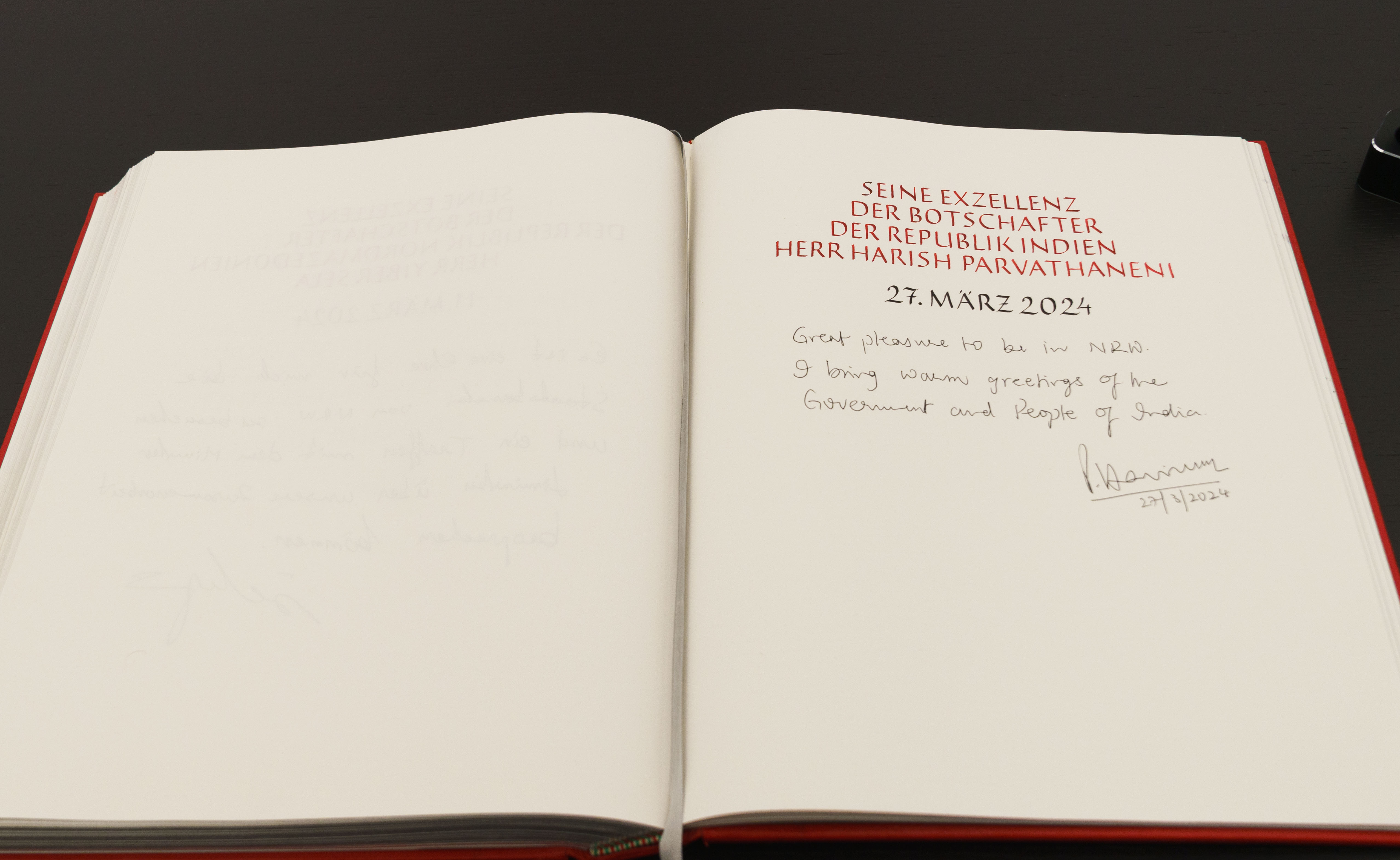 Ministerpräsident Hendrik Wüst hat am Mittwoch, 27. März 2024, den Botschafter der Republik Indien, S.E. Harish Parvathaneni, in der Staatskanzlei zu einem Gespräch empfangen. Botschafter Parvathaneni vertritt seit dem 6. November 2021 die mit 1,4 Milliarden Einwohnern größte Demokratie der Welt in Deutschland. Begleitet wurde der Botschafter von Vibha Kant Sharma, dem amtierenden Generalkonsul der Republik Indien in Frankfurt.