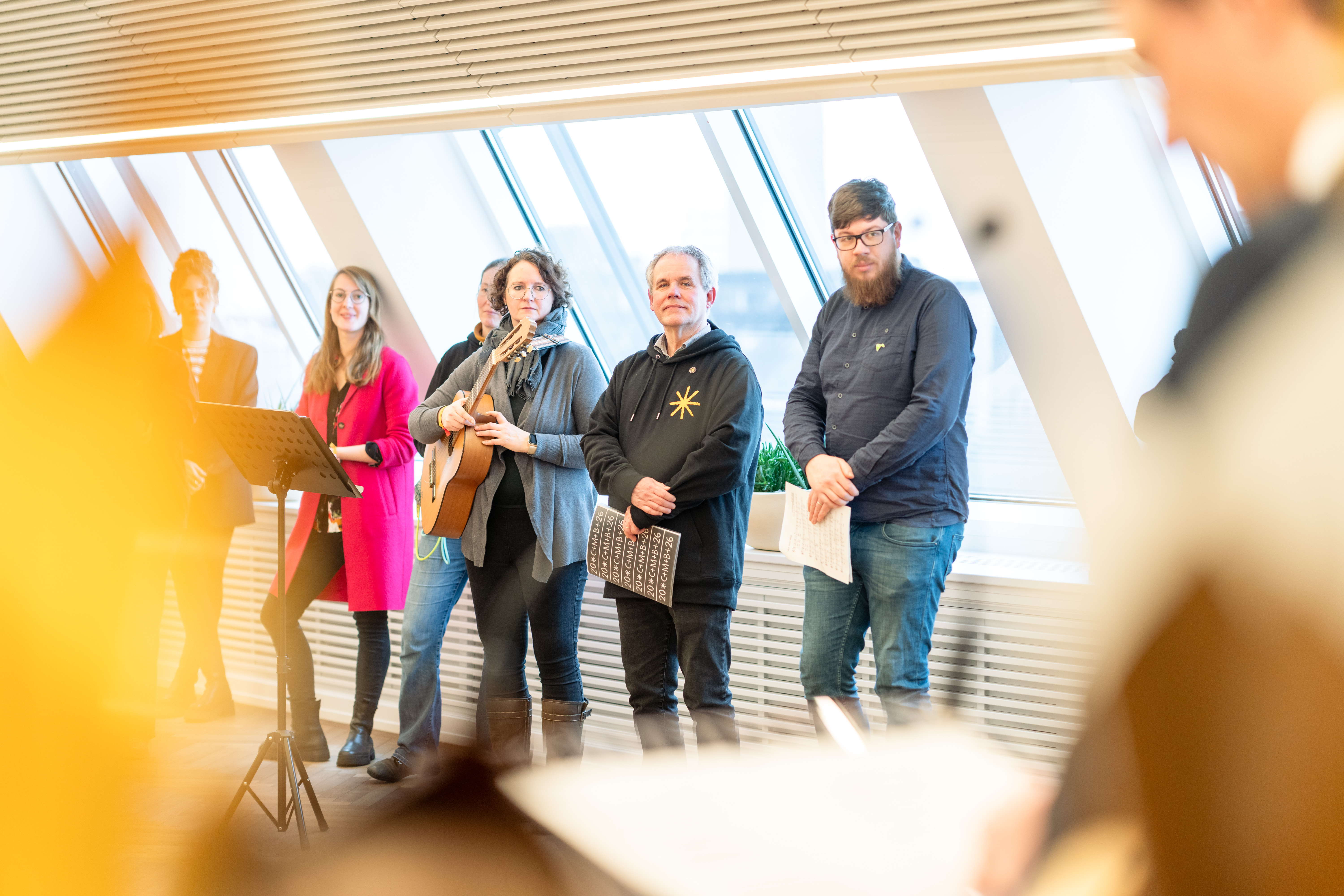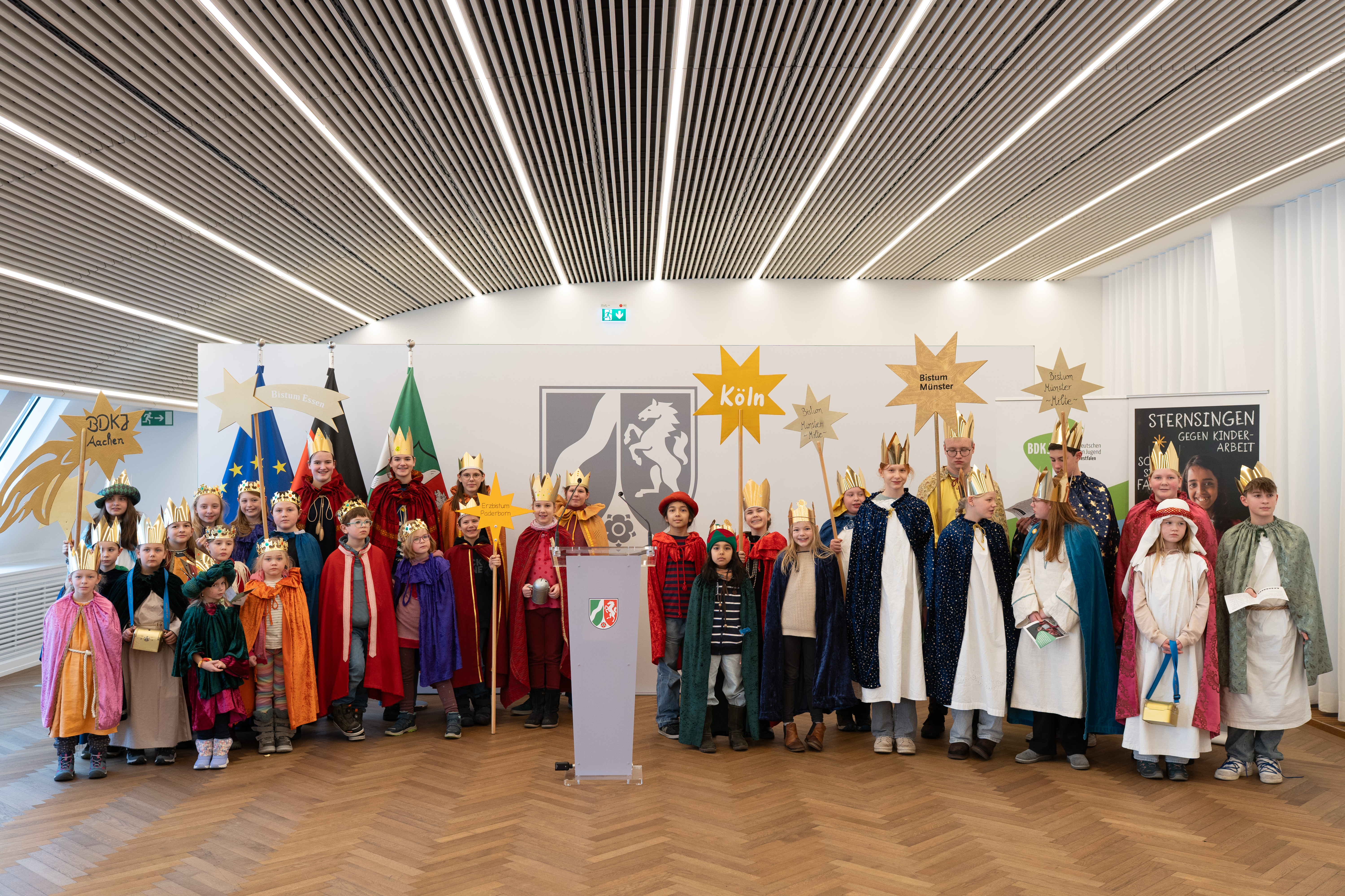 Mit Kronen, Gewändern und Liedern haben rund 35 Sternsingerinnen und Sternsinger aus Nordrhein-Westfalen am Donnerstag, 8. Januar 2026, die Staatskanzlei in Düsseldorf besucht.