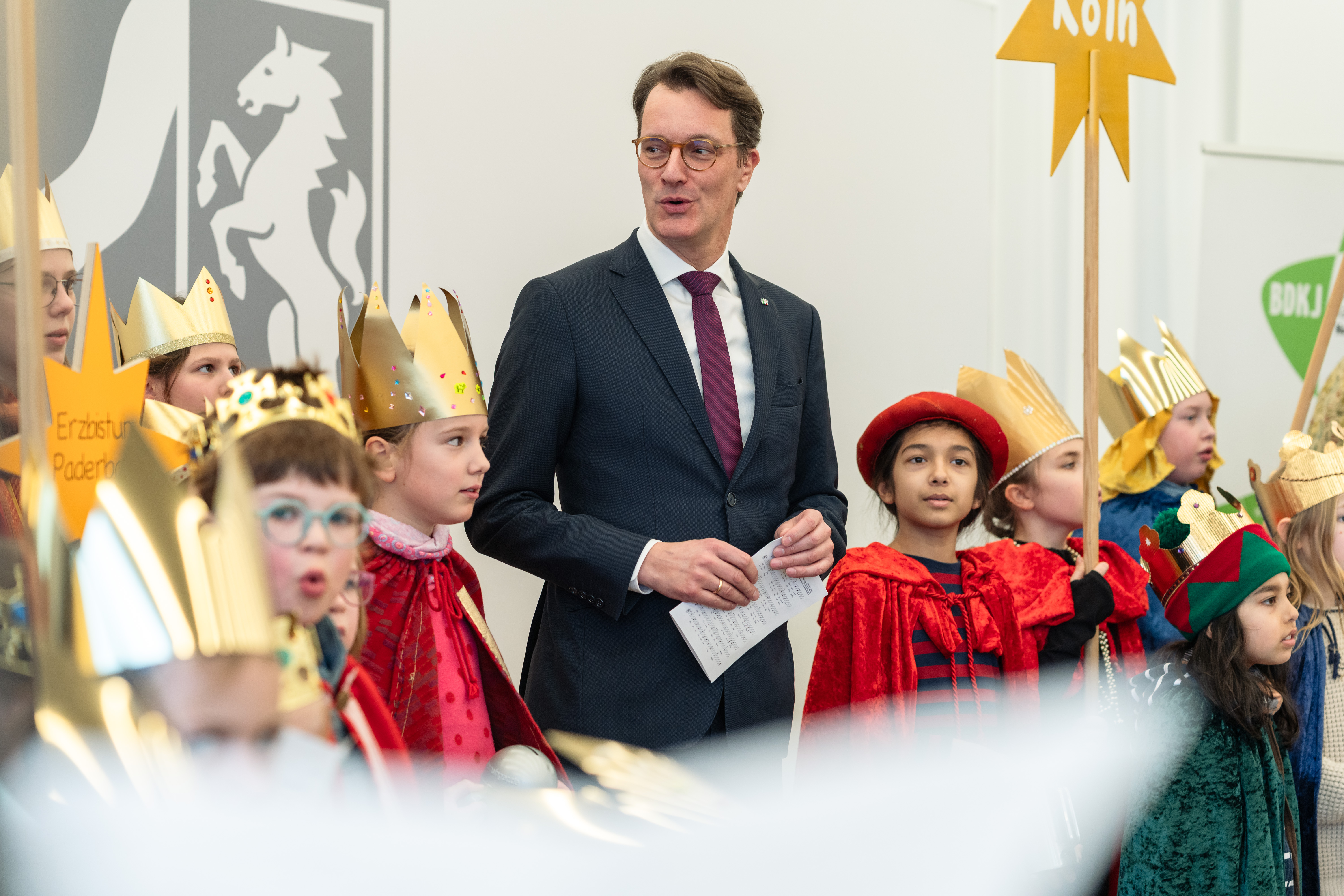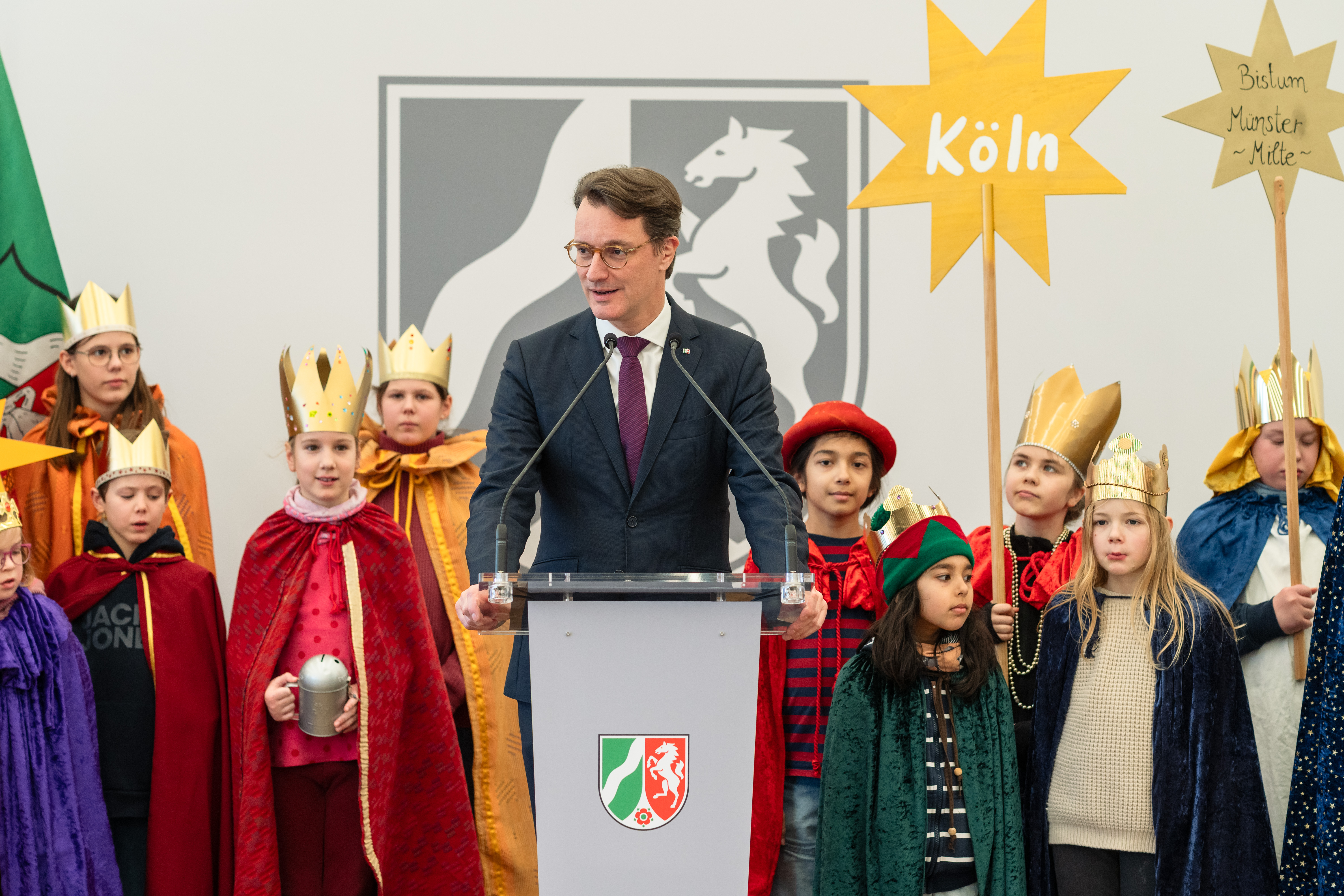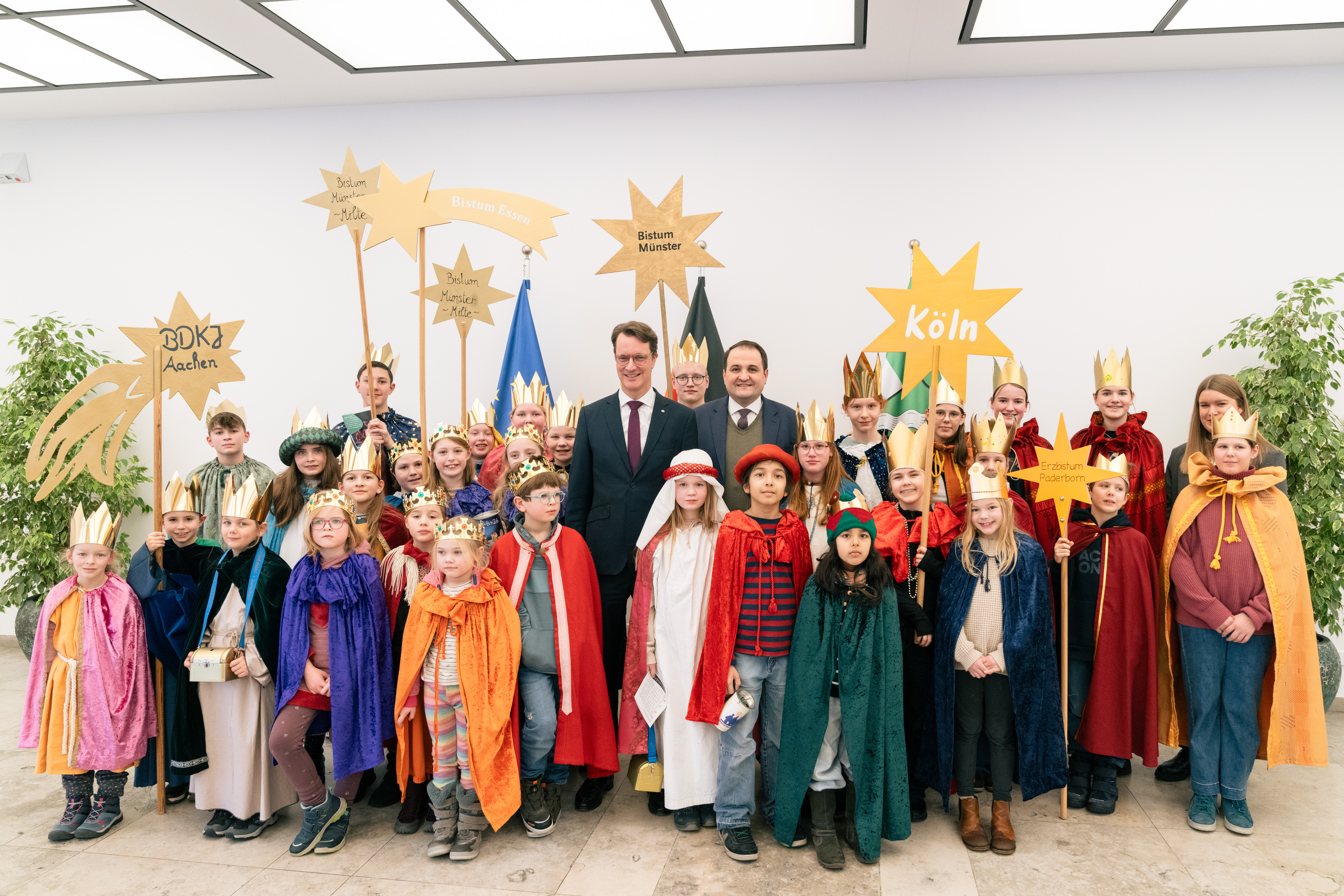 Mit Kronen, Gewändern und Liedern haben rund 35 Sternsingerinnen und Sternsinger aus Nordrhein-Westfalen am Donnerstag, 8. Januar 2026, die Staatskanzlei in Düsseldorf besucht. Aus den Diözesen Aachen, Essen, Köln, Münster und Paderborn angereist, überbrachten sie Ministerpräsident Hendrik Wüst und Nathanael Liminski, Minister für Bundes- und Europaangelegenheiten, Internationales sowie Medien und Chef der Staatskanzlei den traditionellen Segen „Christus mansionem benedicat – Christus segne dieses Haus“.