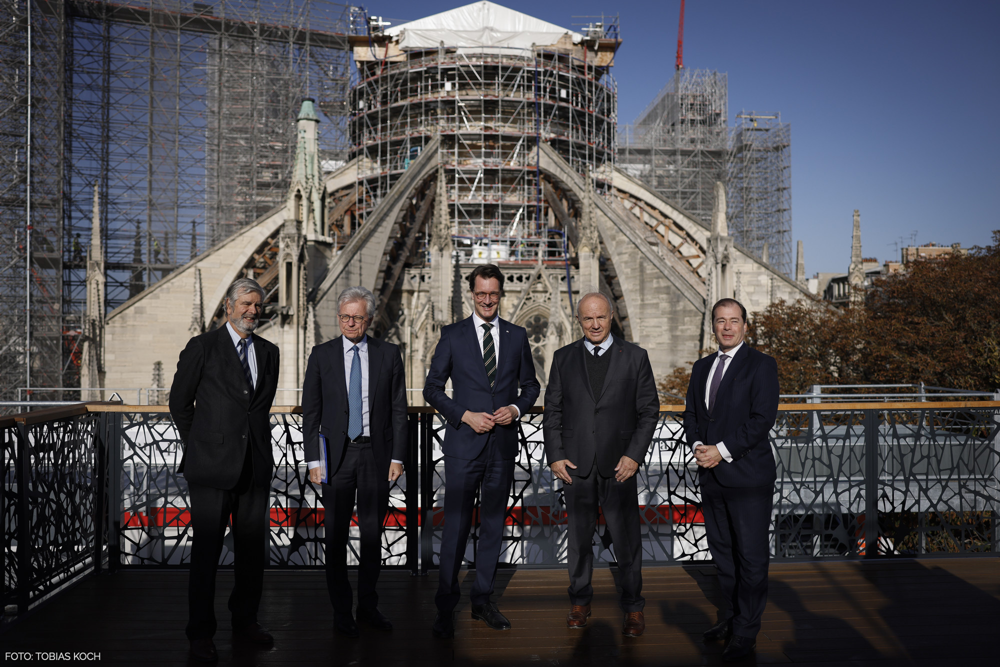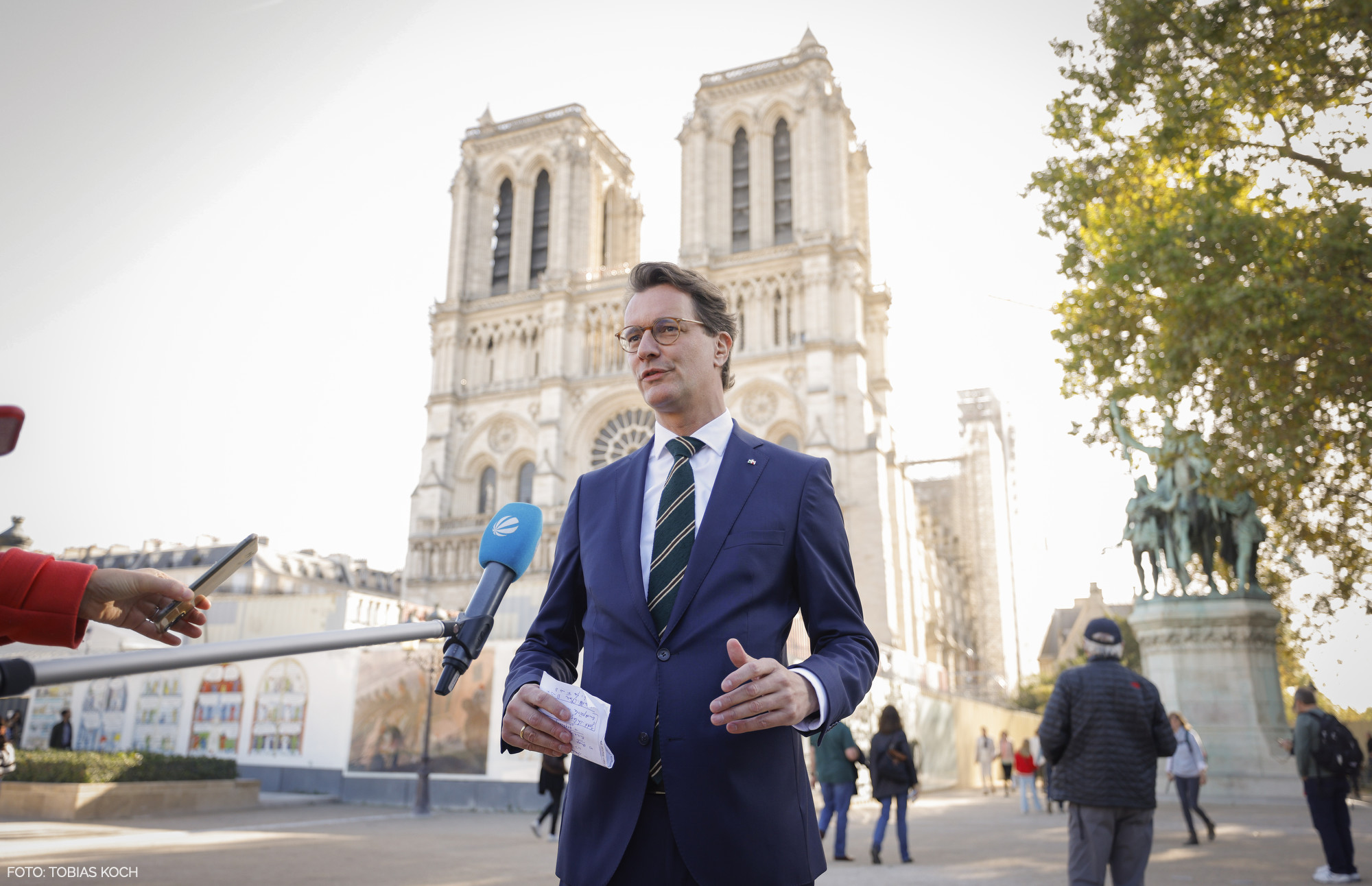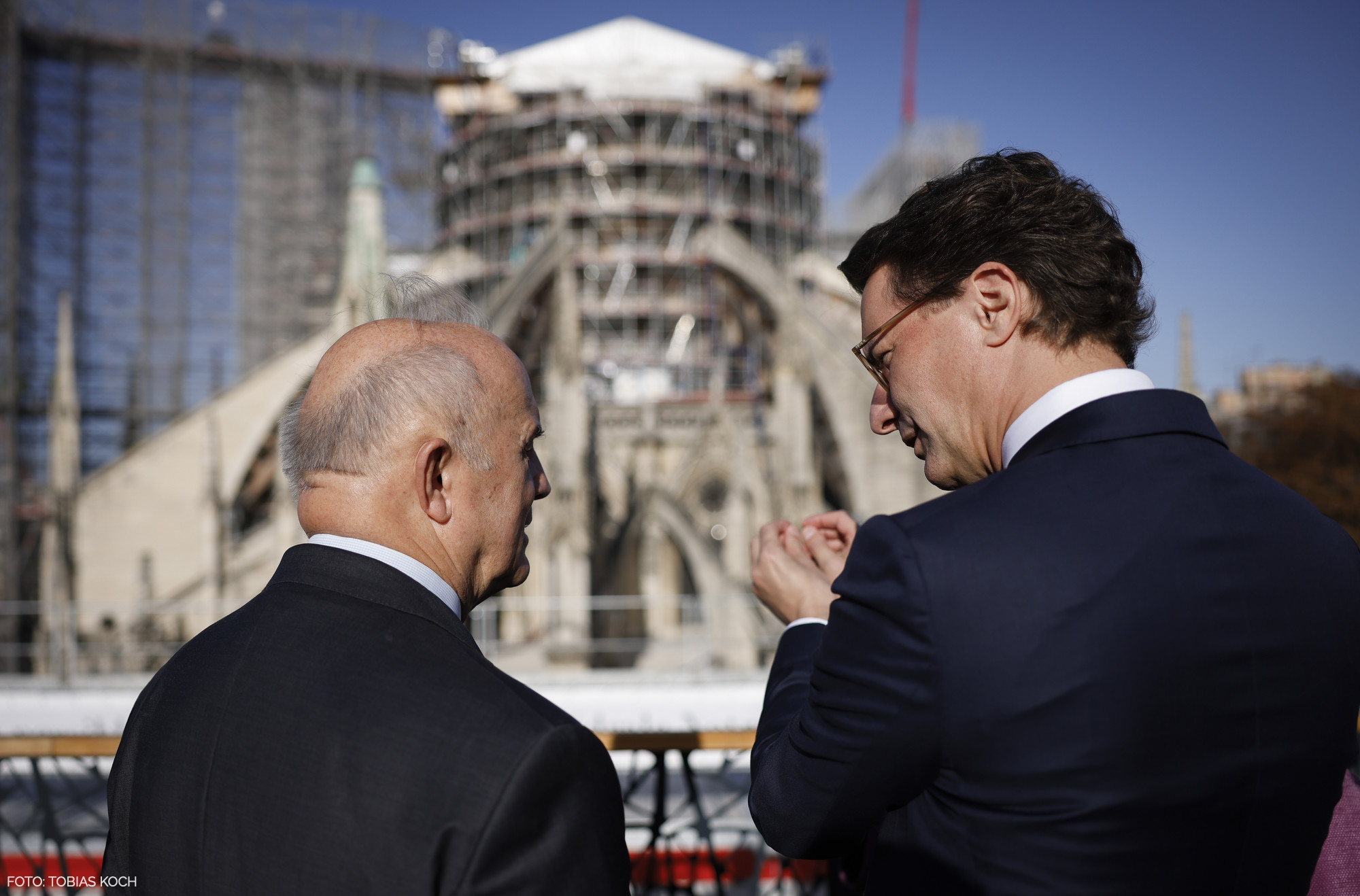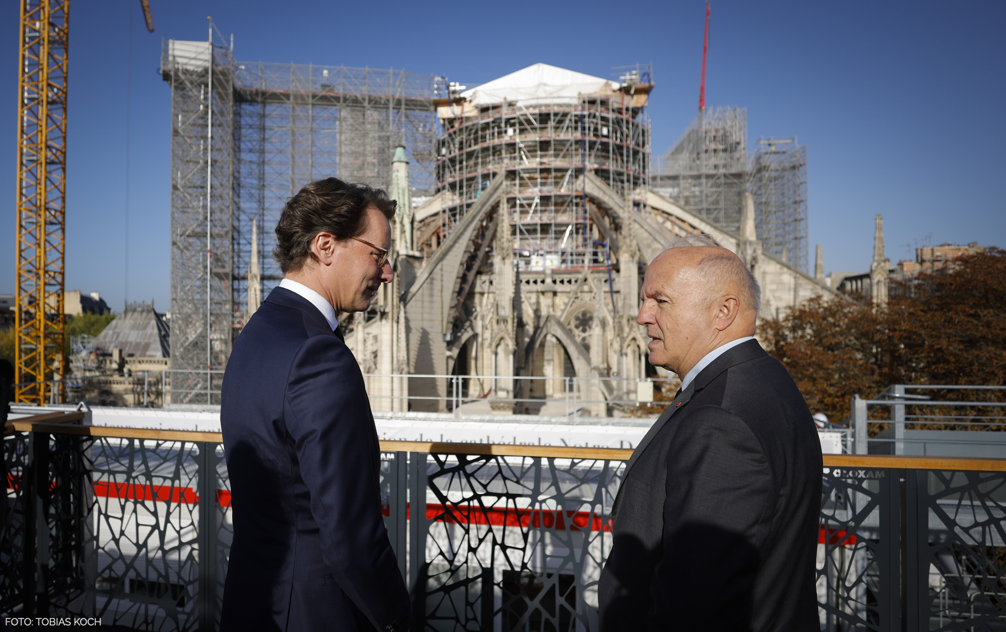 Ministerpräsident Hendrik Wüst besucht in Paris die Kathedrale Notre-Dame de Paris. Bei einem Großbrand am 15. und 16. April 2019 wurden große Teile des historischen Bauwerks zerstört, besonders der Dachstuhl ist betroffen. Schon am Tag nach der Brandkatastrophe riefen der deutsch-französische Kulturbevollmächtigte und die Präsidentin der deutschen UNESCO-Kommission eine Spendenaktion „NRW für Notre-Dame“ ins Leben. Dabei kamen knapp 500.000 Euro zusammen, die nun in den Wiederaufbau fließen. So werden vier Obergadenfenster aus dem Langhaus der Kathedrale in einem einzigartigen deutsch-französischen Kooperationsprojekt in der Kölner Dombauhütte restauriert.