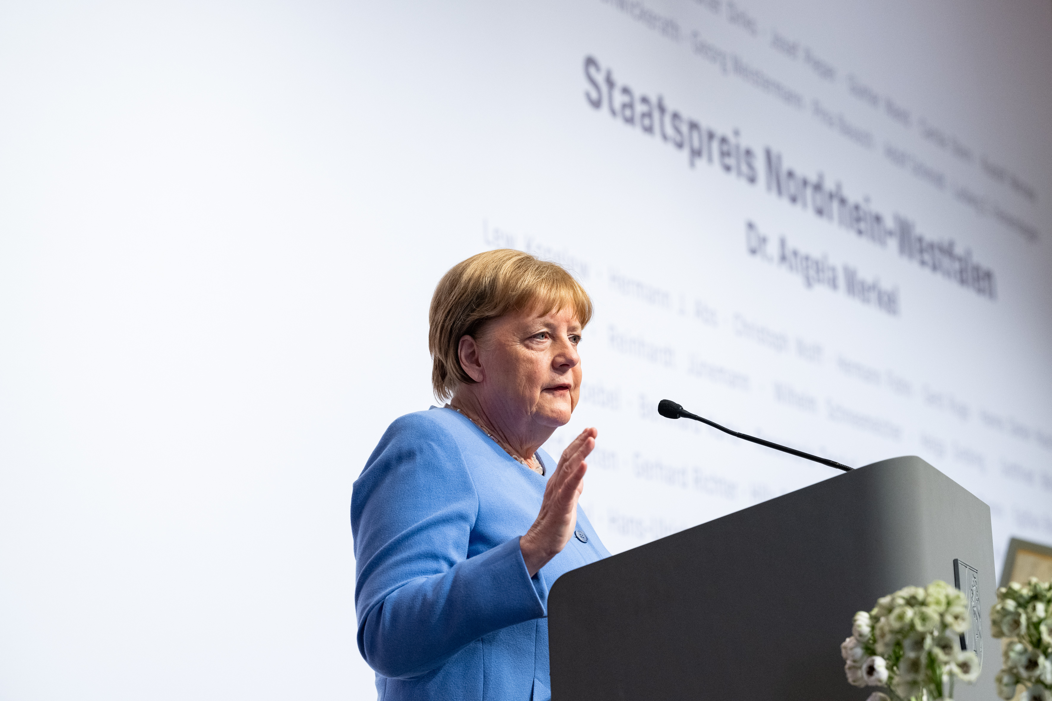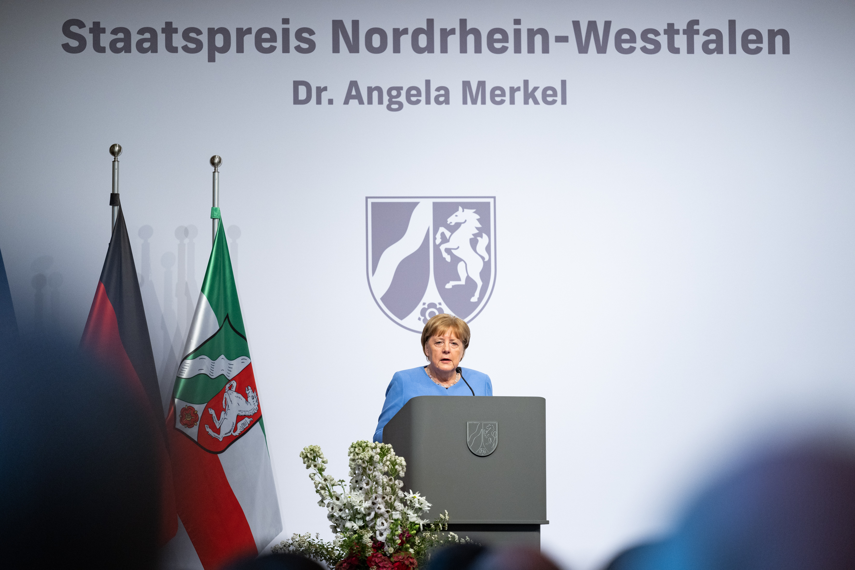Der Staatspreis des Landes Nordrhein-Westfalen wird Bundeskanzlerin a.D. Dr. Angela Merkel verliehen für ihren unermüdlichen Einsatz zum Wohl des deutschen Volkes in einer von internationalen Krisen geprägten Zeit, für ihre außergewöhnlichen humanitären Leistungen und ihr herausragende Verdienste um das Ansehen Deutschlands in der Welt, für ihre Beiträge zur Stabilität der Europäischen Union, und in Anerkennung ihrer Vorbildfunktion als erste Bundeskanzlerin in der Geschichte der Bundesrepublik Deutschland, die zahlreichen Frauen als Ermutigung gedient hat und weiterhin dient.