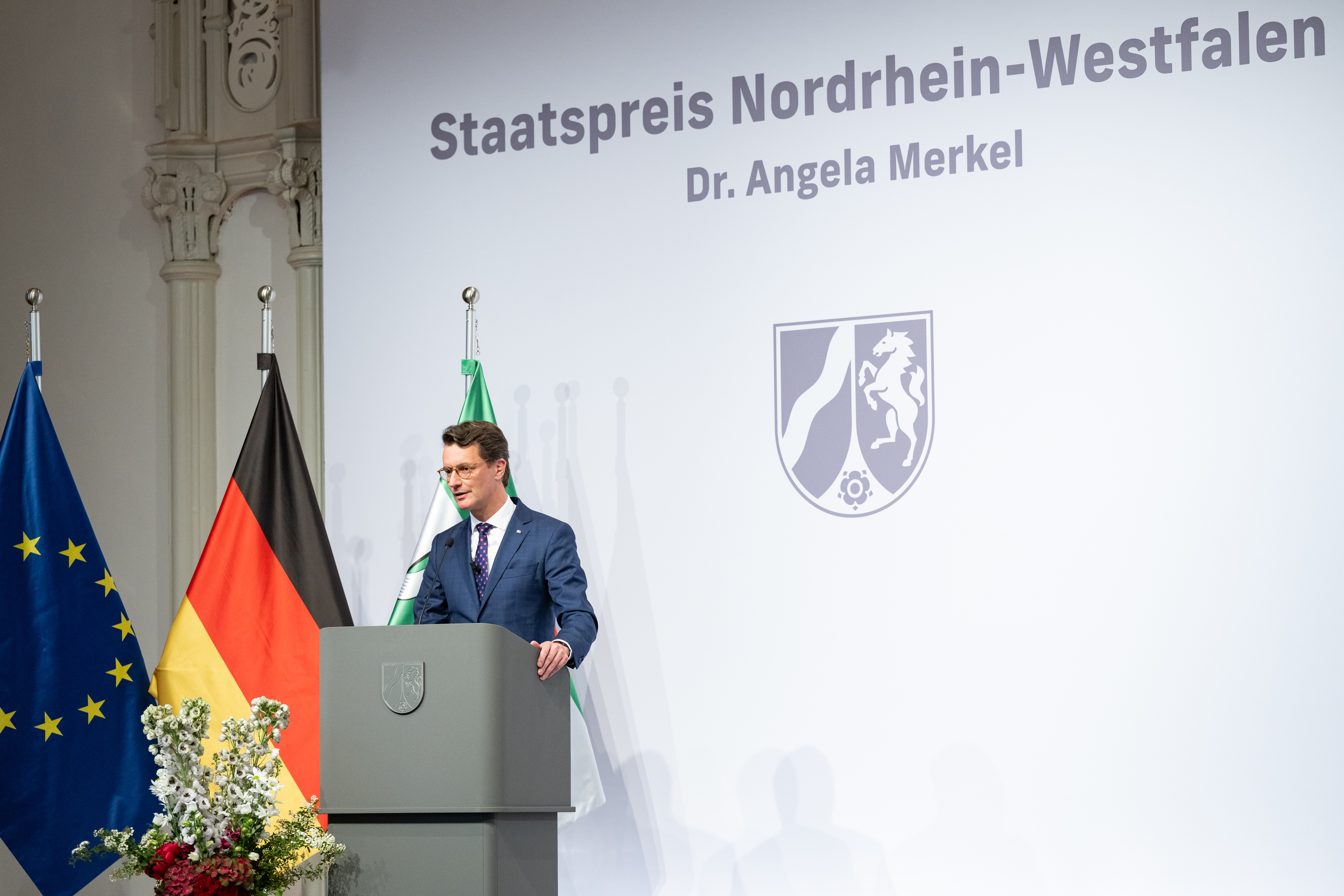 Ministerpräsident Hendrik Wüst verleiht den Staatspreis an Bundeskanzlerin a.D. Dr. Angela Merkel