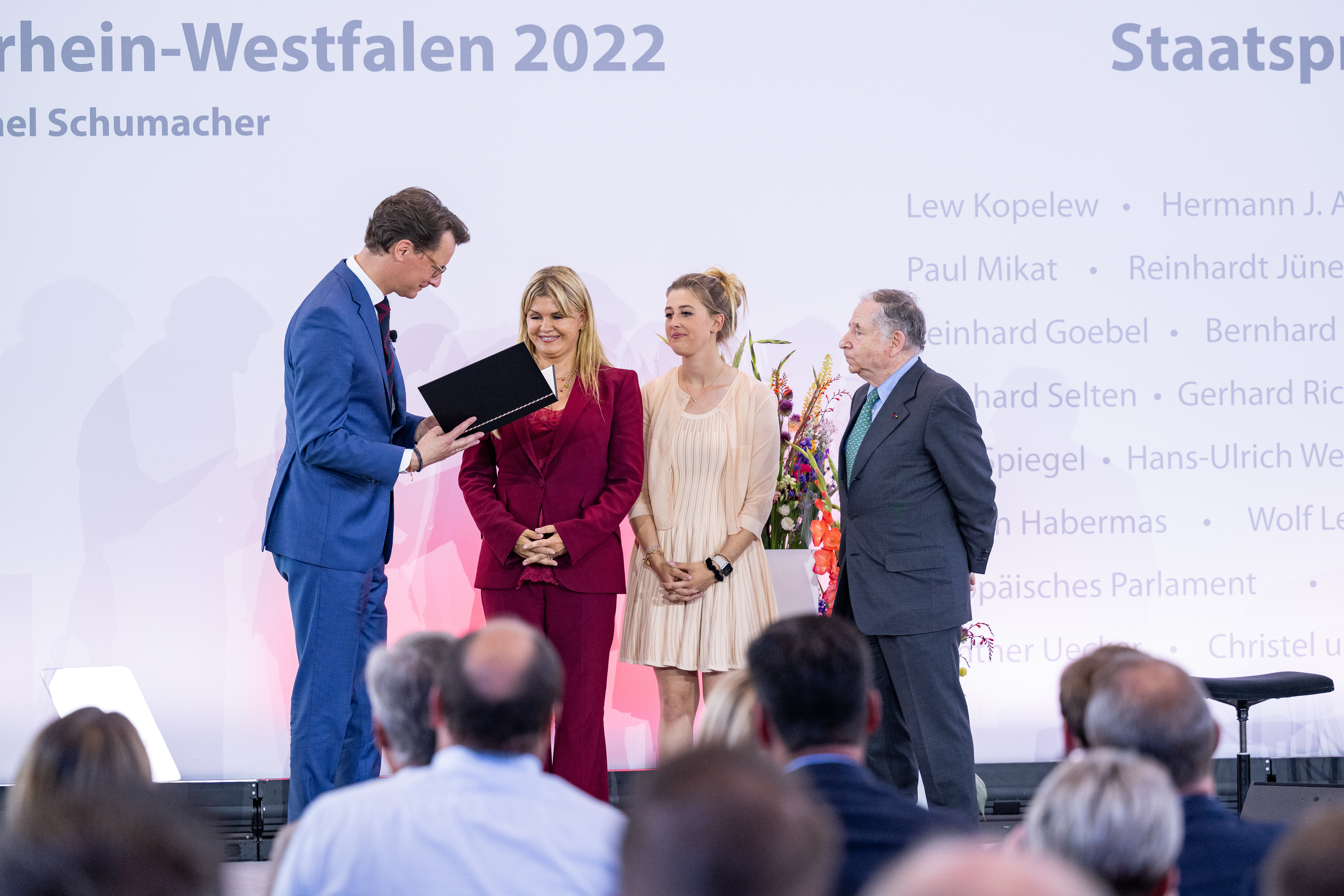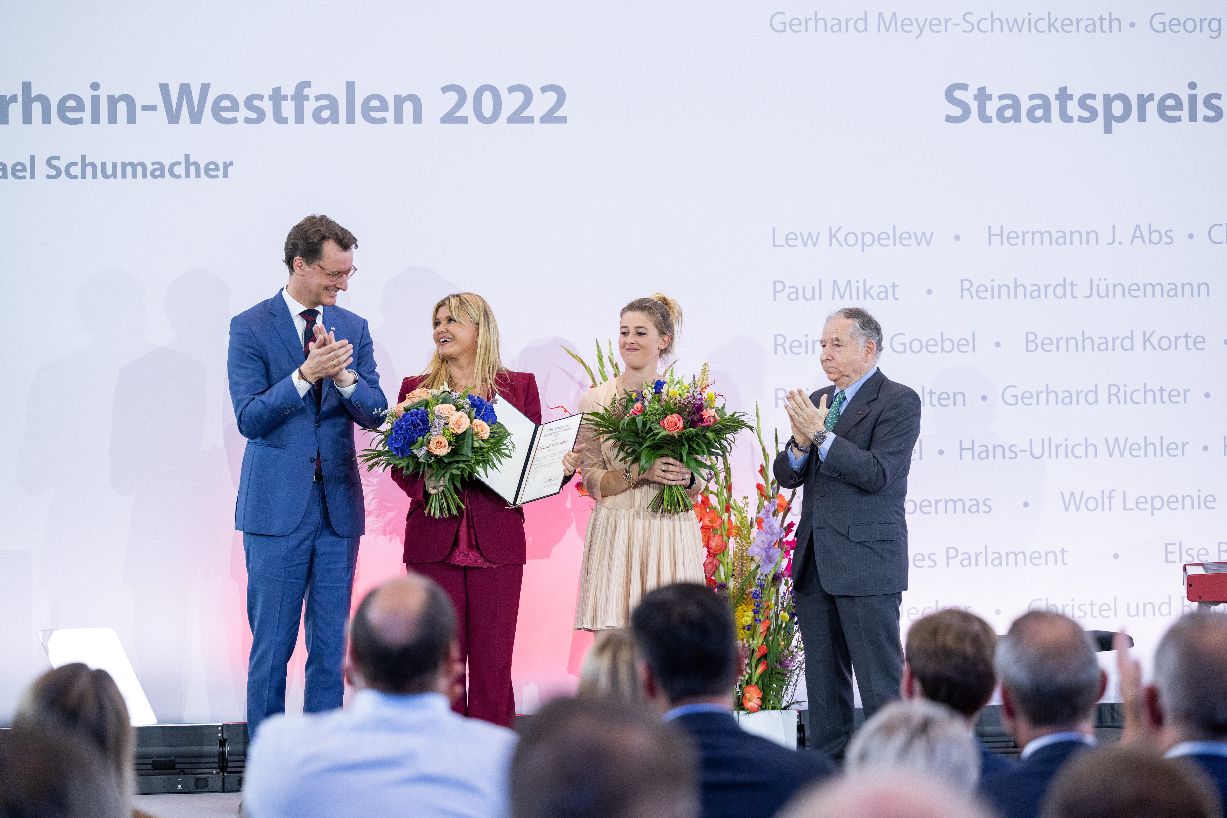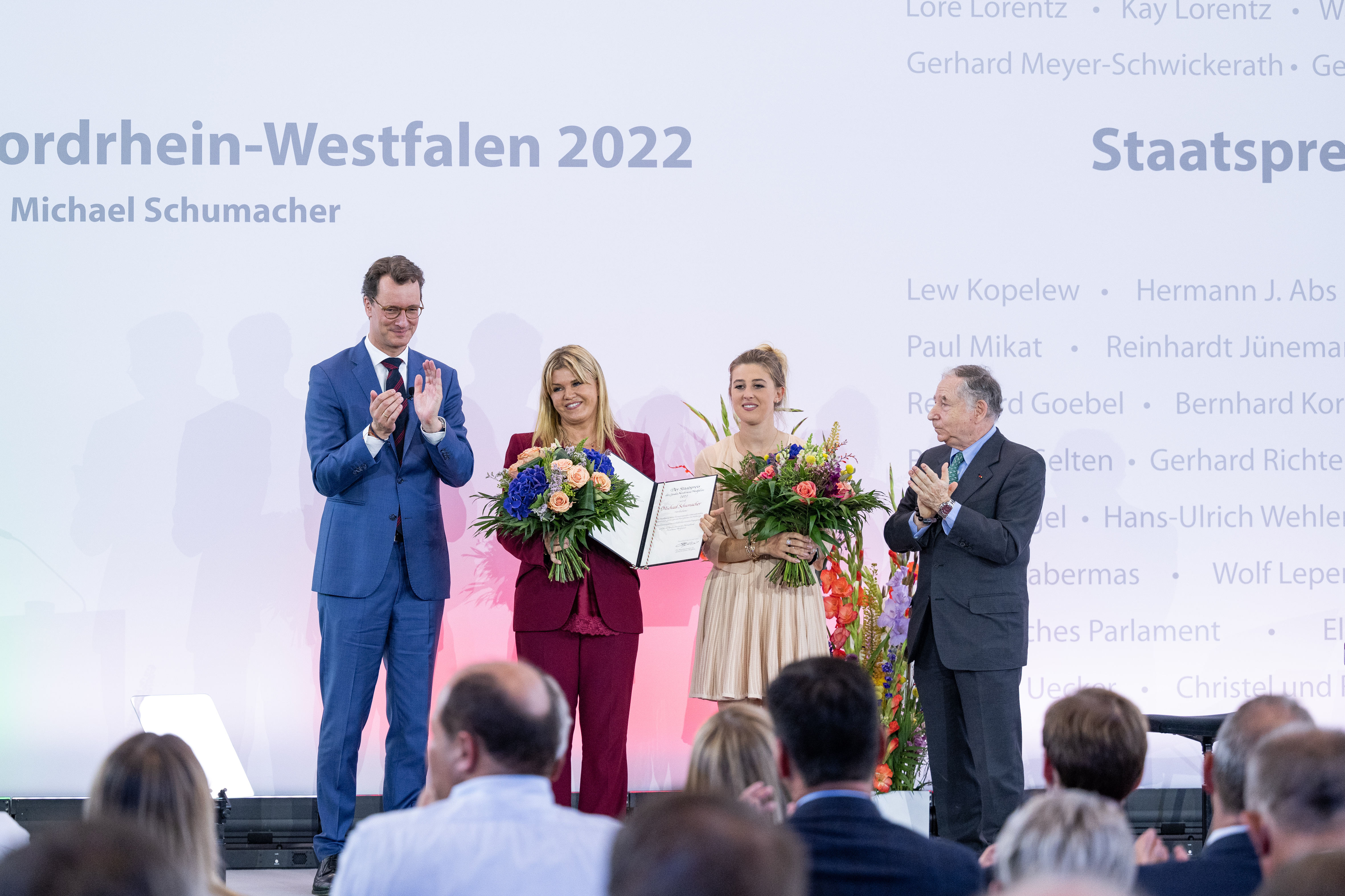 Ministerpräsident Hendrik Wüst hat am Mittwoch, 20. Juli 2022, den Staatspreis des Landes Nordrhein-Westfalen an Michael Schumacher verliehen. Der frühere Rennfahrer wird damit geehrt für seine herausragenden internationalen sportlichen Leistungen, in Anerkennung seines vorbildlichen sozialen Engagements und für seine Verdienste um sein Heimatland Nordrhein-Westfalen. Michael Schumachers Frau Corinna Schumacher und seine Tochter Gina Schumacher nahmen die Auszeichnung in der MOTORWORLD Köln entgegen. Die Laudatio auf den 58. Träger der höchsten Auszeichnung des Landes Nordrhein-Westfalen hielt Jean Todt, selbst ehemaliger Rennfahrer, Michael Schumachers Teamchef bei Ferrari und langjähriger Präsident des Welt-Automobilverbands FIA.