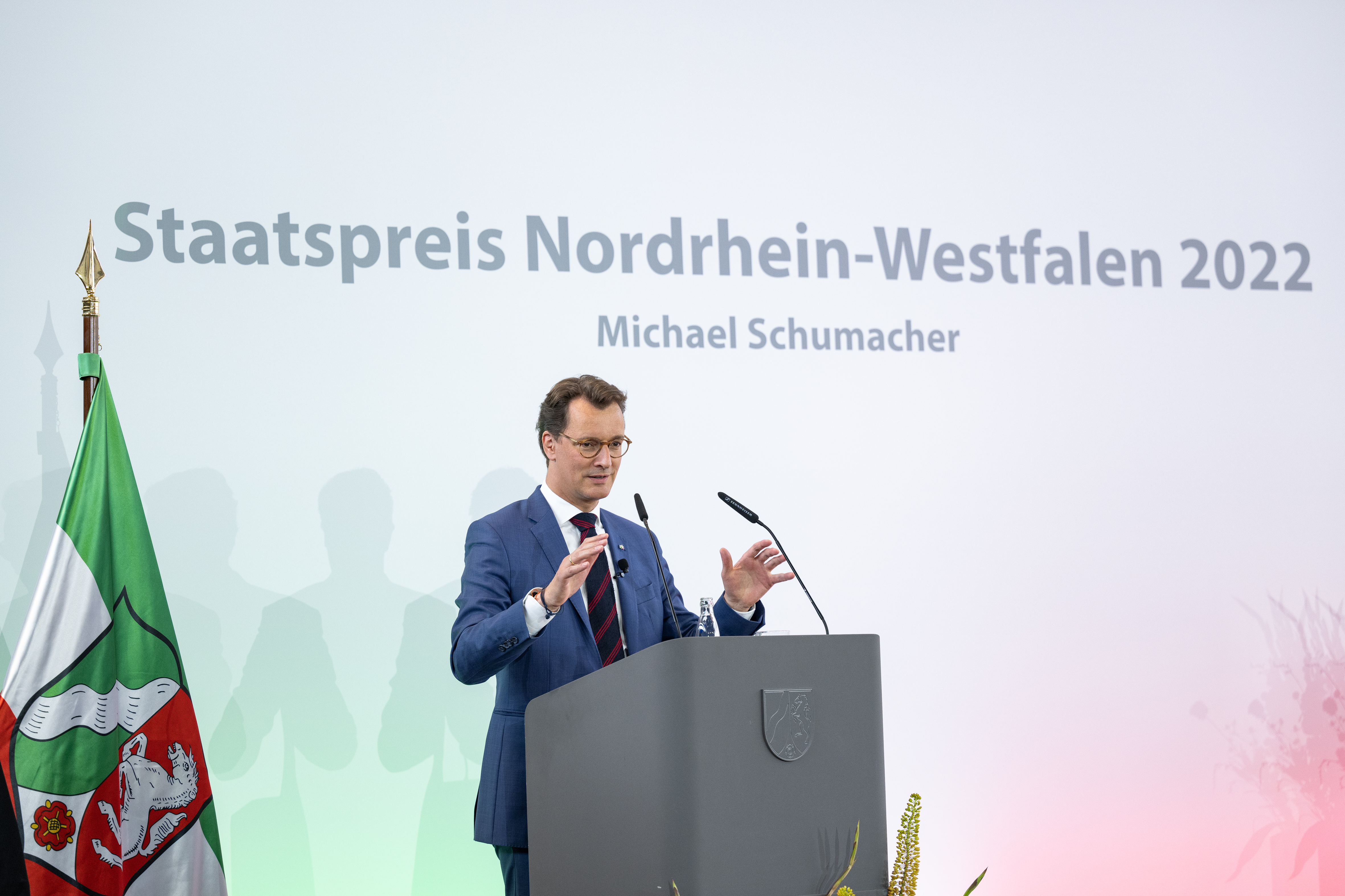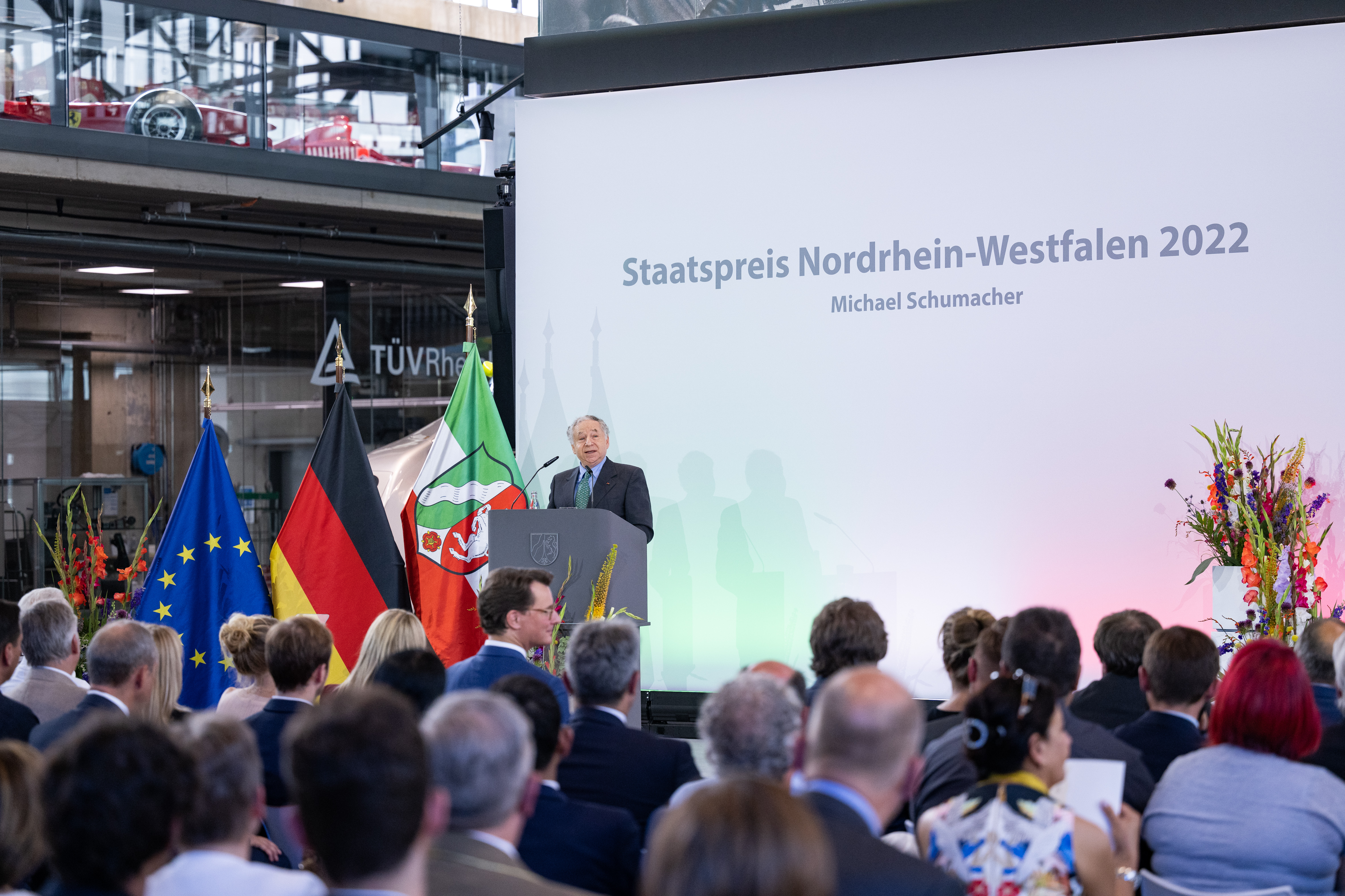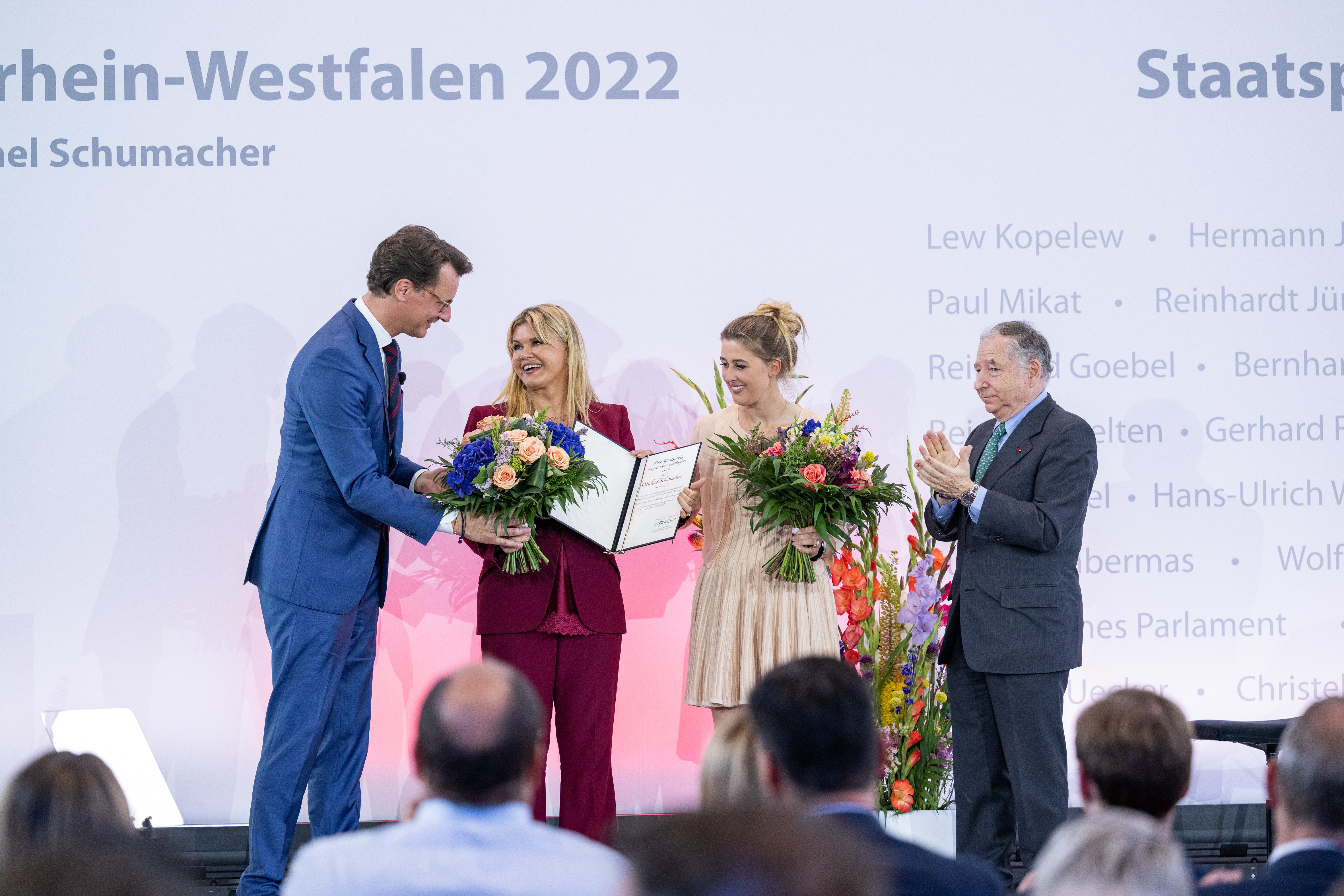 Ministerpräsident Hendrik Wüst hat am Mittwoch, 20. Juli 2022, den Staatspreis des Landes Nordrhein-Westfalen an Michael Schumacher verliehen. Der frühere Rennfahrer wird damit geehrt für seine herausragenden internationalen sportlichen Leistungen, in Anerkennung seines vorbildlichen sozialen Engagements und für seine Verdienste um sein Heimatland Nordrhein-Westfalen. Michael Schumachers Frau Corinna Schumacher und seine Tochter Gina Schumacher nahmen die Auszeichnung in der MOTORWORLD Köln entgegen. Die Laudatio auf den 58. Träger der höchsten Auszeichnung des Landes Nordrhein-Westfalen hielt Jean Todt, selbst ehemaliger Rennfahrer, Michael Schumachers Teamchef bei Ferrari und langjähriger Präsident des Welt-Automobilverbands FIA.