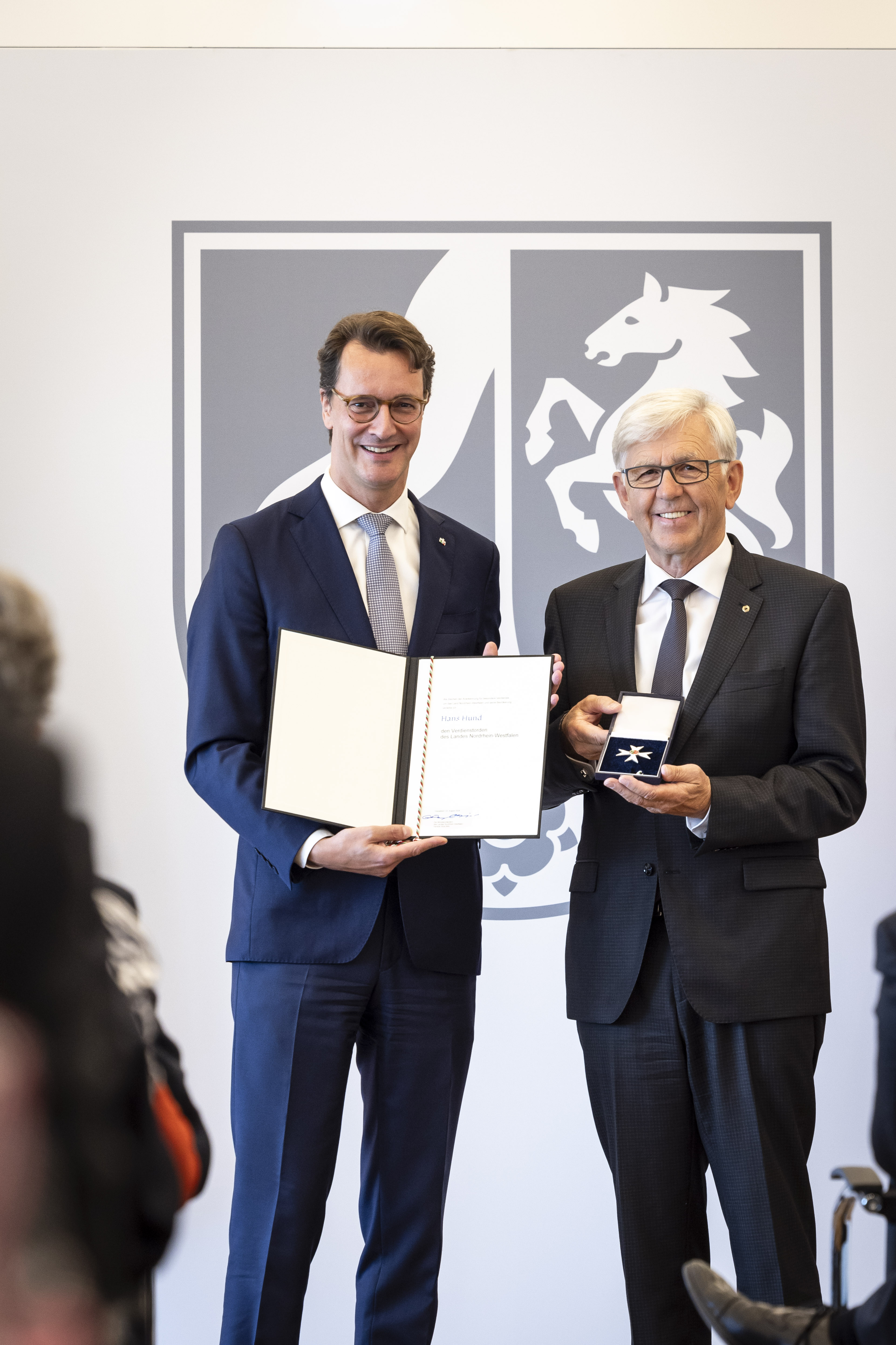 Lieber Hans Hund, die Zeit heute reicht nicht, um alle Arbeitsfelder aufzuzählen, in denen Sie sich erfolgreich engagiert haben. Aber auch so besteht kein Zweifel, lieber Hans Hund: Den Verdienstorden des Landes Nordrhein-Westfalen, den ich Ihnen heute verleihe, haben Sie sich redlich verdient.