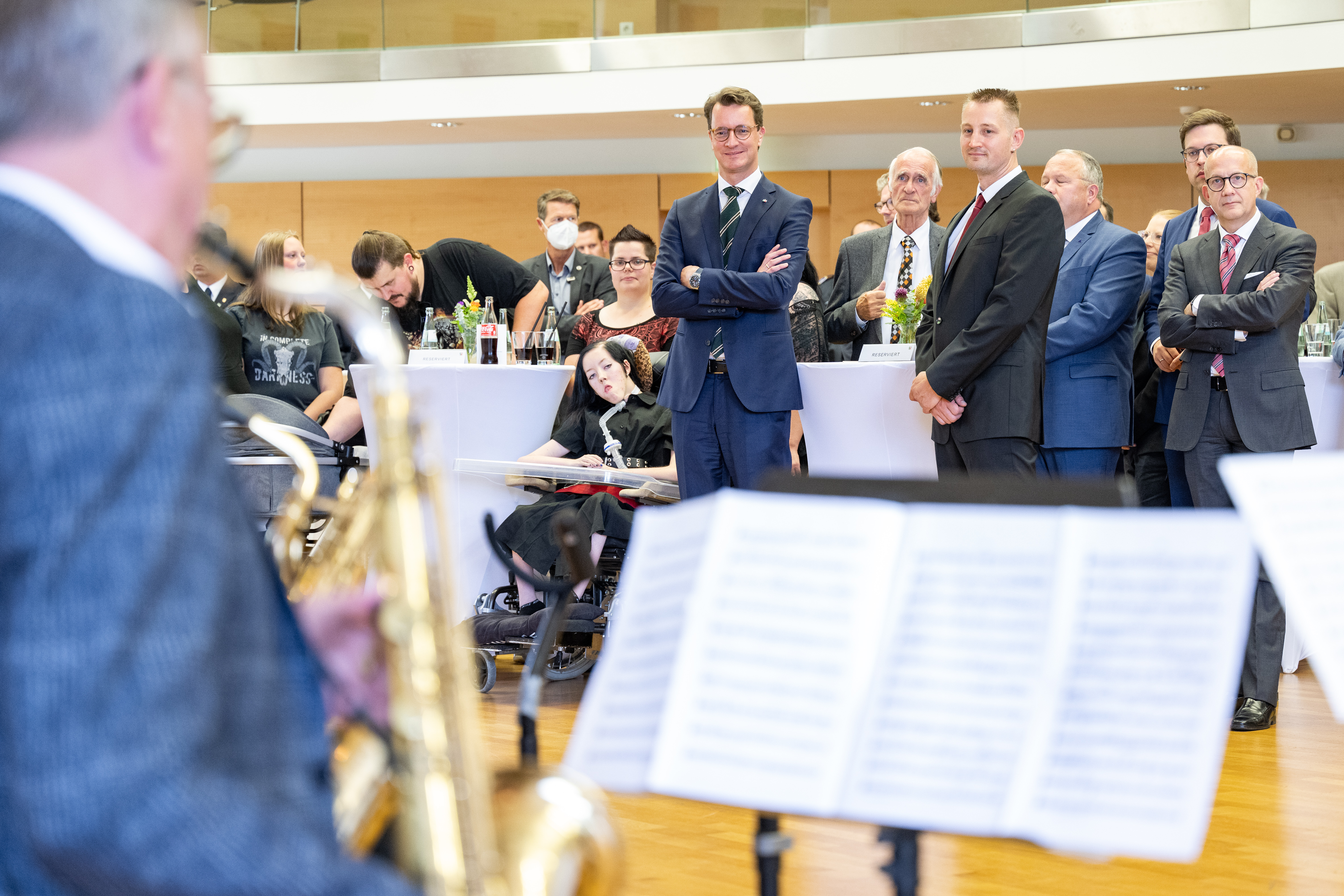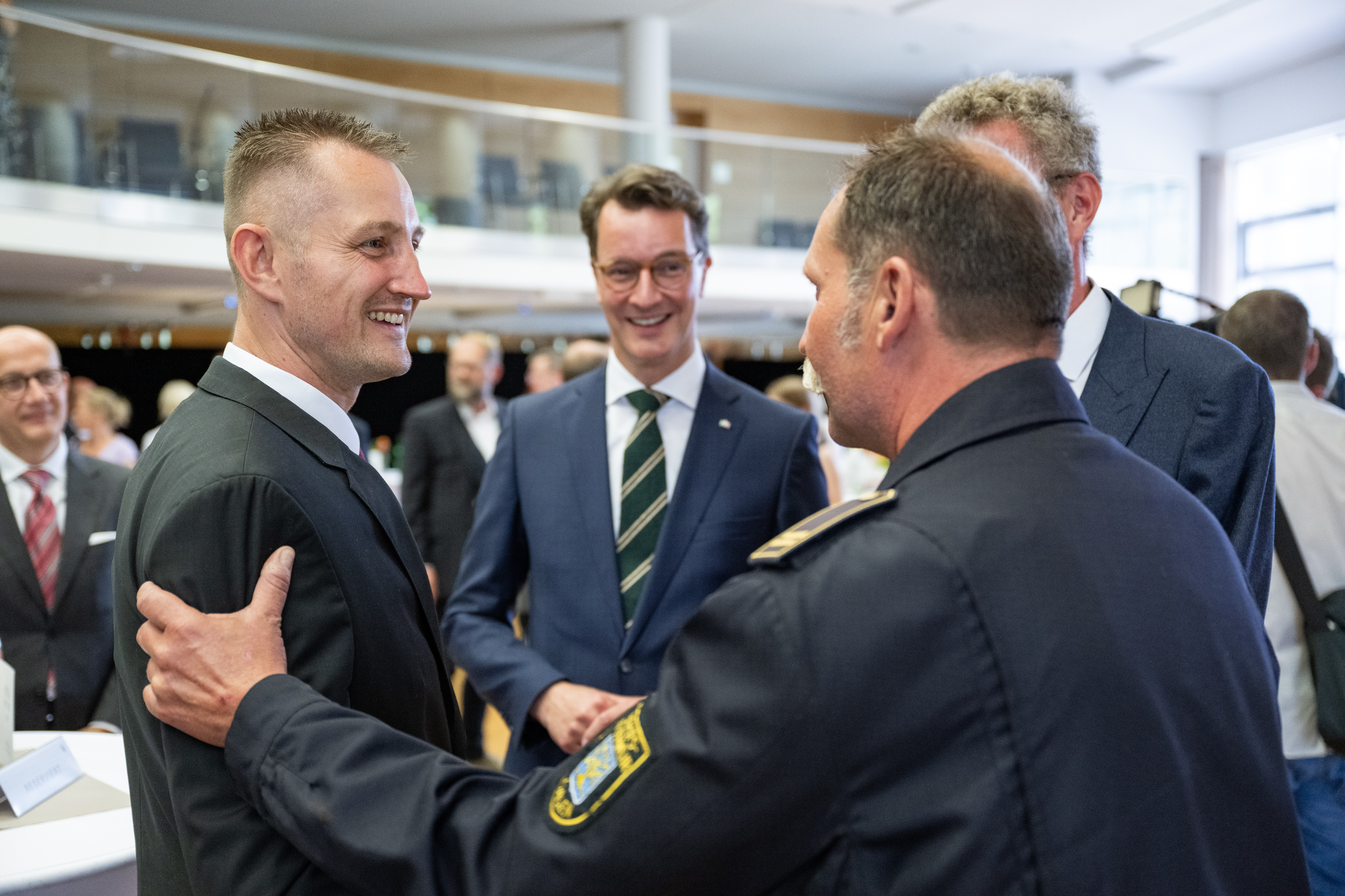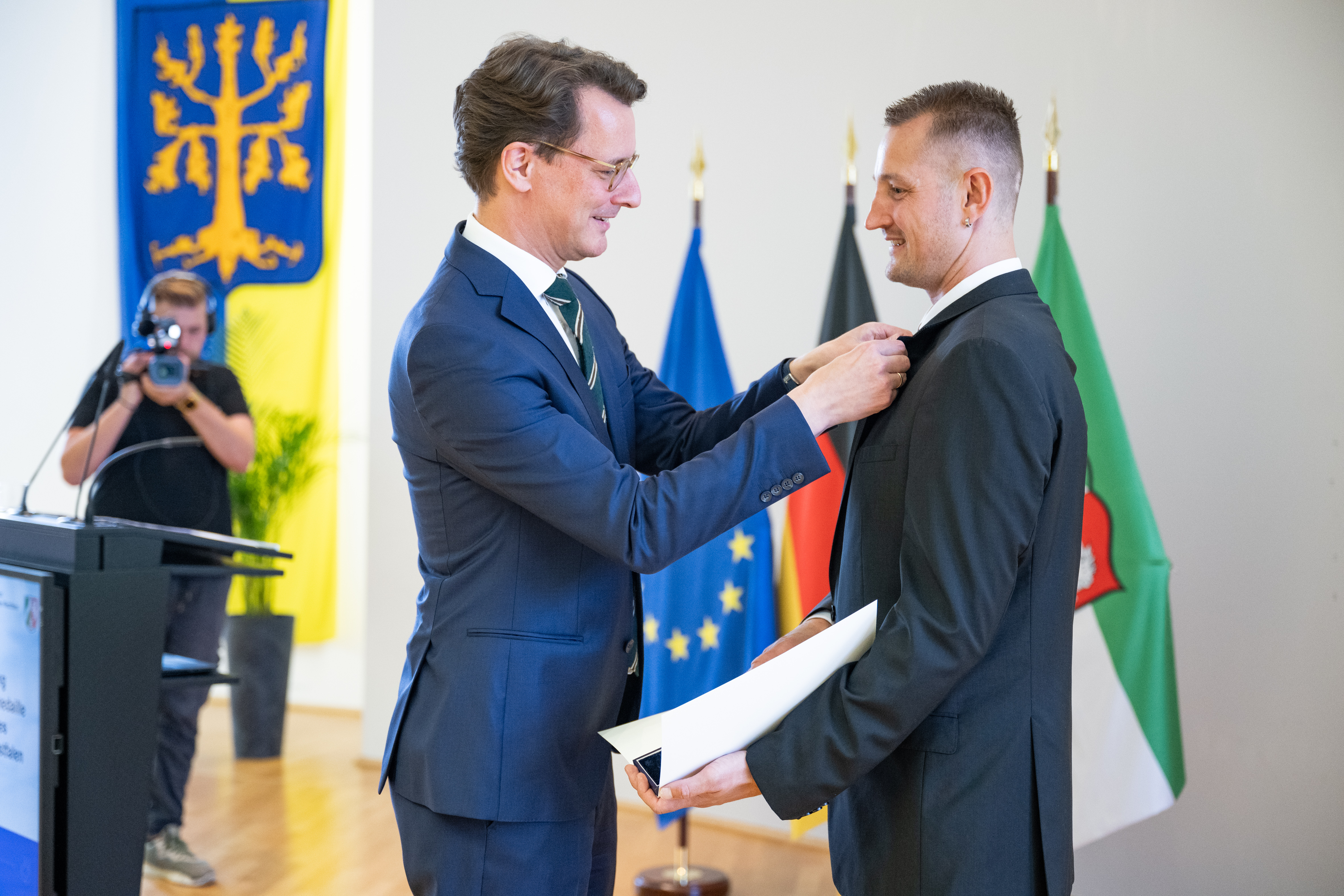 Ministerpräsident Hendrik Wüst verleiht die Rettungsmedaille des Landes Nordrhein-Westfalen an Dustin Raatz für dessen Einsatz während der Hochwasserkatastrophe am 14./15. Juli 2021