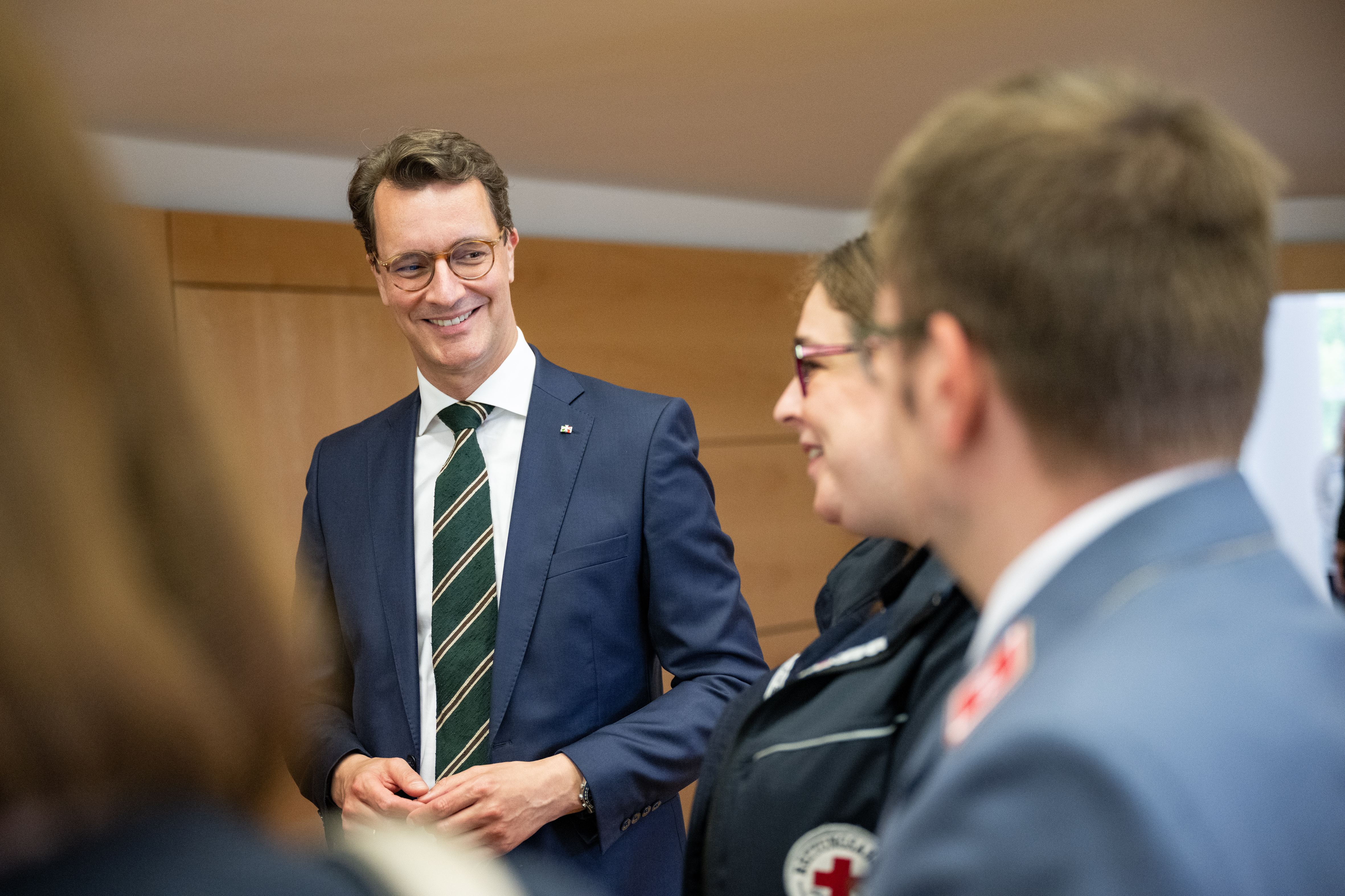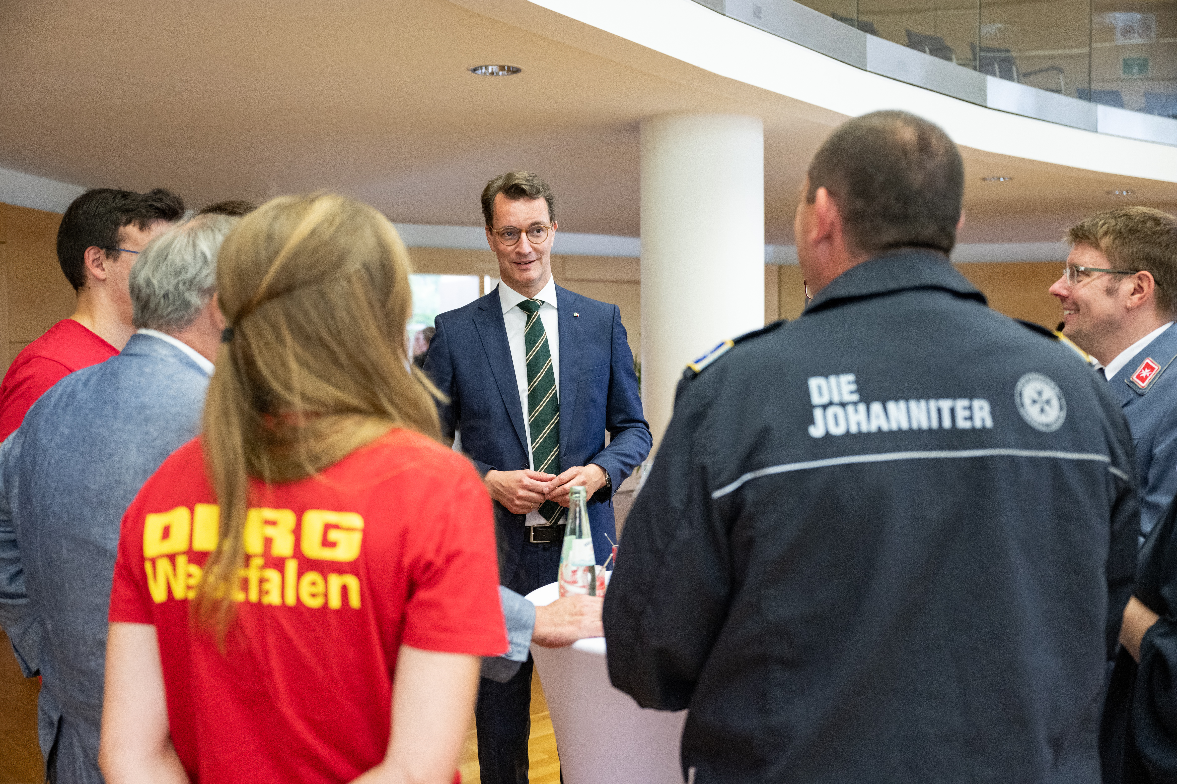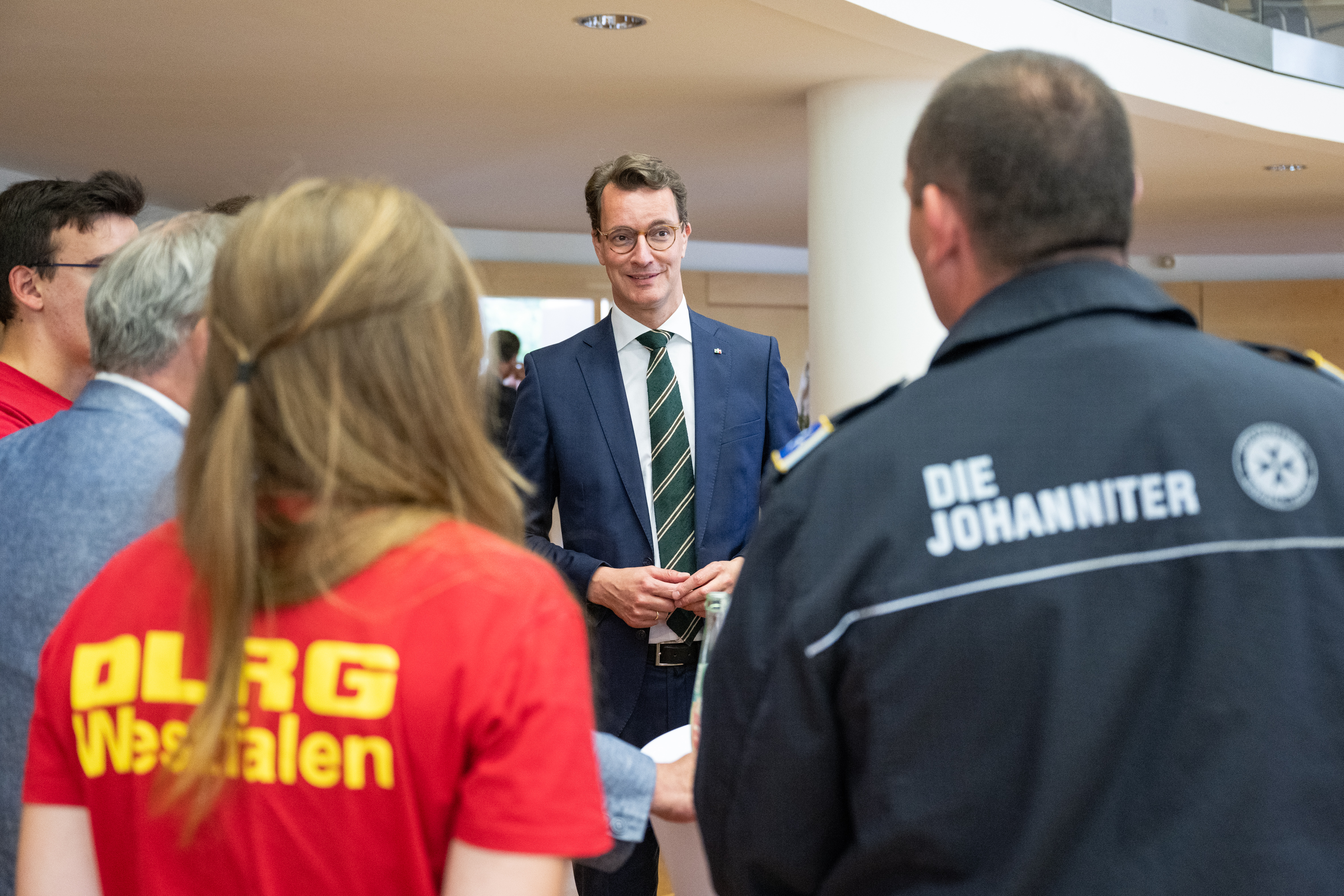 Im Rahmen einer Feierstunde im Rathaus an der Volme in Hagen erinnert der Ministerpräsident an die Hochwasserkatastrophe und die in der Folge herausragende Solidarität, Hilfs- und Einsatzbereitschaft im ganzen Land. „Die Nacht, in der das Hochwasser nach Nordrhein-Westfalen kam, war ein Einschnitt in der Geschichte unseres Landes. 49 Menschen sind in Nordrhein-Westfalen ums Leben gekommen, tausende verloren ihr Hab und Gut, viele das Dach über dem Kopf. Mitten in dieser Katastrophe sind viele Menschen über sich hinausgewachsen, um andere zu retten. Die Frauen und Männer der Freiwilligen und der Berufsfeuerwehren und des Rettungsdienstes, das Technische Hilfswerk, Hilfsorganisationen, Polizei, Soldatinnen und Soldaten sowie Freiwillige arbeiteten bis zur Erschöpfung und darüber hinaus, um anderen in Notlagen zu helfen. Es sind Menschen wie Dustin Raatz, die entschlossen und mit Mut alles darangesetzt haben, um Menschenleben zu retten. Menschen wie Dustin Raatz, den wir mit der Rettungsmedaille des Landes Nordrhein-Westfalen ehren, sind Vorbild für uns alle.“