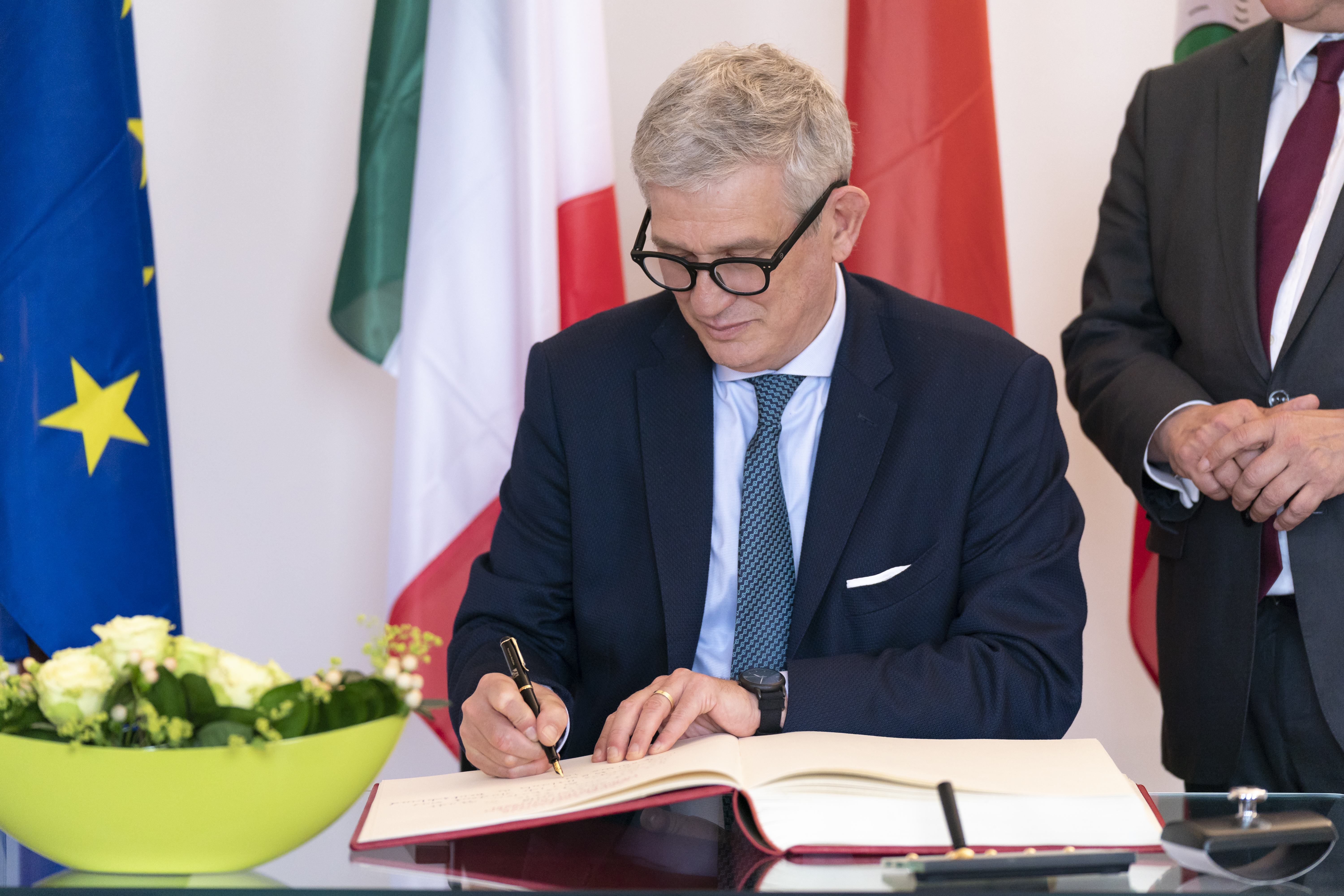 Zu Beginn des Besuchs trug sich Botschafter Benassi im Beisein des italienischen Generalkonsuls in Nordrhein-Westfalen Pierluigi Guiseppe Ferraro in das Gästebuch der Landesregierung ein. Im anschließenden Gespräch informierte sich Ministerpräsident Armin Laschet über den Stand der Regierungsbildung in Italien nach den Parlamentswahlen vom 4. März 2018: „Die Bürgerinnen und Bürger in Italien wie auch in Deutschland haben angesichts der Herausforderungen unserer Zeit das Bedürfnis nach klaren politischen Vorhaben und nach einer handlungsfähigen Regierung, die sie durchsetzt.“ Der Ministerpräsident hofft auf europäische Signale der neuen italienischen Regierung: „Wir benötigen einen Schub an Integration in Europa. In der Gemeinschaft sind wir besser für die globalen Krisen gewappnet als ein einzelner Nationalstaat. Deswegen brauchen wir mehr Europa, nicht weniger.”