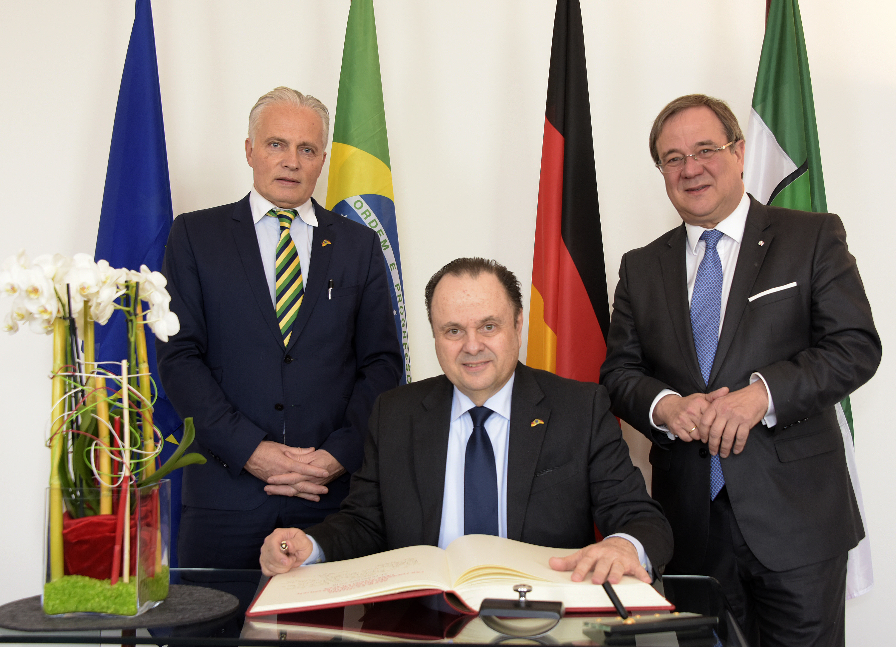 Zu Beginn des Besuchs trug sich Botschafter Vilalva ins Gästebuch der Landesregierung ein. Die Begegnung fand am Mittwoch im Landeshaus in Düsseldorf statt. Begleitet wurde Botschafter Mario Vilalva vom brasilianischen Honorarkonsul in Düsseldorf, Max Krieger.