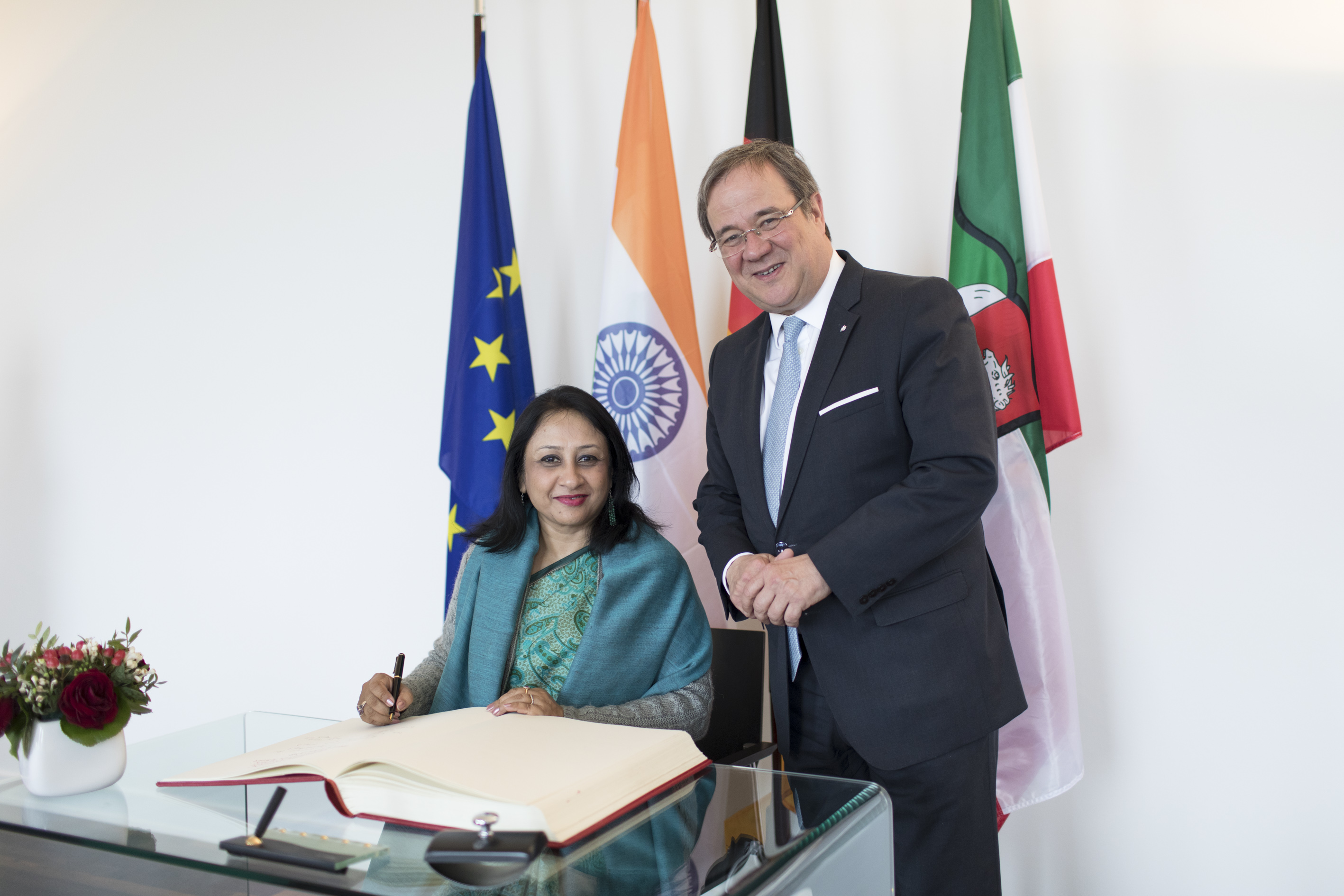 Zu Beginn des Besuchs trug sich Botschafterin Tomar in das Gästebuch der Landesregierung ein. Im anschließenden Gespräch tauschten sich Ministerpräsident Laschet und Botschafterin Tomar über die bilateralen Beziehungen zwischen Nordrhein-Westfalen und Indien aus. Im Vordergrund standen dabei die Themen wirtschaftliche Zusammenarbeit, Handel und Bildung.