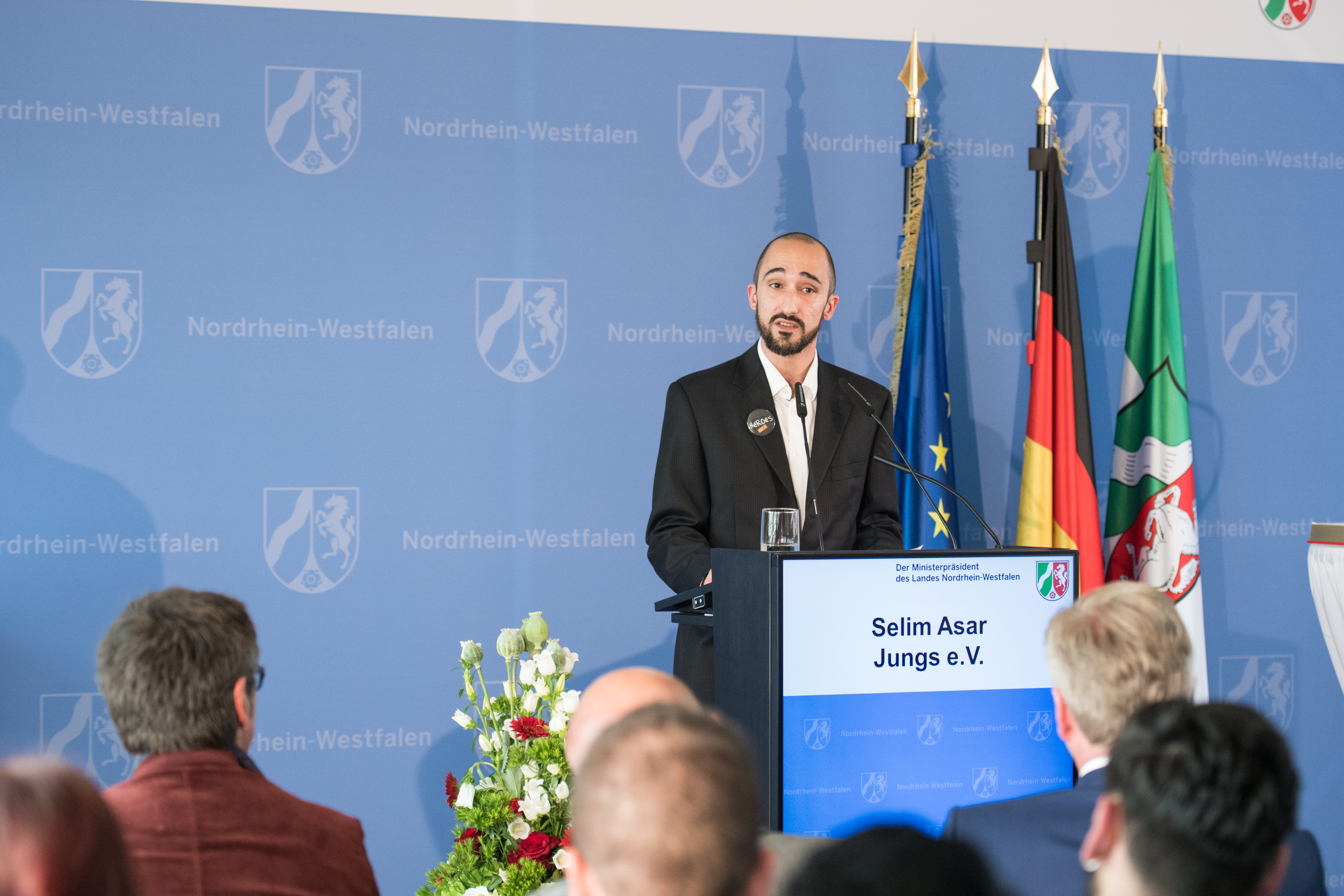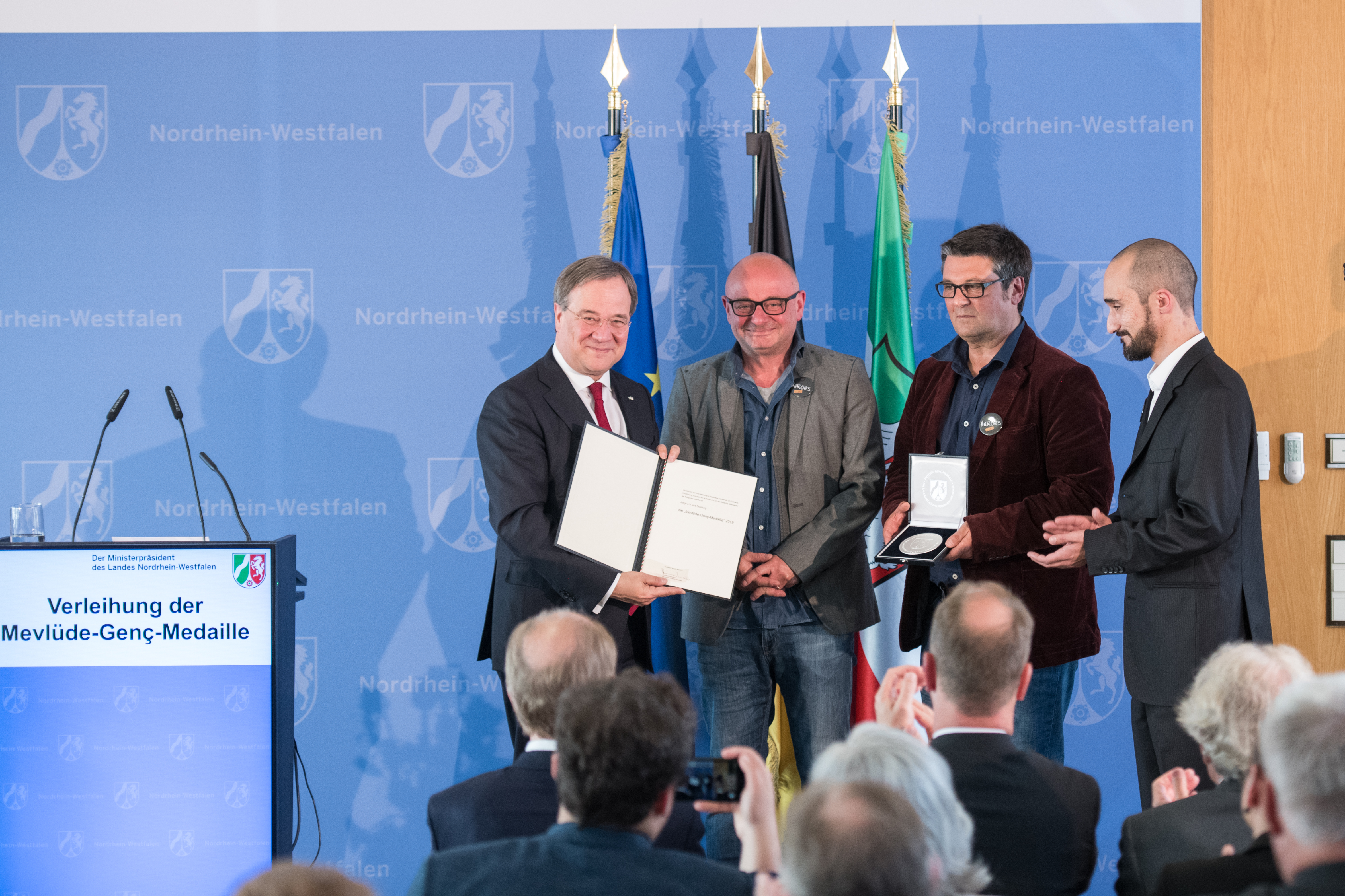 Ministerpräsident Armin Laschet hat heute (28. Mai 2019) den Duisburger Verein „Jungs e.V.“ mit der ersten Mevlüde-Genç-Medaille des Landes Nordrhein-Westfalen im Rahmen einer Feierstunde in der Staatskanzlei ausgezeichnet. Die Medaille wurde aus Anlass des 25. Jahrestags des Brandanschlags von Solingen vom Ministerpräsidenten gestiftet und ehrt Einzelpersonen oder Vereine, die sich im Sinne von Mevlüde Genç in besonderem Maße verdient machen um Toleranz, Versöhnung zwischen den Kulturen und um das friedliche Miteinander der Religionen.