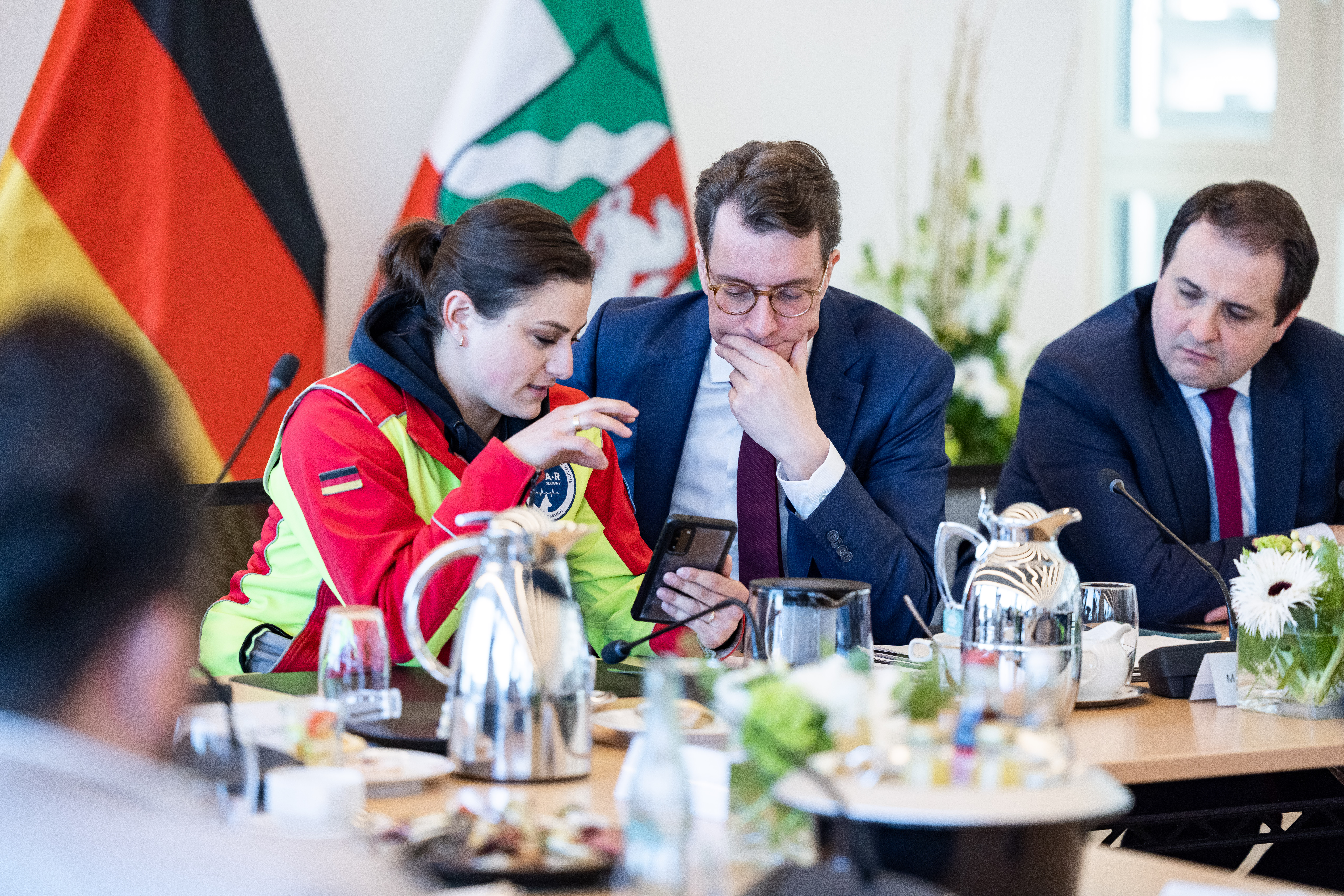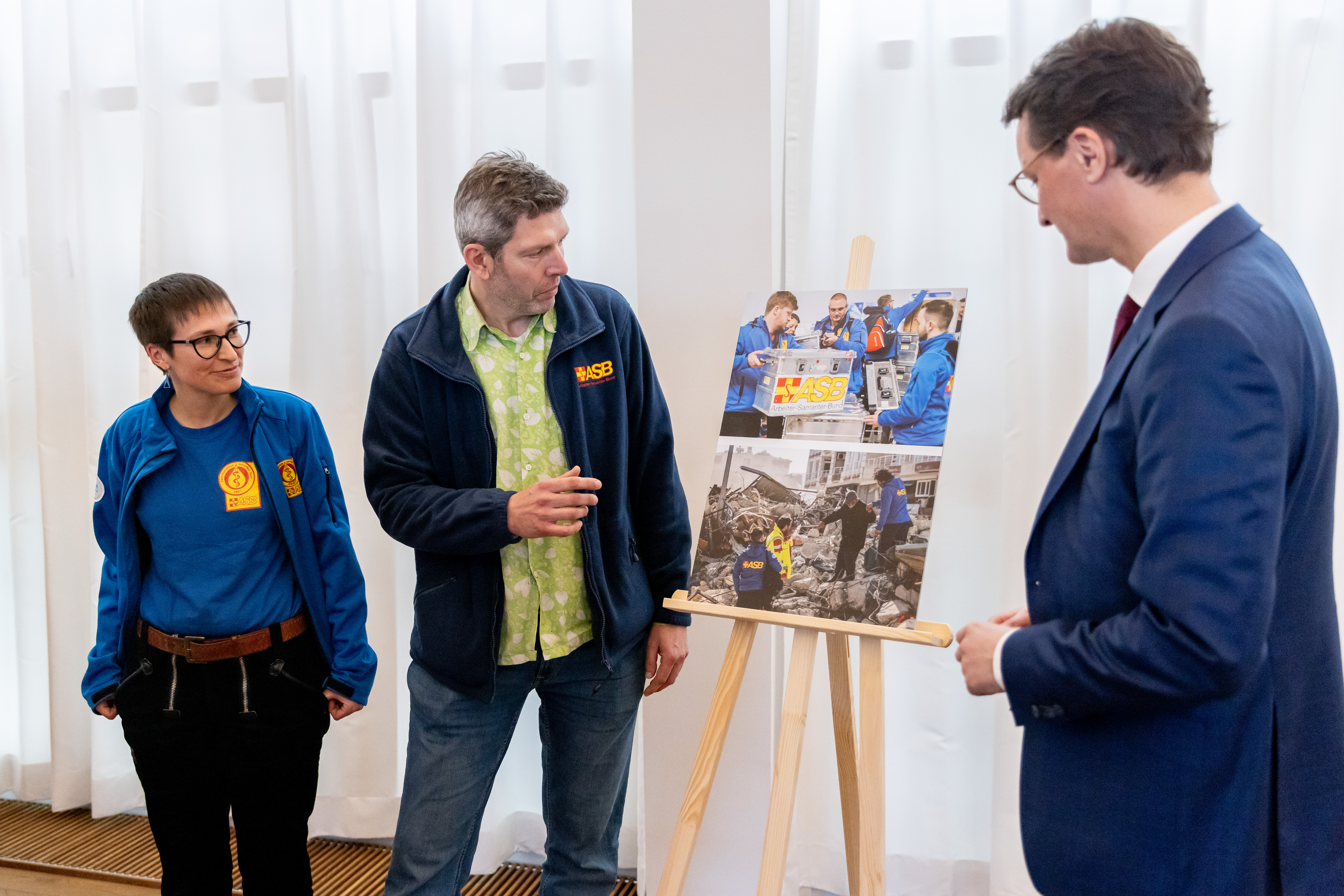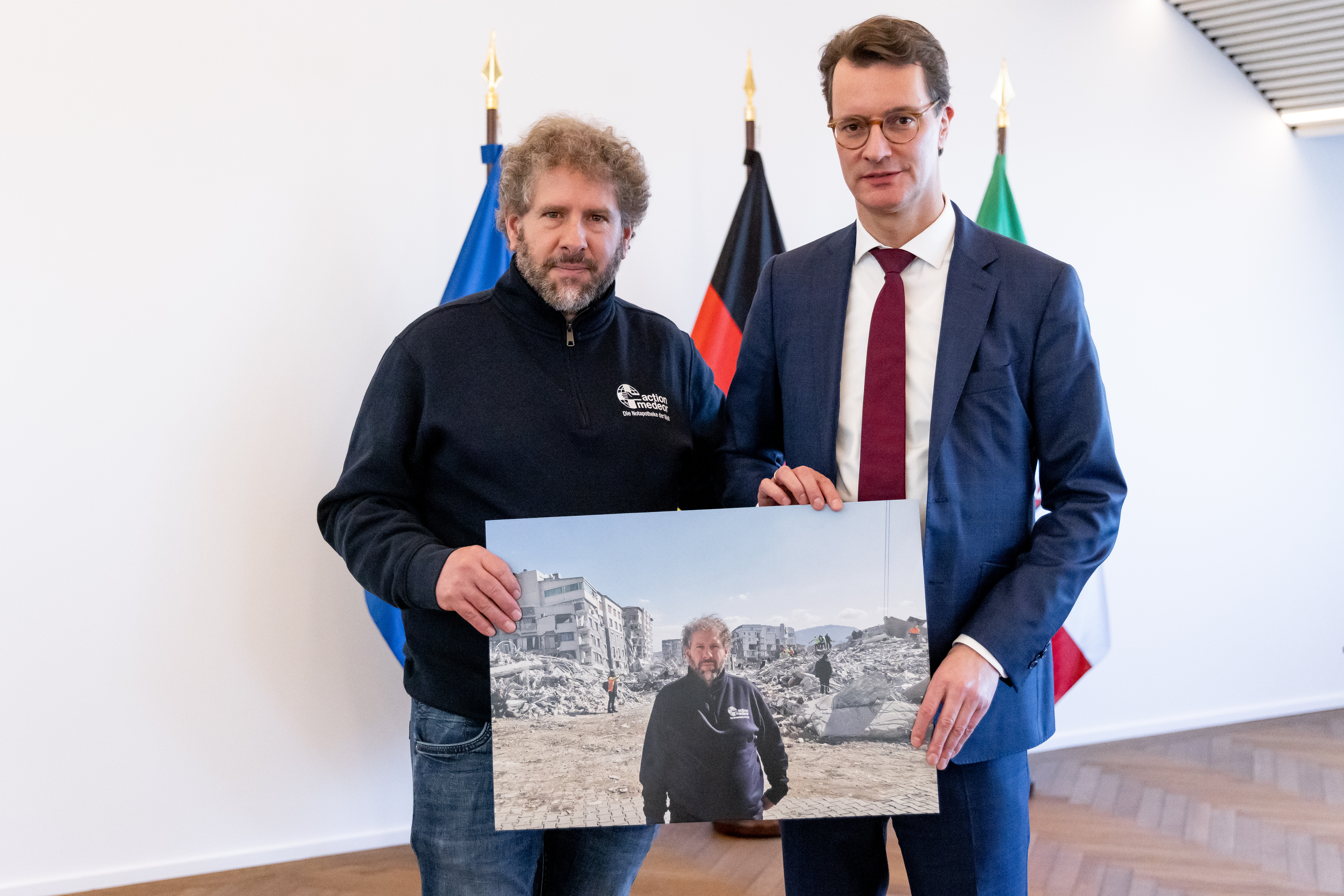 Ministerpräsident Hendrik Wüst hat sich am Donnerstag, 2. März 2023, im Landeshaus mit Helfern aus Nordrhein-Westfalen ausgetauscht, die nach den schweren Erdbeben in der Türkei und in Syrien vor Ort bei der Rettung unterstützt haben. Hilfskräfte von action medeor, den Maltesern, I.S.A.R., dem Bundesverband Rettungshunde, des Arbeiter-Samariter-Bunds und des Technischen Hilfswerks waren bereits in den ersten Tagen nach den schweren Erdbeben in die betroffenen Gebiete gereist. Auch von REWE und dem Rheinland Klinikum Neuss haben sich Freiwillige auf den Weg gemacht, um Opfer zu versorgen. An dem Gespräch nahm auch Nathanael Liminski, Minister für Bundes- und Europaangelegenheiten, Internationales sowie Medien und Chef der Staatskanzlei, teil.