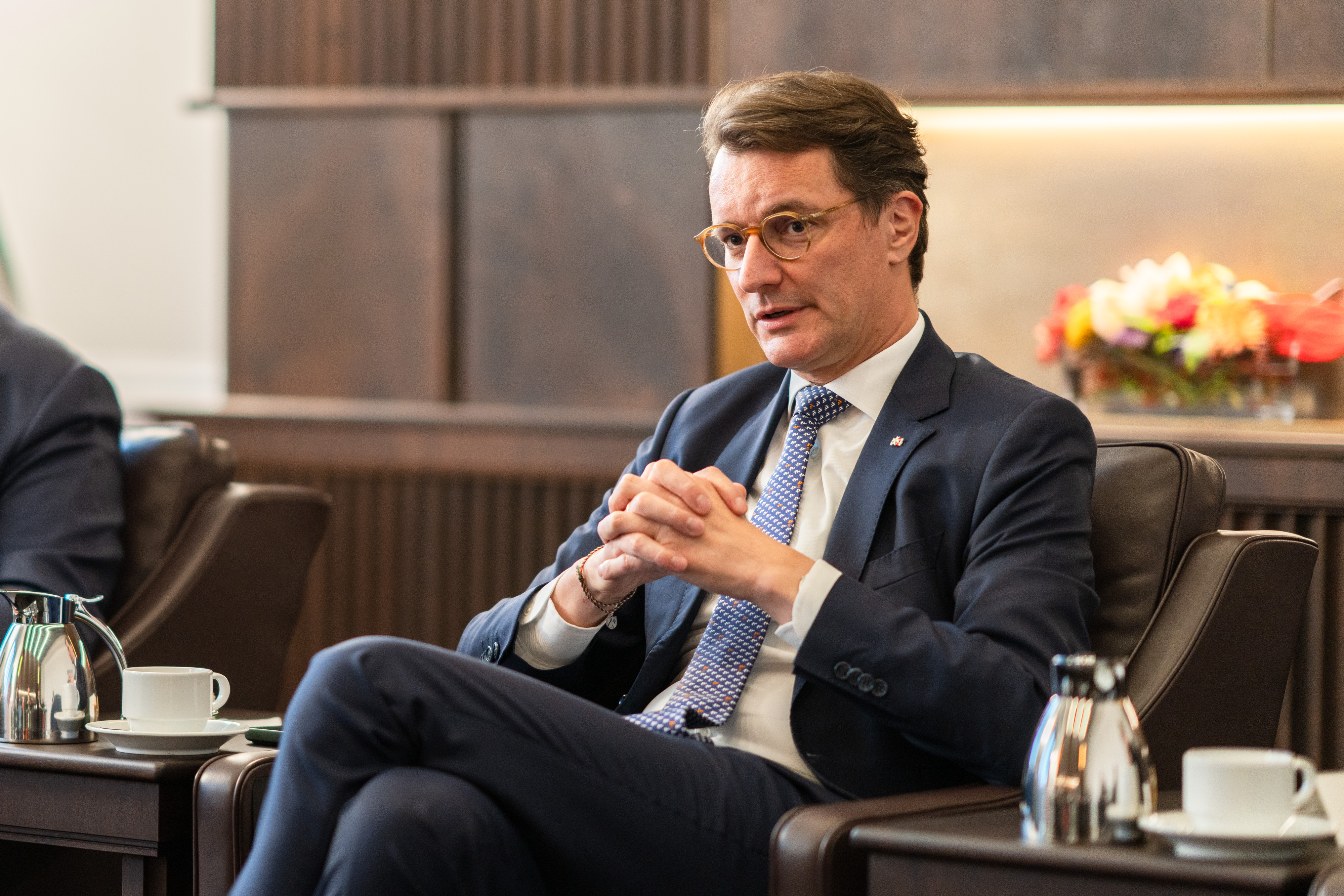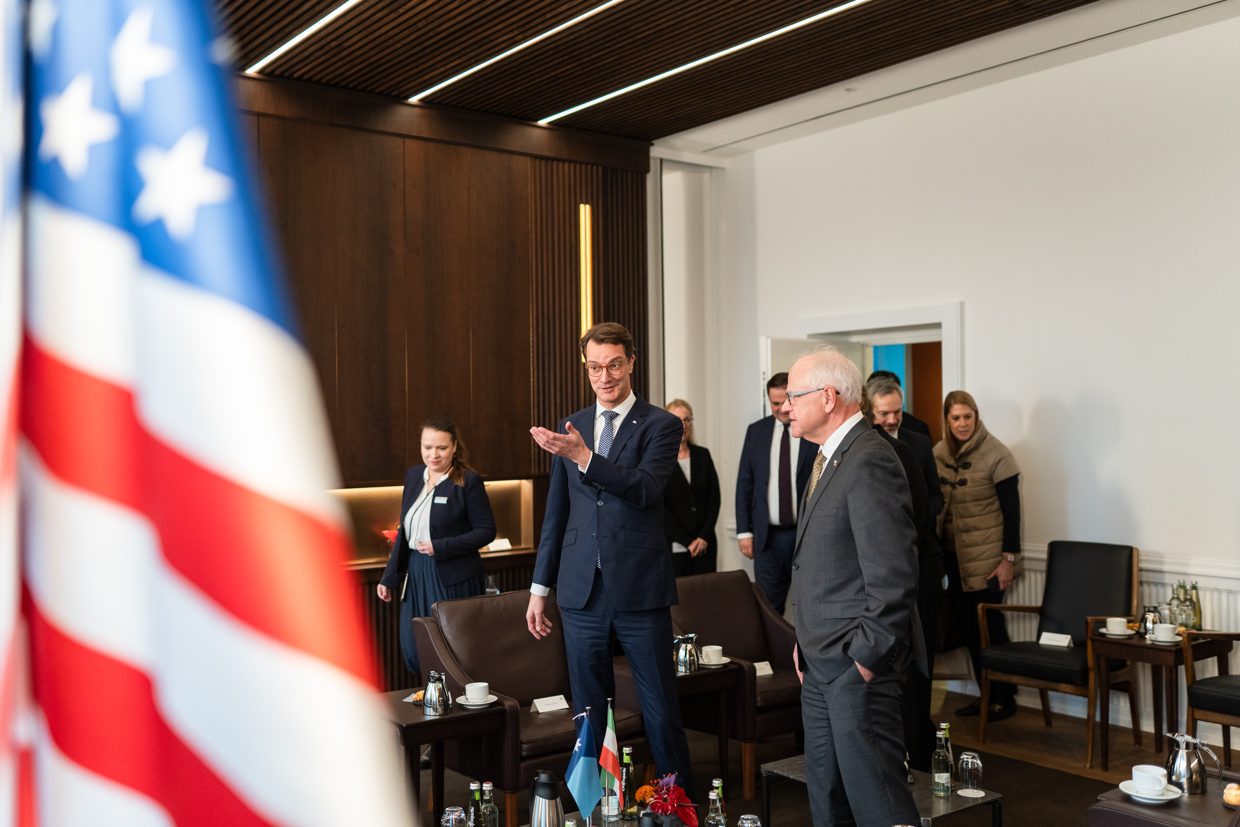 Ministerpräsident Hendrik Wüst hat am Mittwoch, 19. November 2025, den Gouverneur von Minnesota Tim Walz in der Staatskanzlei in Düsseldorf empfangen. Themen des Gesprächs waren die Zusammenarbeit zwischen Minnesota und Nordrhein-Westfalen, die Rolle subnationaler Akteure sowie der Austausch von Erkenntnissen aus der Energiewende. Die stellvertretende Ministerpräsidentin und Wirtschaftsministerin Mona Neubaur und der Minister für Internationales und Chef der Staatskanzlei Nathanael Liminski haben ebenfalls an dem Gespräch teilgenommen.