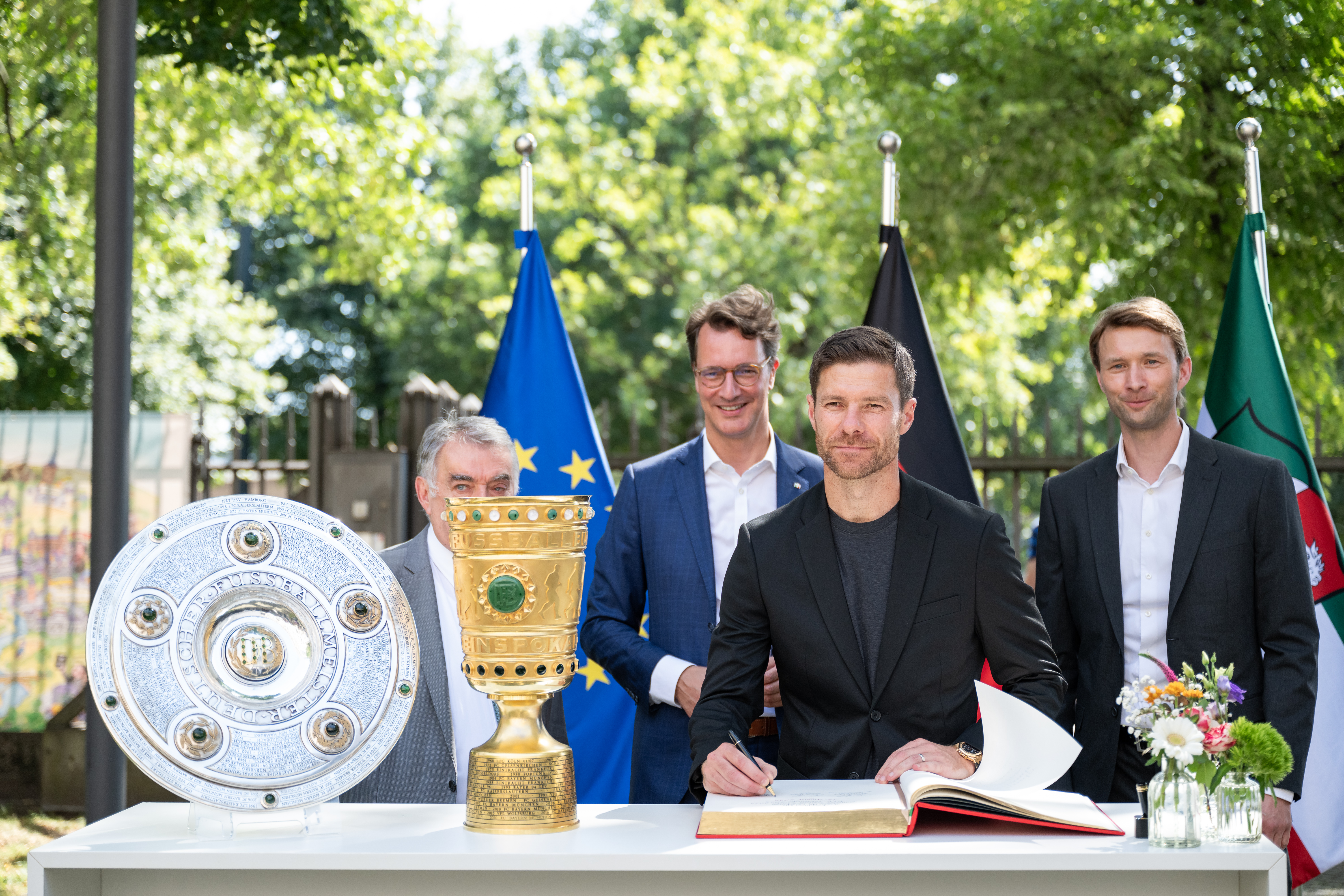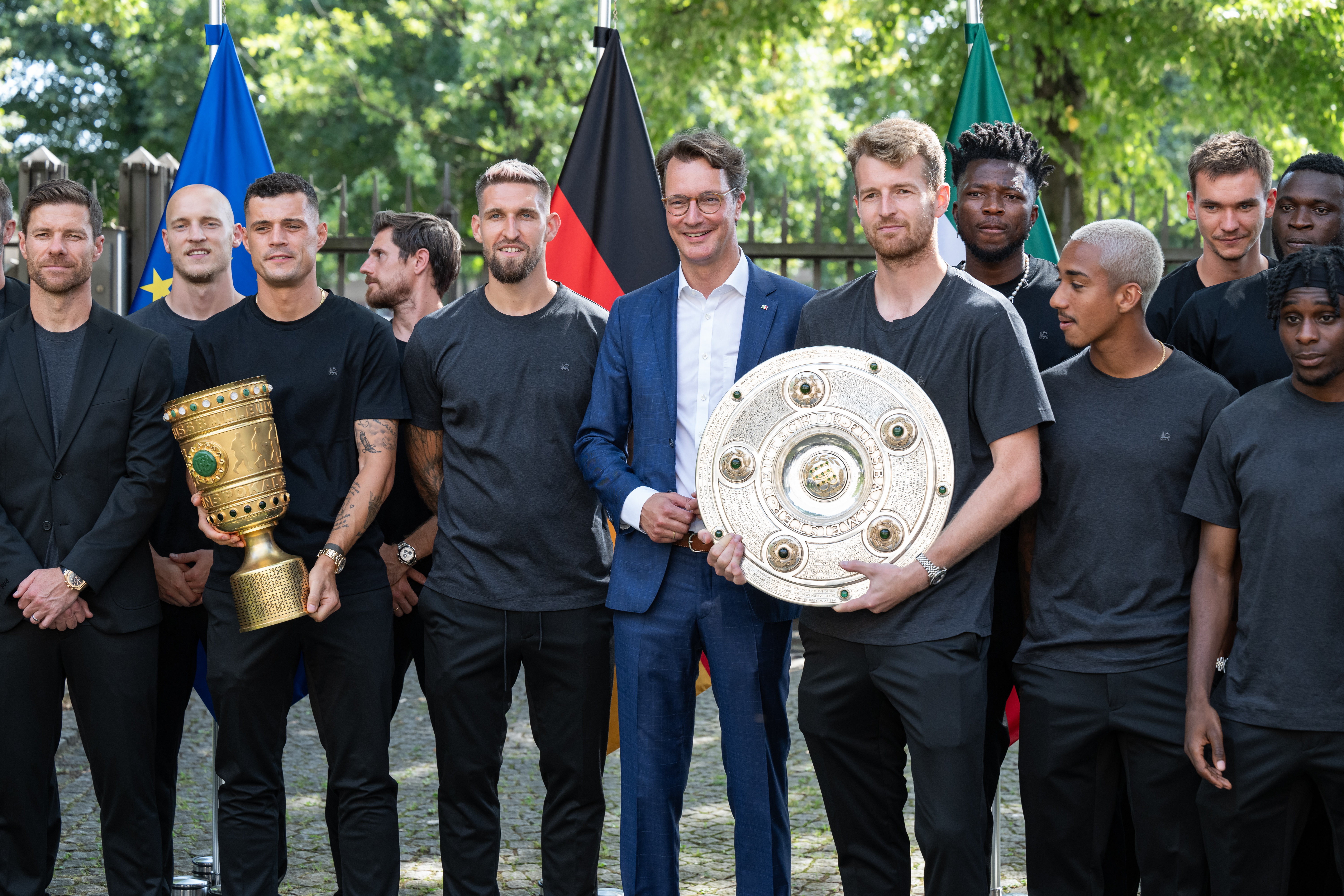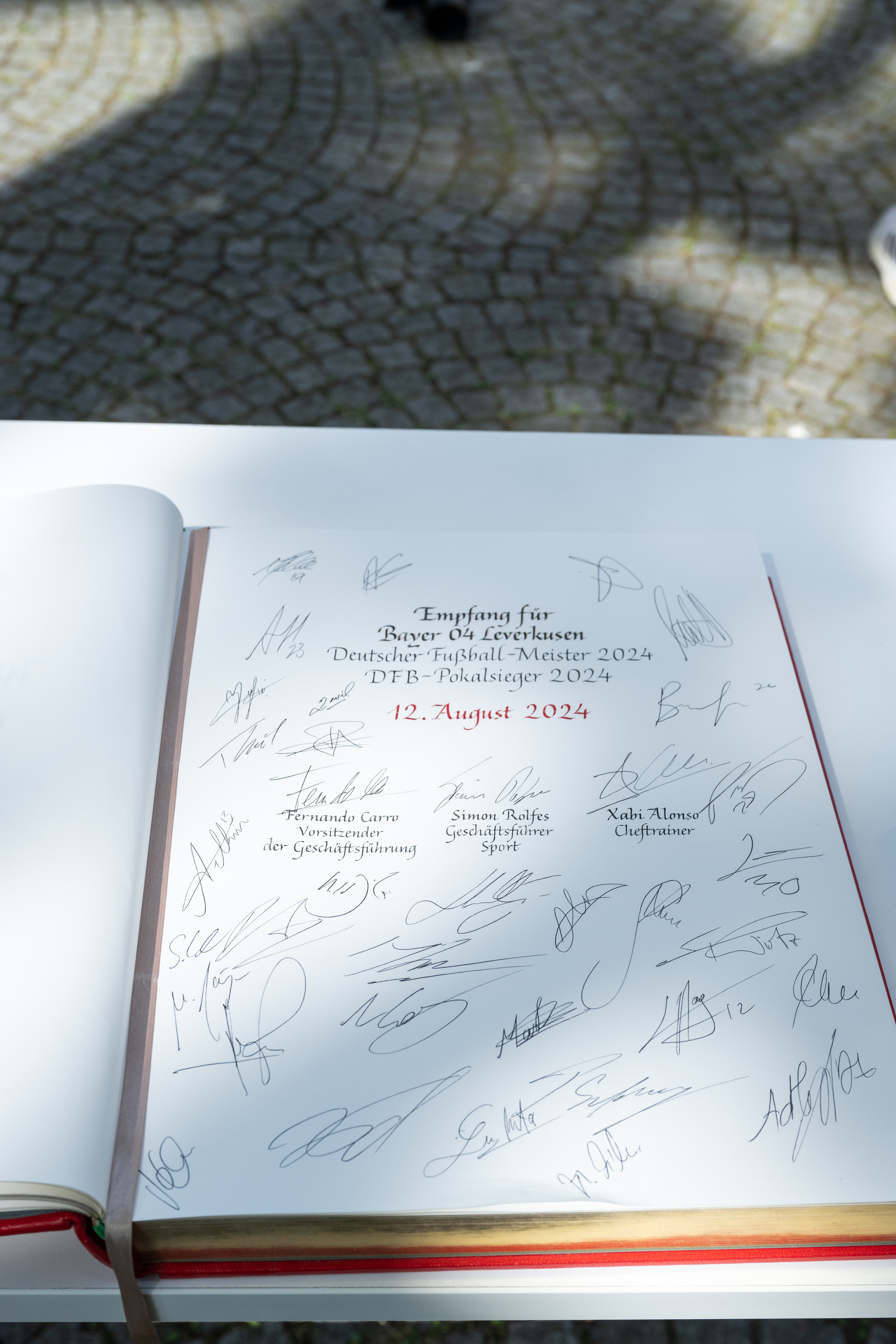 Bayer 04 Leverkusen hat in der vergangenen Saison Außergewöhnliches erreicht: Mit dem Gewinn der Deutschen Meisterschaft und des DFB-Pokals sicherte sich die Mannschaft das erste „Double“ der Vereinsgeschichte. In Anerkennung dieser herausragenden sportlichen Leistung empfing am Montag, 12. August 2024, Ministerpräsident Hendrik Wüst die Mannschaft in der Staatskanzlei. Im Rahmen des Empfangs trugen sich die Spieler zudem in das Goldene Buch des Landes Nordrhein-Westfalen ein – eine besondere Ehrung für ihren historischen Erfolg.