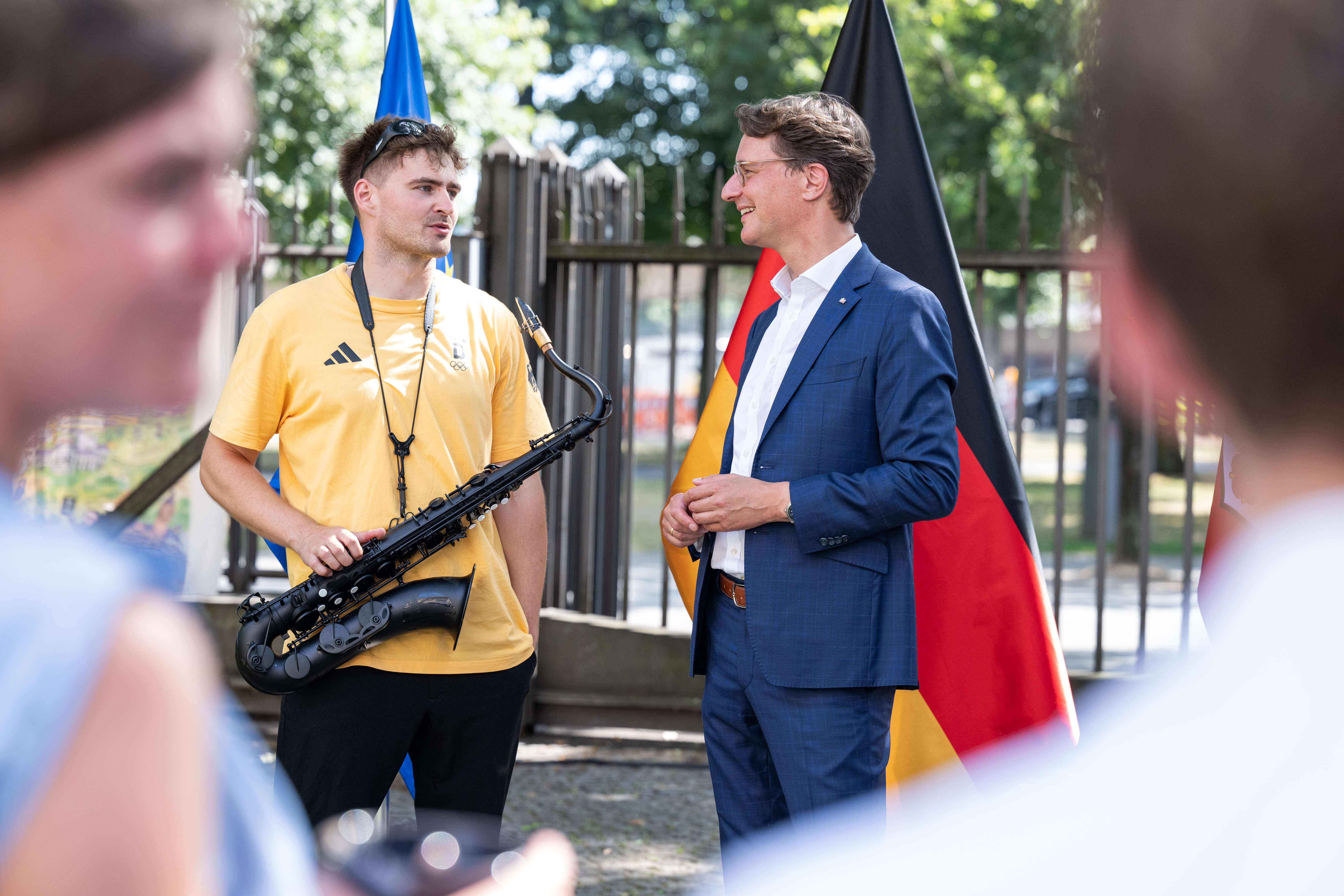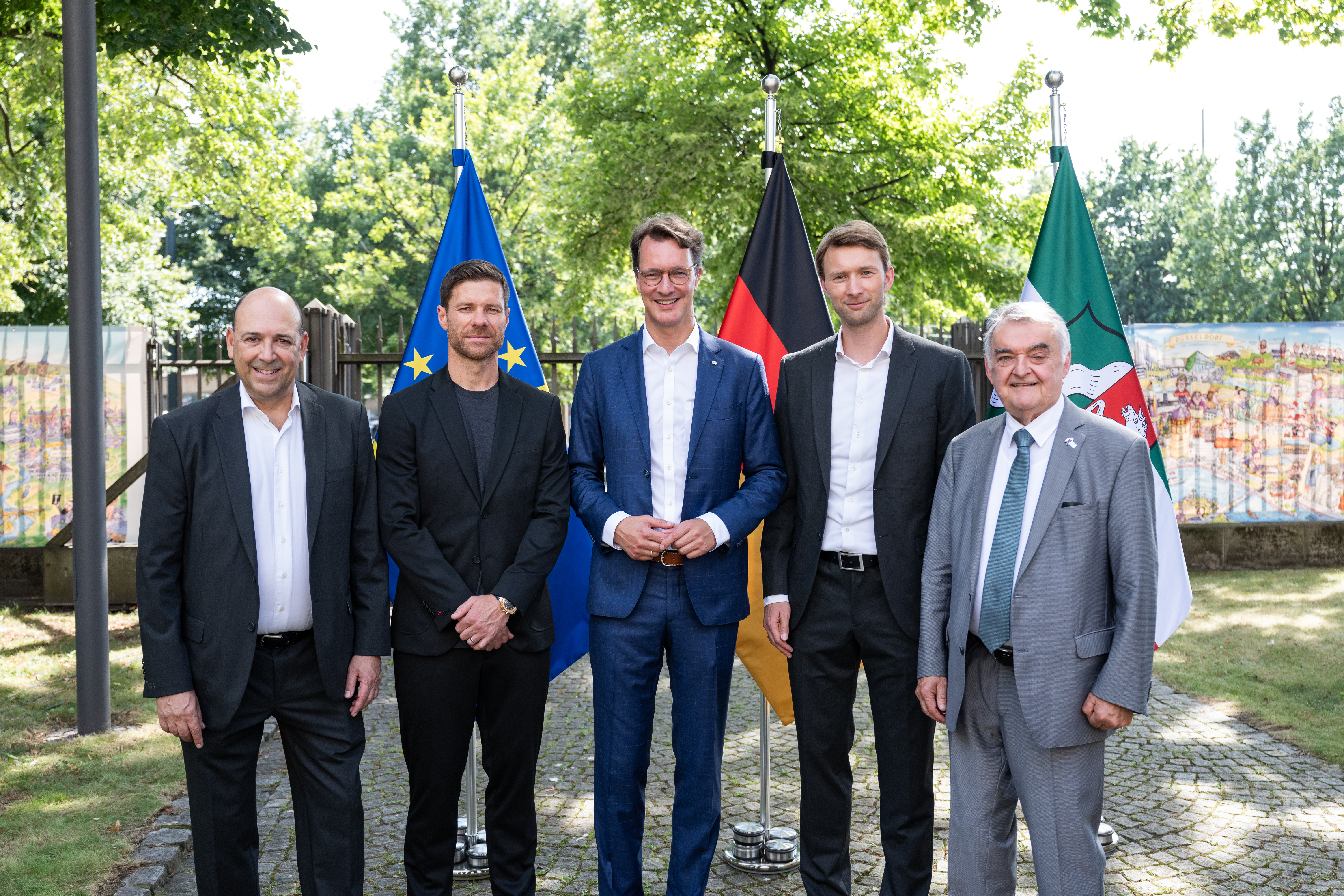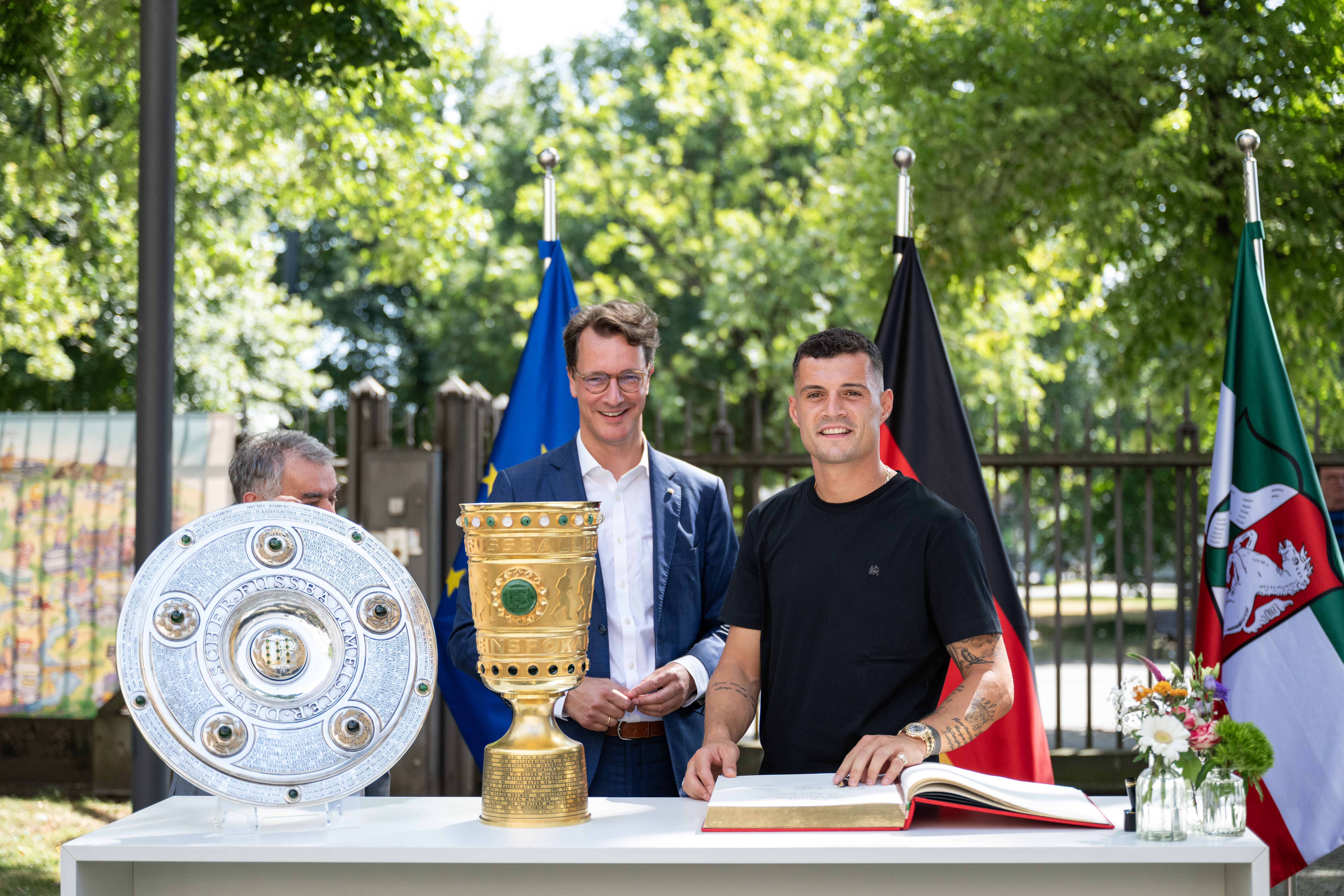 Bayer 04 Leverkusen hat in der vergangenen Saison Außergewöhnliches erreicht: Mit dem Gewinn der Deutschen Meisterschaft und des DFB-Pokals sicherte sich die Mannschaft das erste „Double“ der Vereinsgeschichte. In Anerkennung dieser herausragenden sportlichen Leistung empfing am Montag, 12. August 2024, Ministerpräsident Hendrik Wüst die Mannschaft in der Staatskanzlei. Im Rahmen des Empfangs trugen sich die Spieler zudem in das Goldene Buch des Landes Nordrhein-Westfalen ein – eine besondere Ehrung für ihren historischen Erfolg.